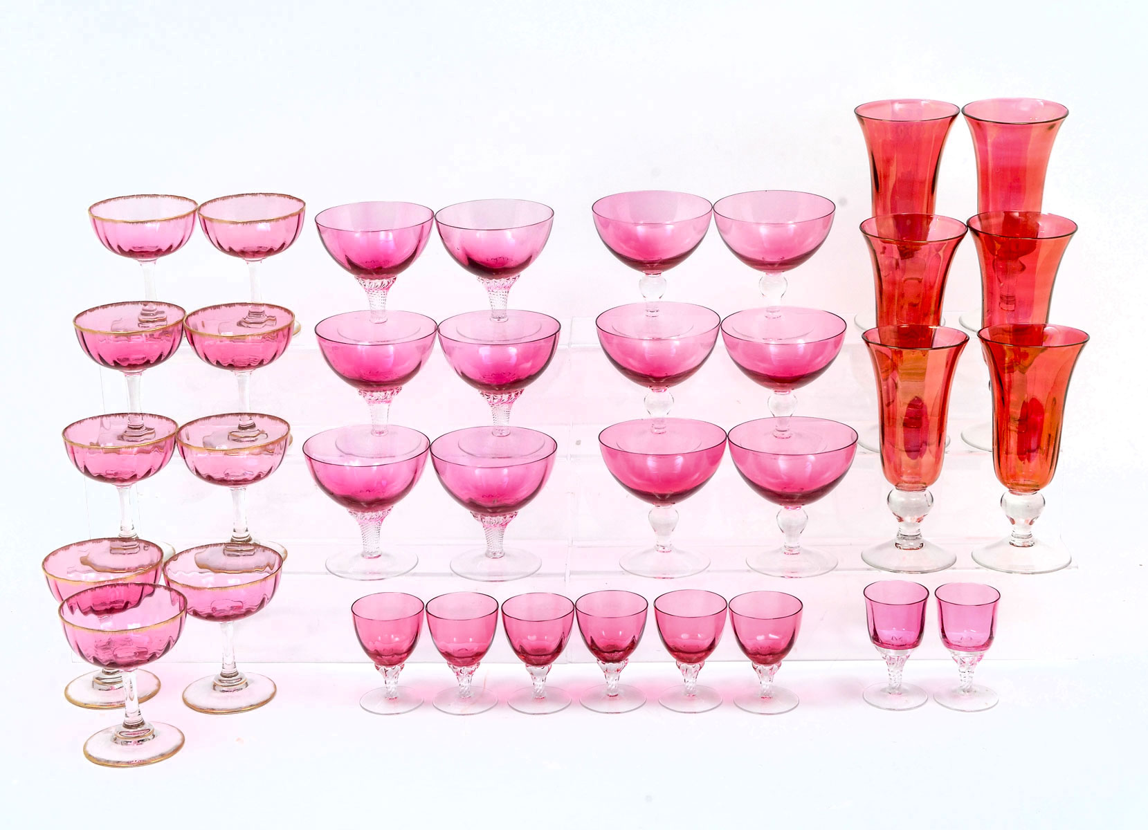 80 PC. STEUBEN? CRANBERRY GLASS COLLECTION: Comprising 4 different designed Steuben? glass designs of Cranberry glass stemware and 2 waste bowls. Largest Approx. 8'' h x 3.75'' w.