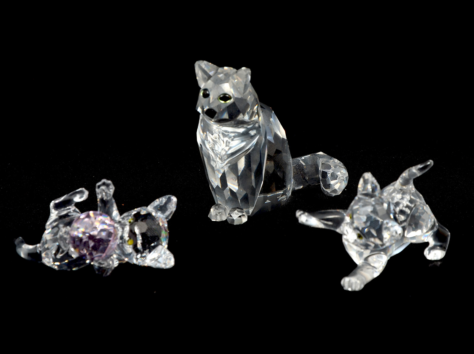 13 PC. COLLECTION OF SWAROVSKI FIGURES: Comprising; 2- Ducks, one resting on a crystal base, 2- Cats playing with a pink crystal ball, 1- Cat with black eyes, 1- Squirrel, 1- bird grouping on a branch, 1- Tall Giraffe, 1- Sitting bear, 1- Jaguar, 1- Panther, 1- Large cat with a green collar, & 1- Dragon that rests on a black footed base. Largest Approx. 5.5'' h x 3.75'' l x 1'' w.