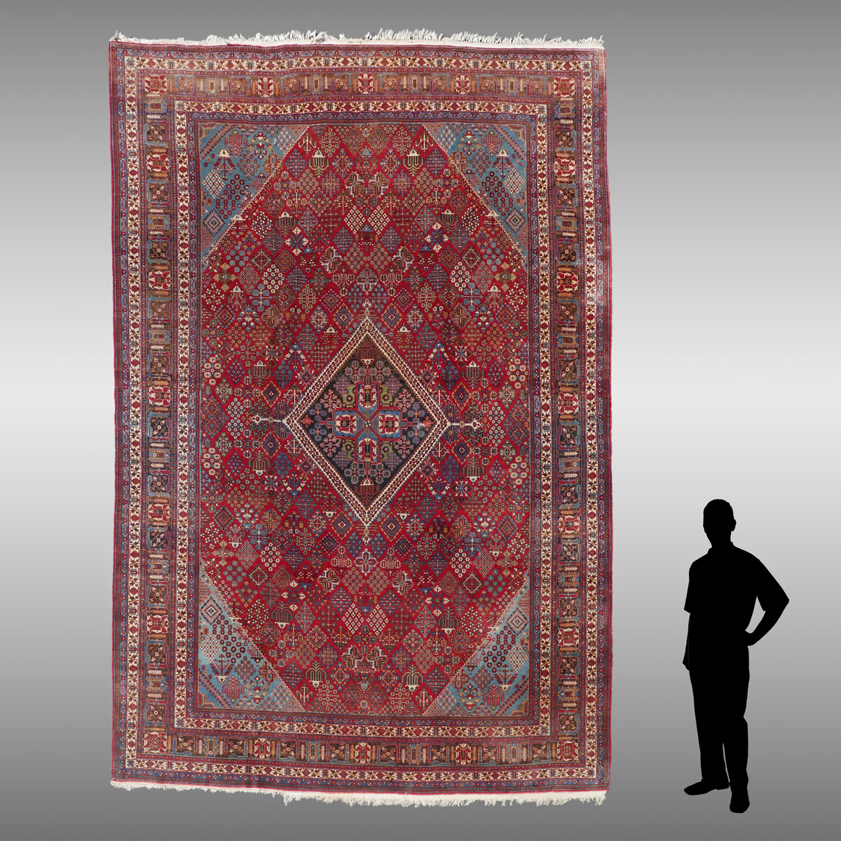 SEMI-ANTIQUE PERSIAN JOSHEGAN HAND KNOTTED WOOL RUG, 10' X 13'9'': This interesting rug has a traditional design with an overall repeating pattern of various diamond shaped motifs in rows over the red field and the pretty blue corners as well as in the diamond shaped central medallion.