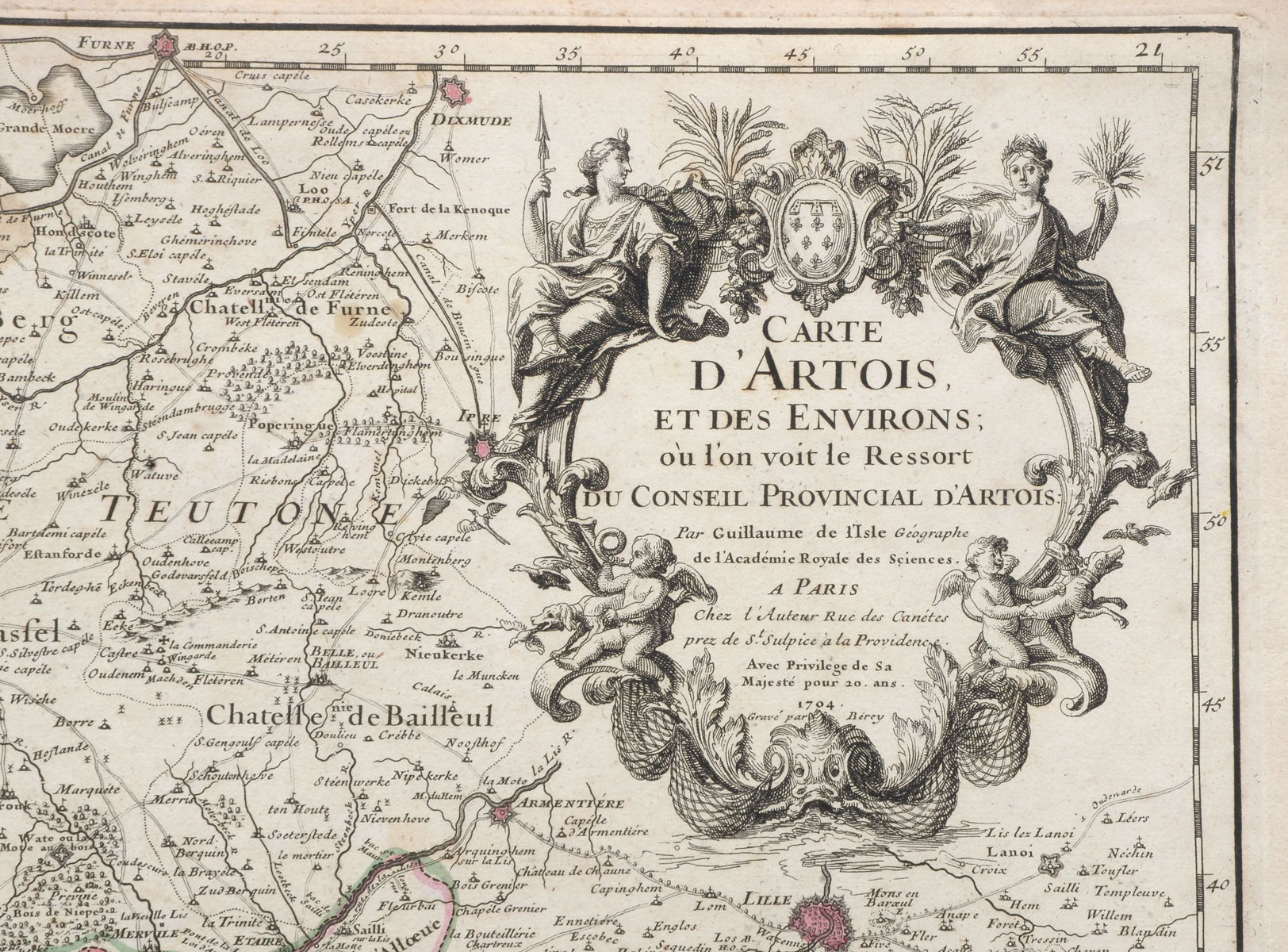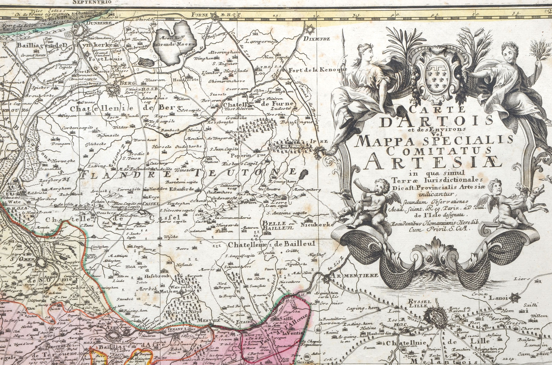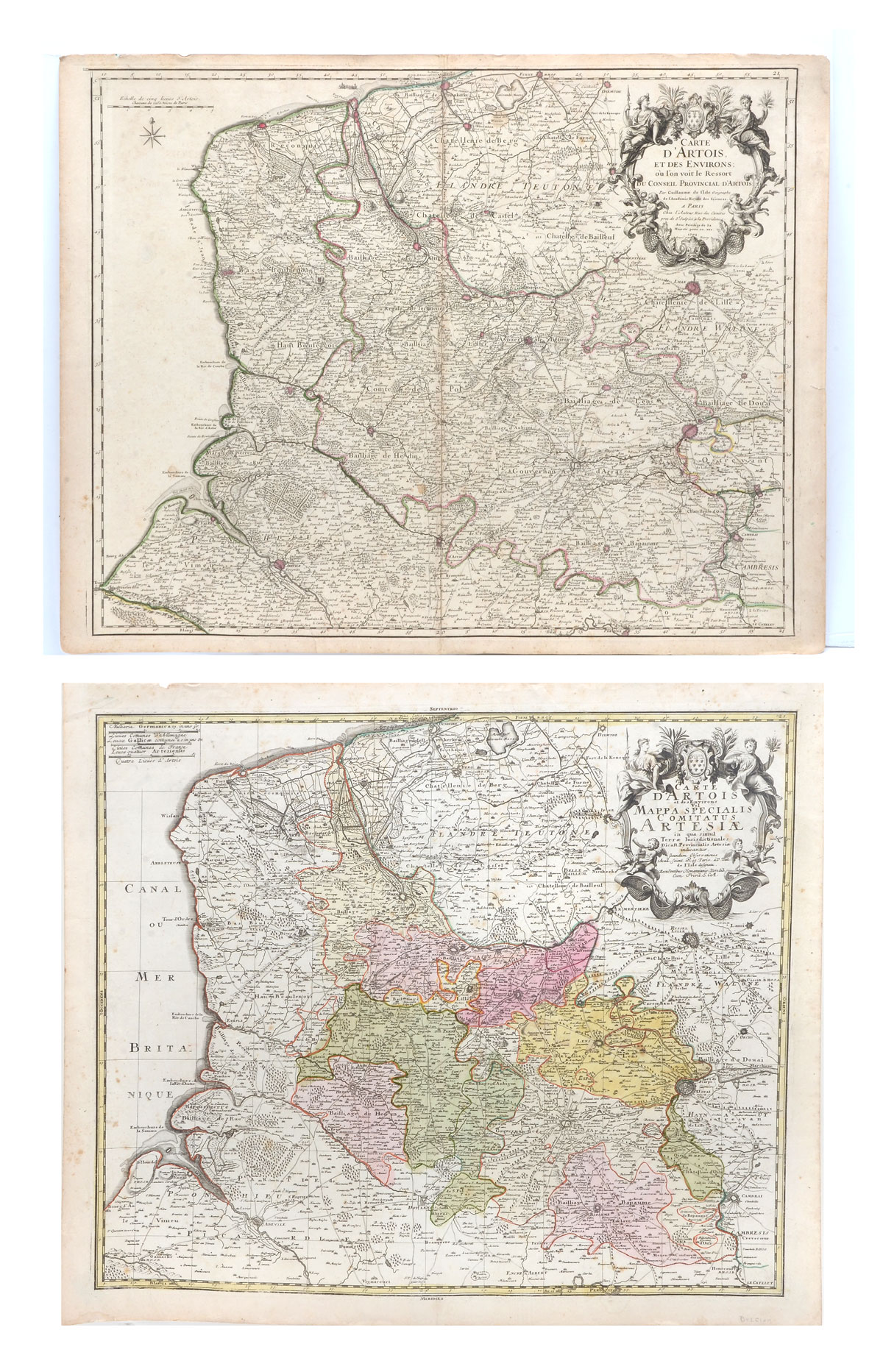 2- OLD CARTE D'ARTOIS MAPS: Pair of copper engraved atlas maps of the Artois France from Dunkirk Belgium to Abbeville France in the west, to Lille, Doue and Cambrai in the East. Made by, Homann, Johann Baptist; Erben von. Nuremberg Germany. One map is dated 1704. 1- Approx. 21'' h x 24.25'' w. 1- Approx. 20.25'' h x 26.25'' w.