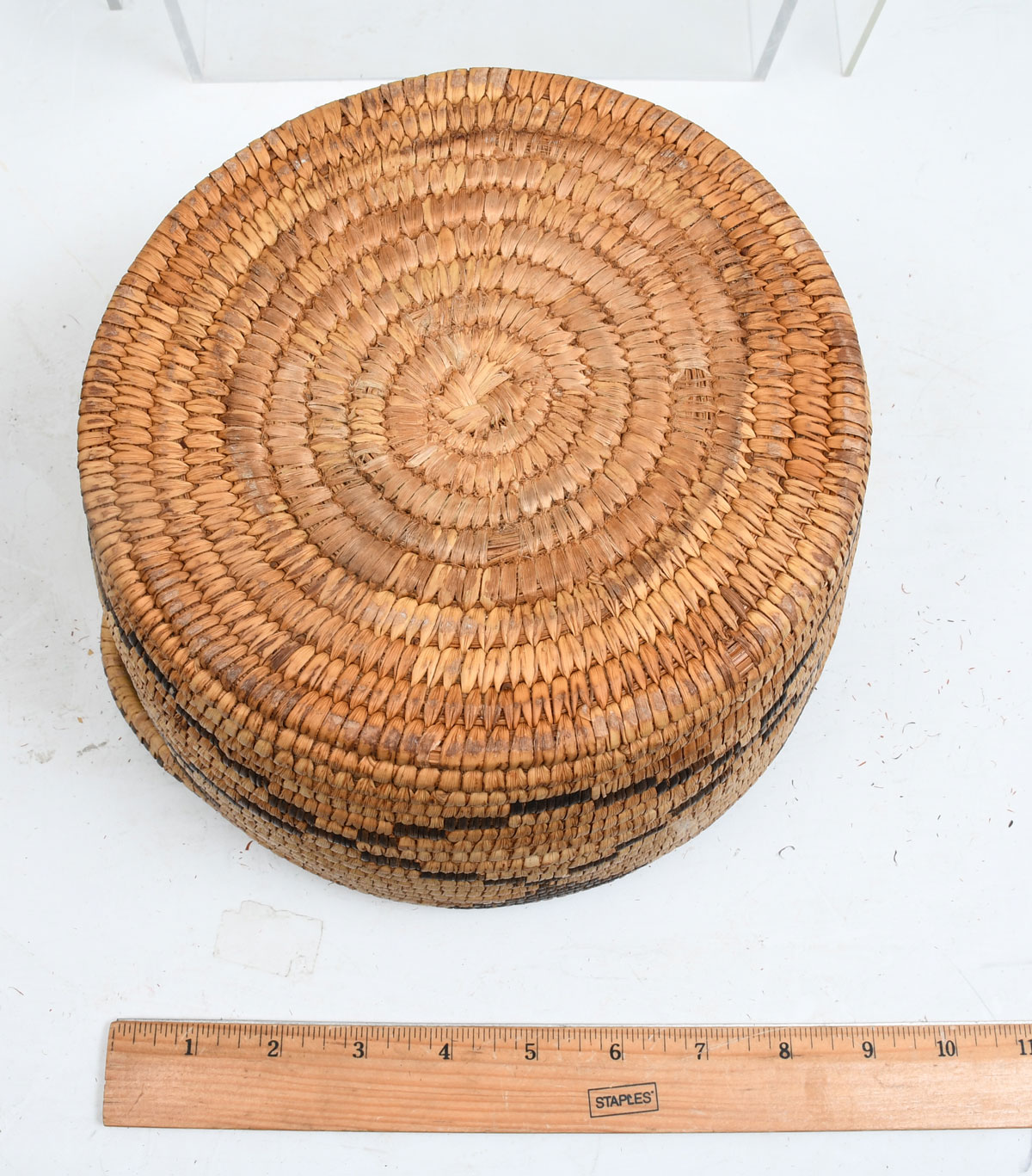 6 AMERICAN INDIAN WOVEN BASKETS: 1) Southwest Apache handled basket with geometric pattern and 2 handles. Measures 6.125'' h. x 9.5''; 2) 2 small, tightly woven lidded Indian baskets measure 1.75'' h x 2.5'' diameter and 1.5'' h x 3''; 3) 3 woven open baskets, 1 is oval shaped. The 2 baskets on the right are not American Indian but rather American arts and crafts.