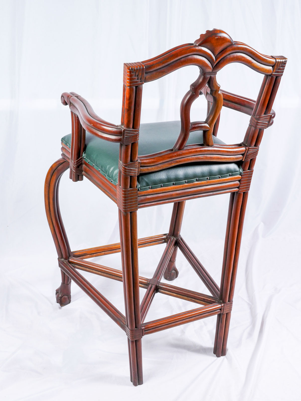MODERN CARVED HI-TOP TABLE & 4 CHAIRS: Round high-top table with a mounted black metal footrest, over a stylized Dolphin Fish base. 4- Carved tall armchairs, having a Rattan design with green faux leather upholstery. Table Approx. 43.5'' x 35'' dia. Chairs Approx. 47.25'' h x 25.5'' l x 24.5'' w.