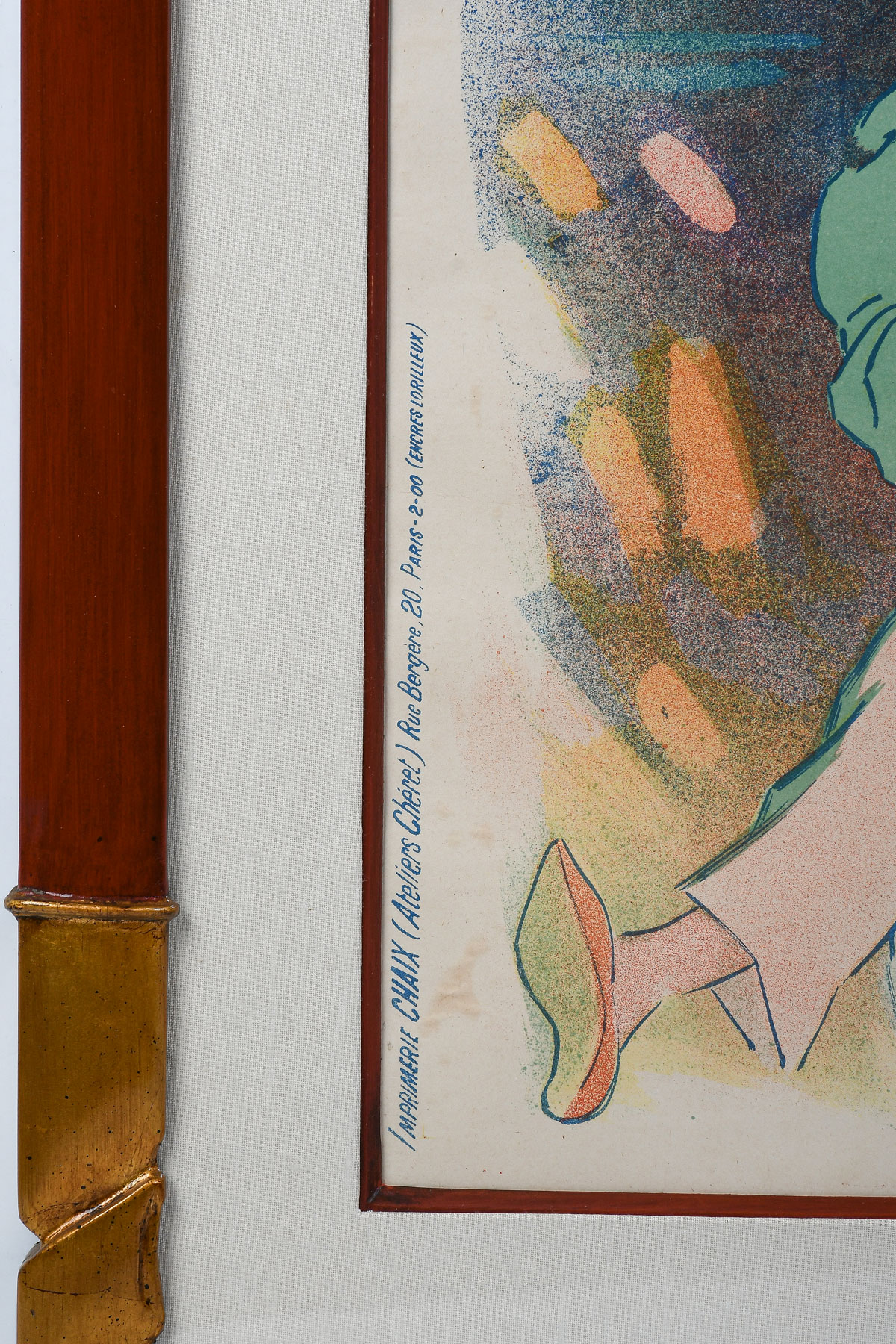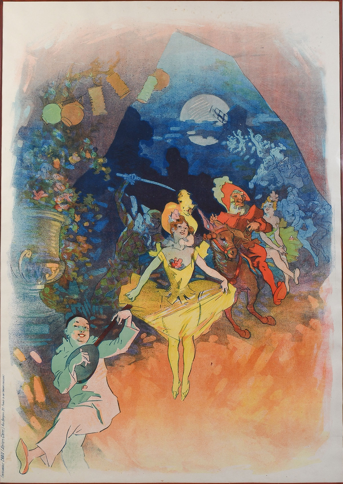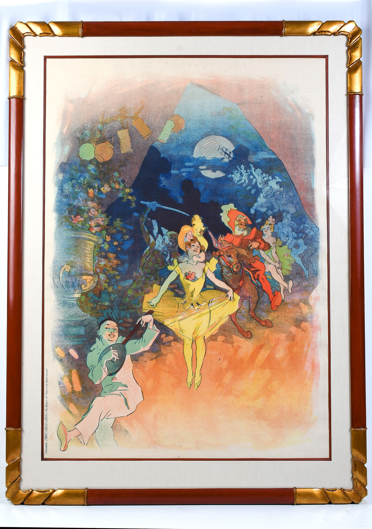 LARGE RARE JULES CHERET POSTER FOR MUSEE GREVIN: Sight size 48'' x 34''. This poster was created circa 1900. This is a proof impression done prior to any poster text being added to the stone, printed at Imprimerie Chaix, marked lower left. Encased in fine deco carved, painted, and gilded frame, measures 57'' x 42.5''. From the Estate of Franklin Wolfson, a resident of Beverly Hills, California and former President of Bugle Boy Clothing. Est. $3000/5000**