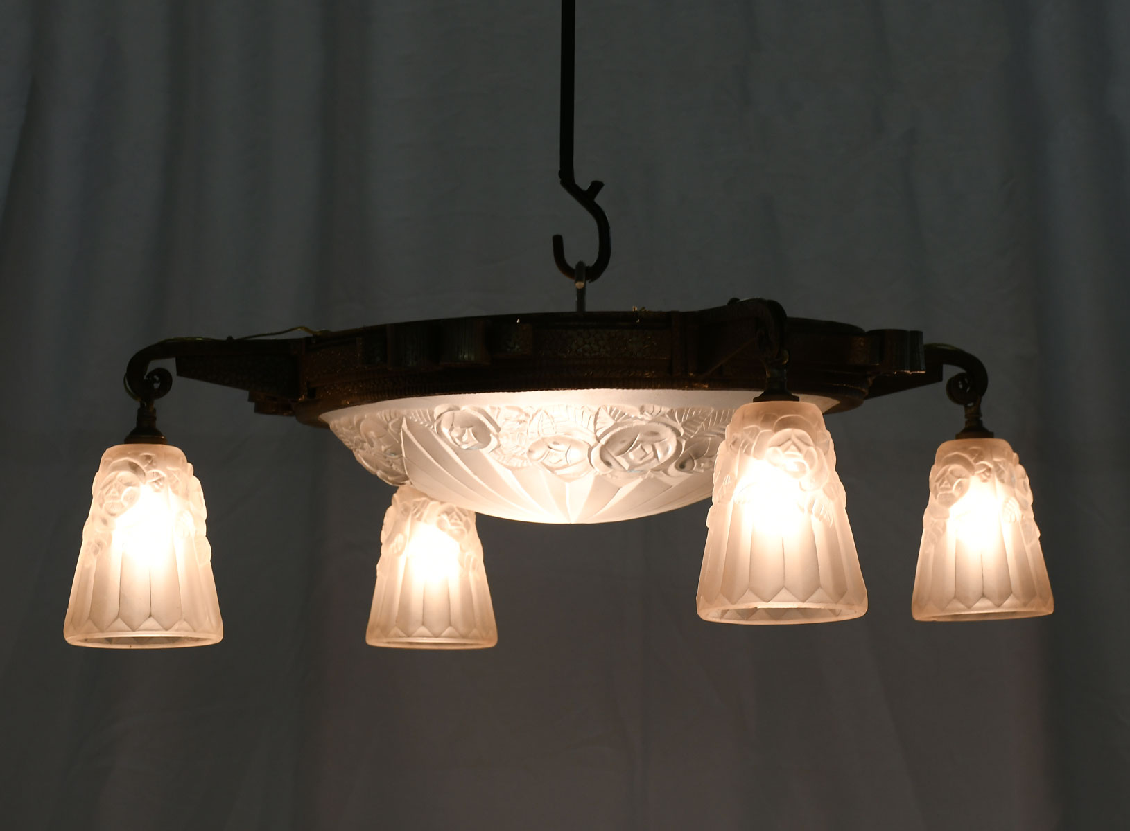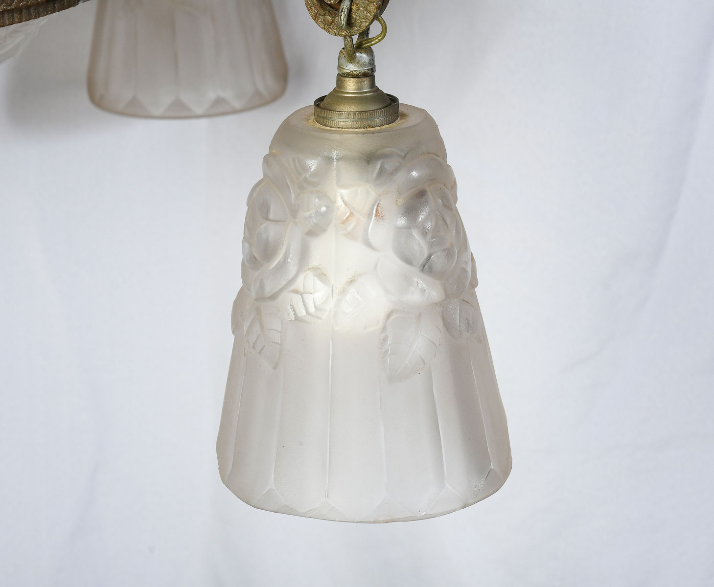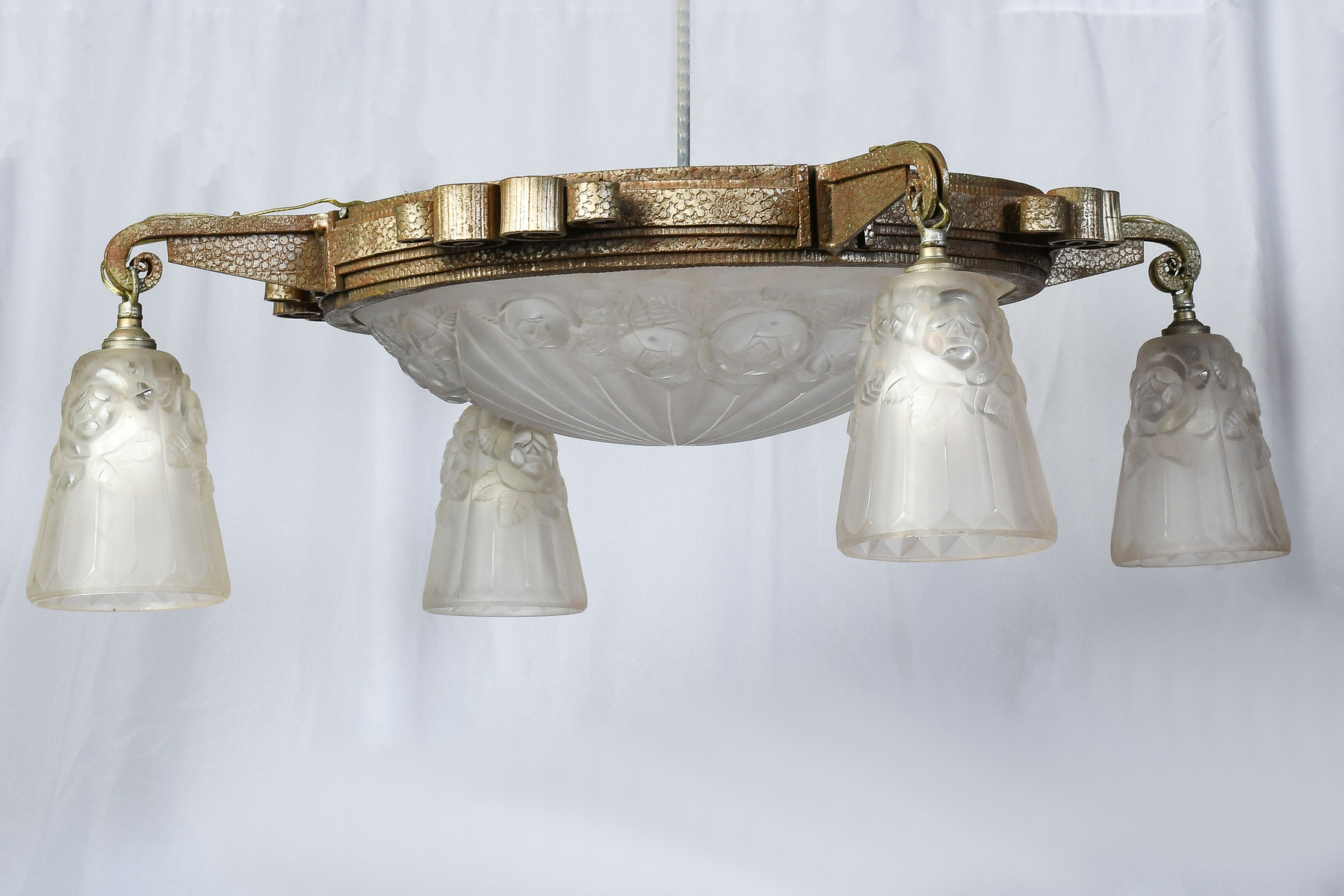 PERIOD ART DECO DEGUE? FROSTED GLASS 5 LIGHT FIXTURE: Large center shade measures approx. 15'' diameter, metal fixture is approx. 28'' at its widest point, each shade is approx. 5.5'' h. From the Estate of Franklin Wolfson, a resident of Beverly Hills, California and former President of Bugle Boy Clothing. Est. $1000/2000**