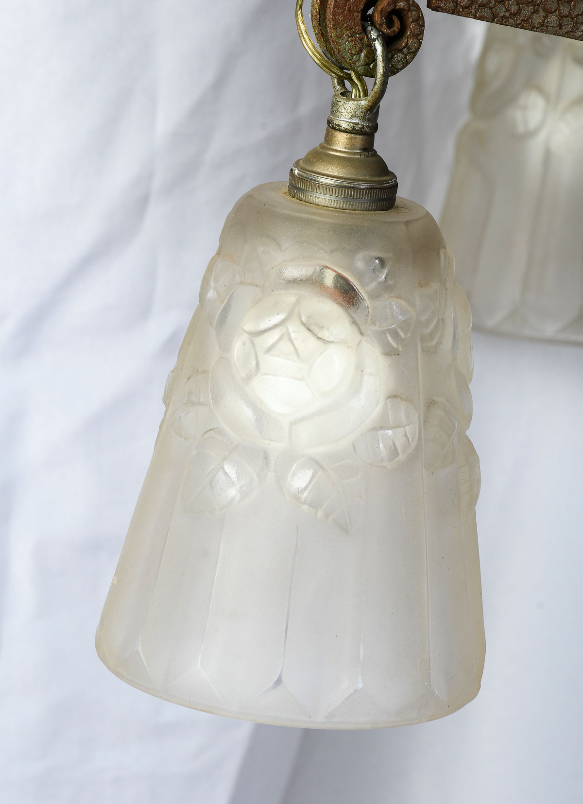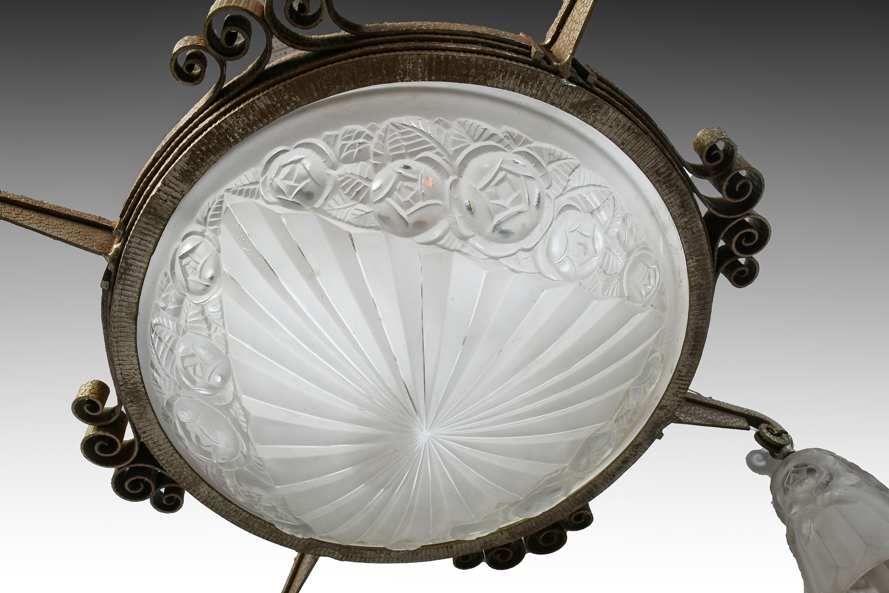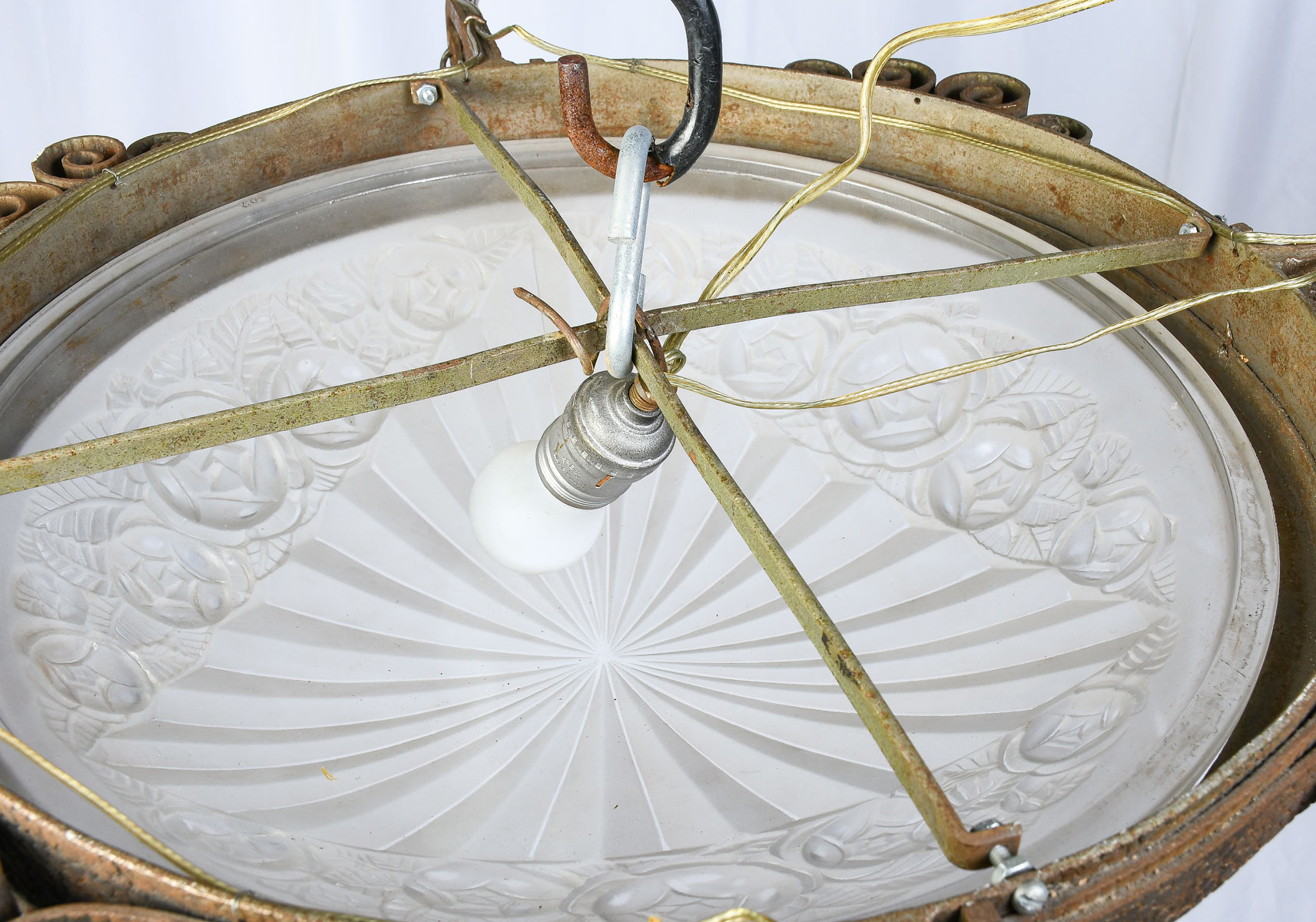 PERIOD ART DECO DEGUE? FROSTED GLASS 5 LIGHT FIXTURE: Large center shade measures approx. 15'' diameter, metal fixture is approx. 28'' at its widest point, each shade is approx. 5.5'' h. From the Estate of Franklin Wolfson, a resident of Beverly Hills, California and former President of Bugle Boy Clothing. Est. $1000/2000**
