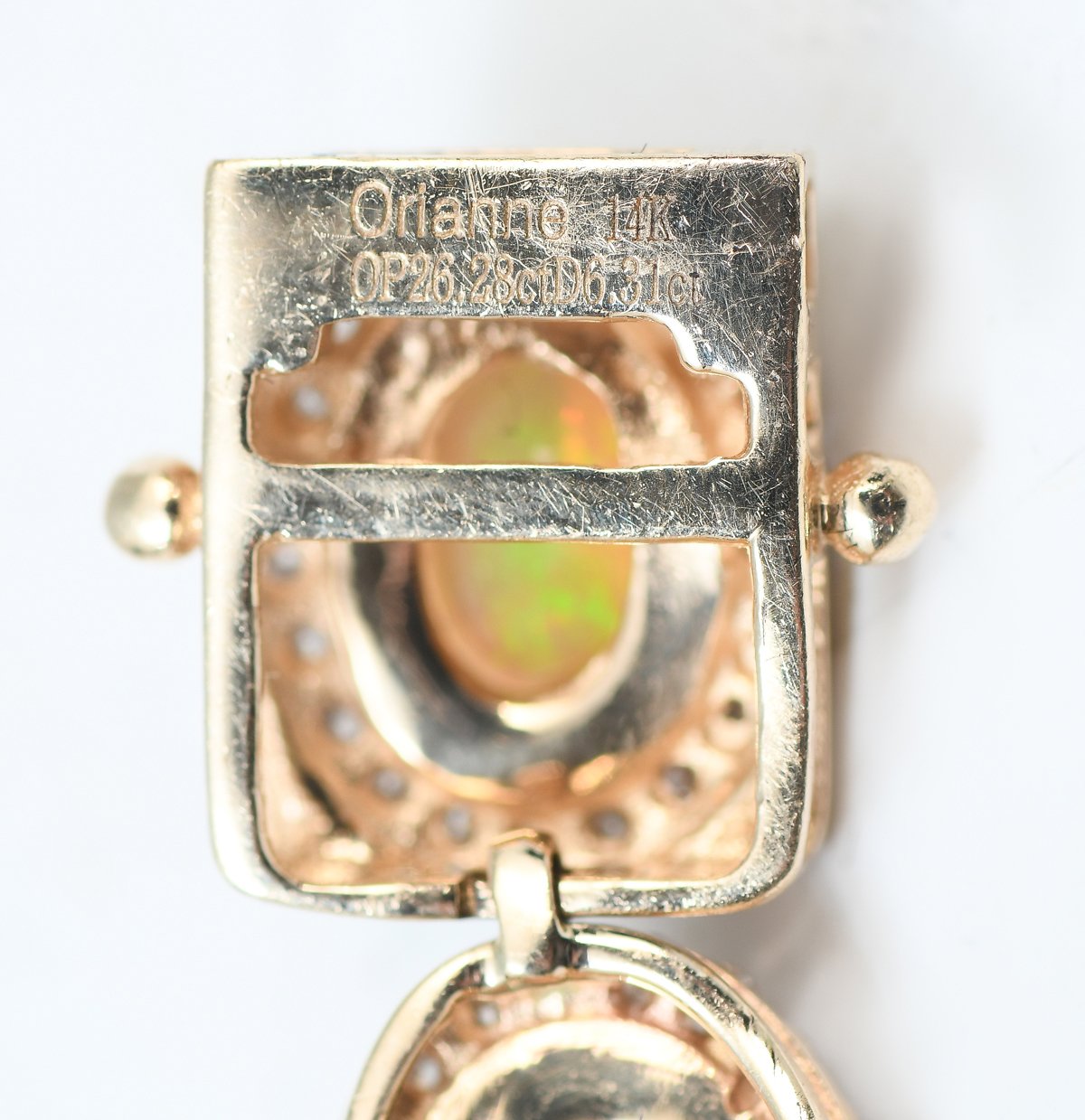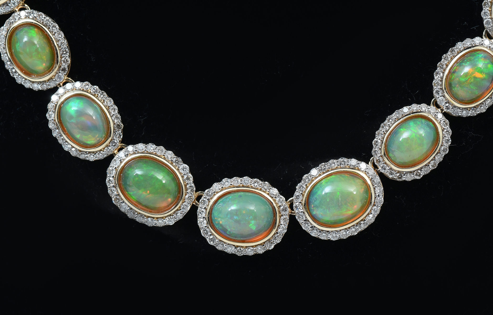 14K 26.28 CTW OPAL & DIAMOND NECKLACE: 37 graduating greenish opals are set in diamond bezels in this 17'' flexible link necklace. Opals approx 26.28 CTW and diamonds approx 6.31 CTW. total weight 39.4 grams. Signed Orianne. Sold with current Florida Diamond Appraisers GIA graduates appraisal for $13,550. Est. $8000/14000**