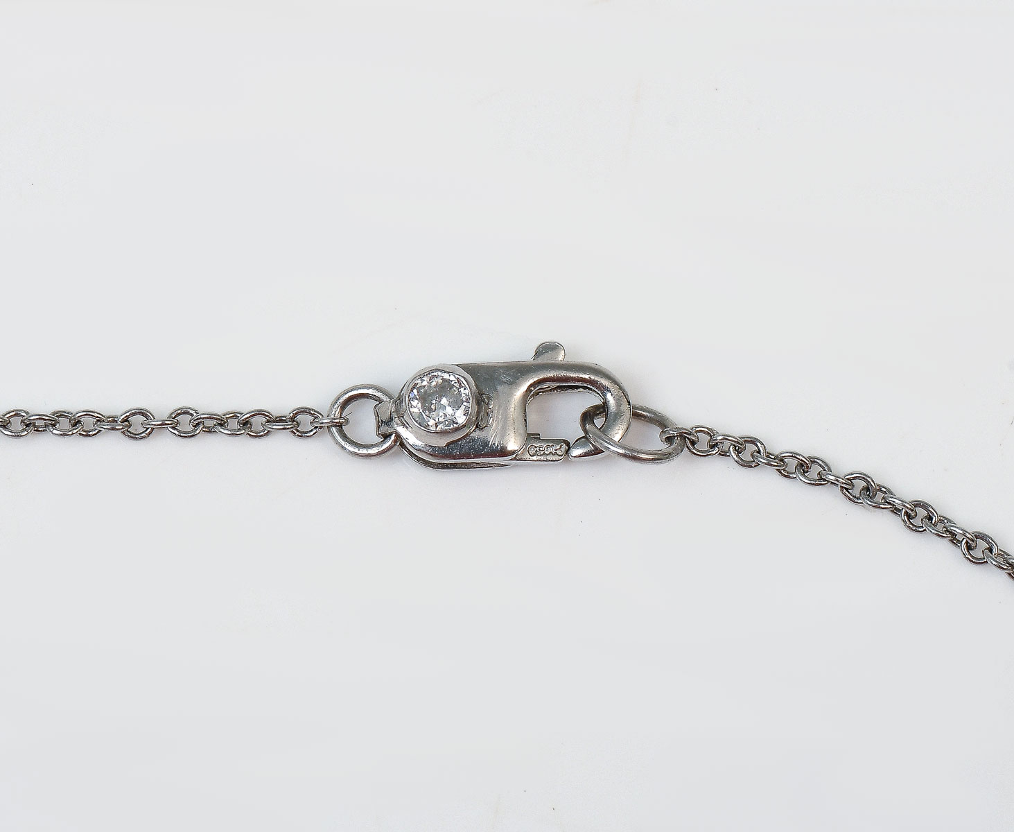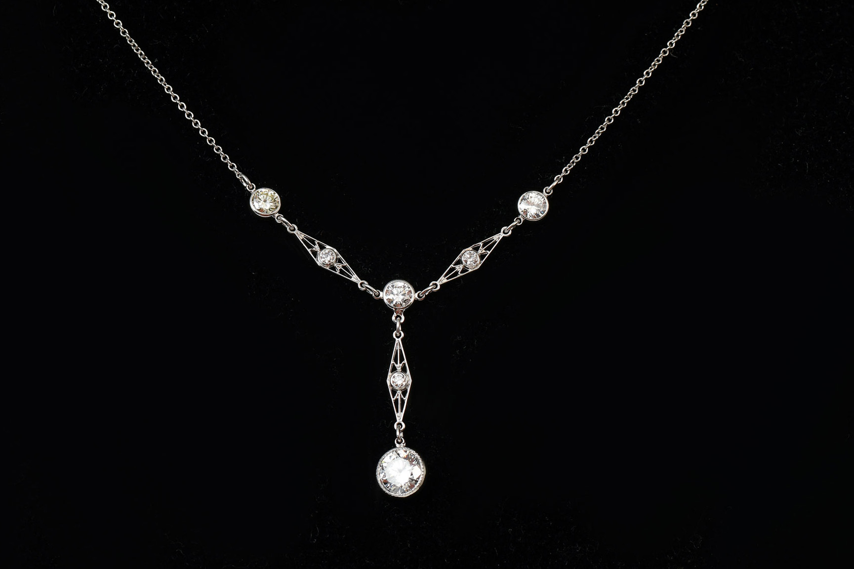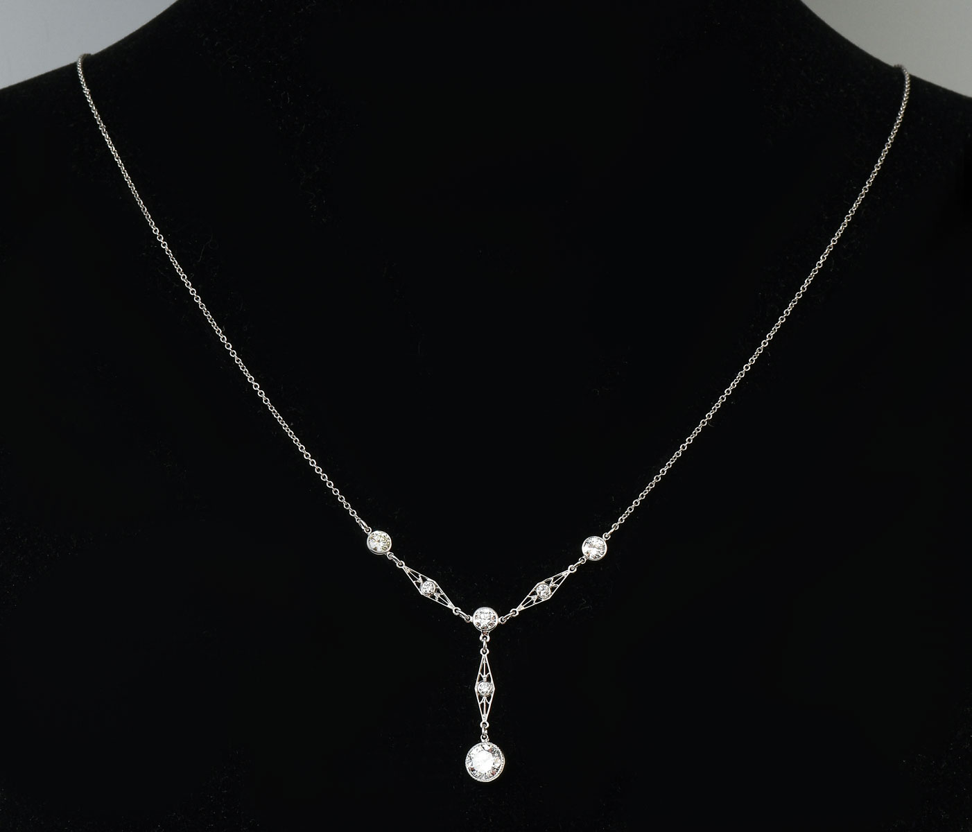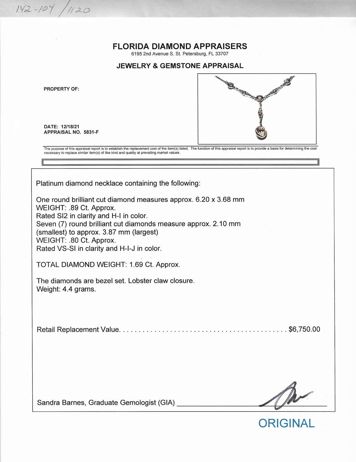 1.69 CTW DIAMOND PLATINUM ''Y'' NECKLACE: Platinum necklace is 18'' in length plus 1'' for the drop. A single bezel set round brilliant cut diamond approx .89 CT and anchors the drop while 7 additional diamonds approx .80 CTW define the ''Y''. Total diamond weight approx 1.69 CTW. Total weight approx 4.4 grams. Sold with current Florida Diamond Appraisers GIA graduates appraisal for $6750. Est. $3500/7000**
