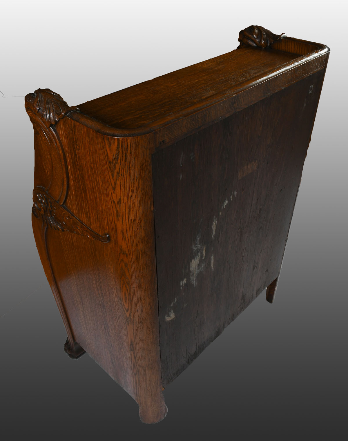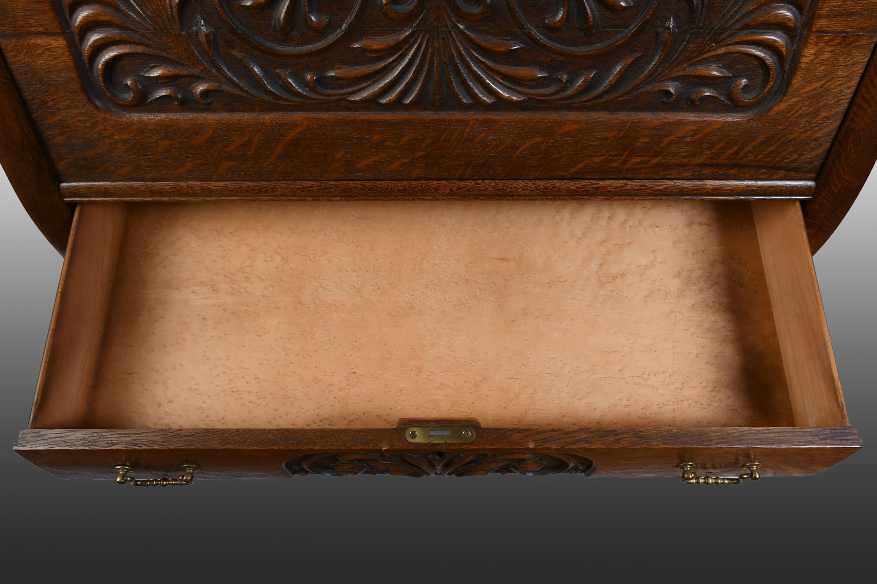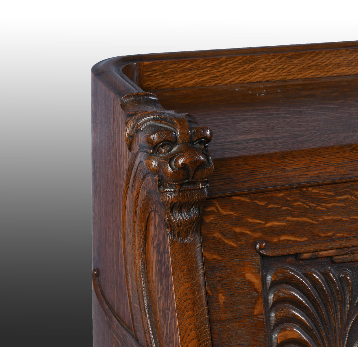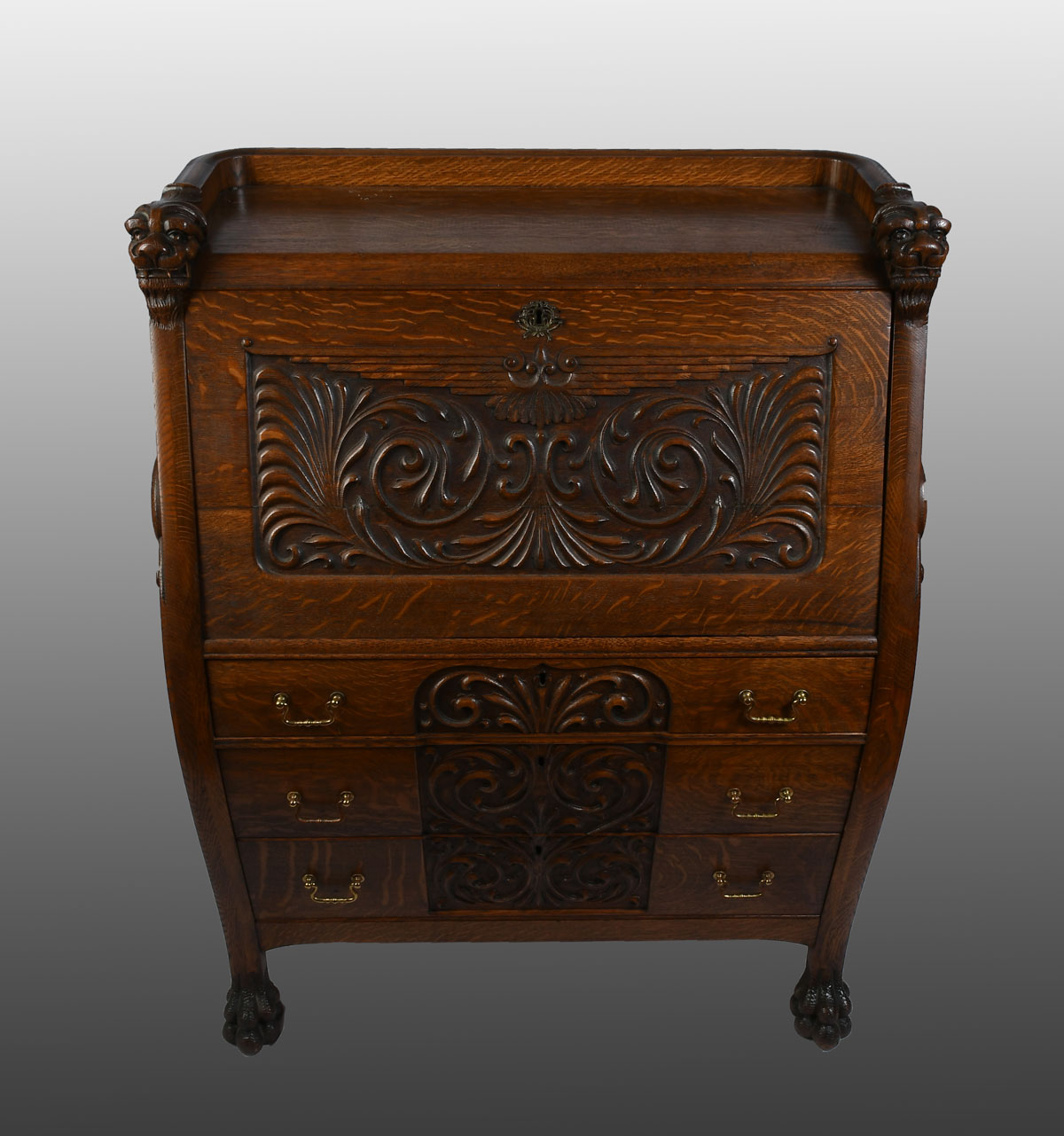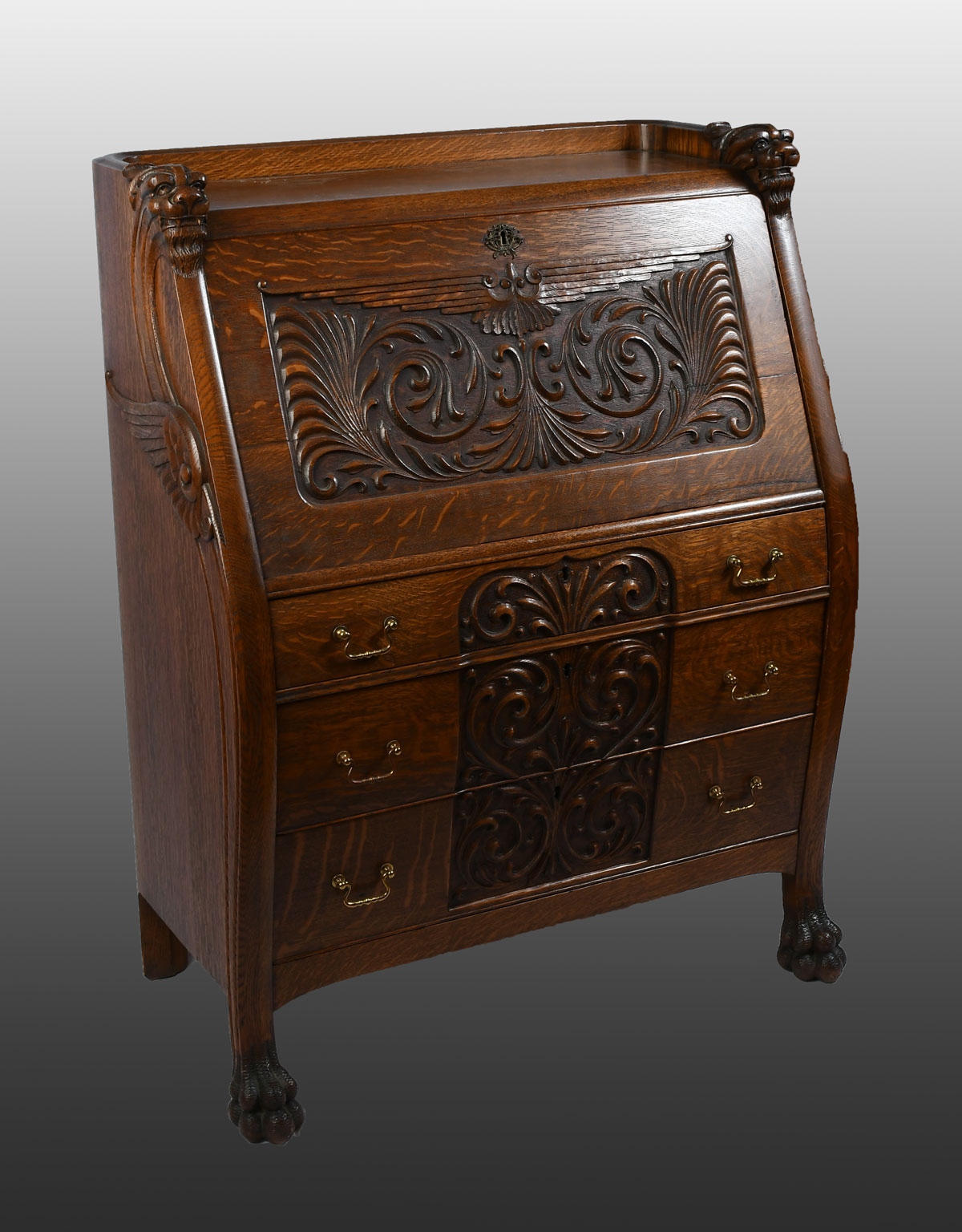 EARLY 20TH C. CARVED OAK DROPFRONT SECRETARY: Carved oak 3 drawer dropfront desk, having a compartmented interior. Carved gallery top with Lion's heads. Scrolling foliate motif at drawers and sides. Approx. 44.5'' h x 35'' w x 19.5'' d. From the Estate of Franklin Wolfson, a resident of Beverly Hills, California and former President of Bugle Boy Clothing. Est. $700/1000**