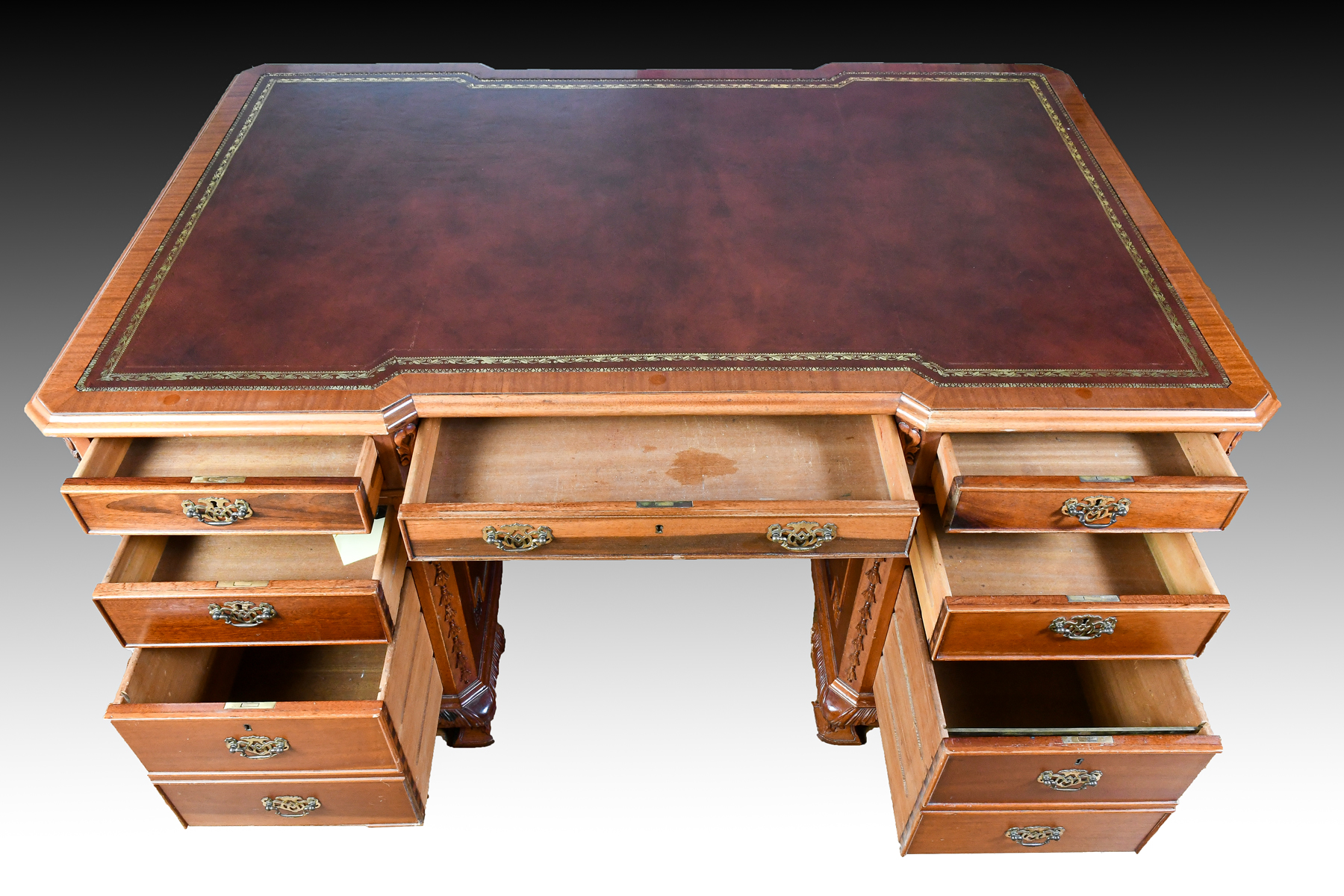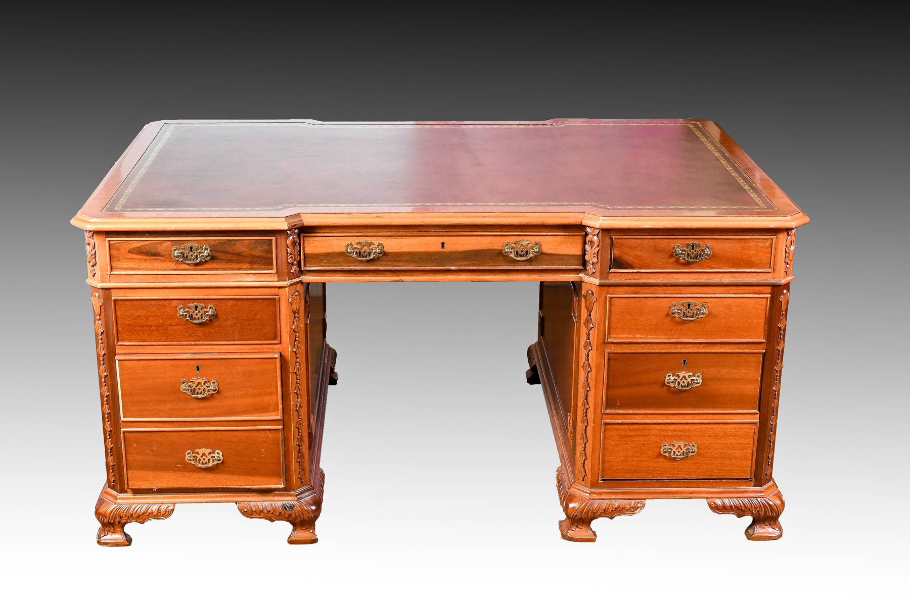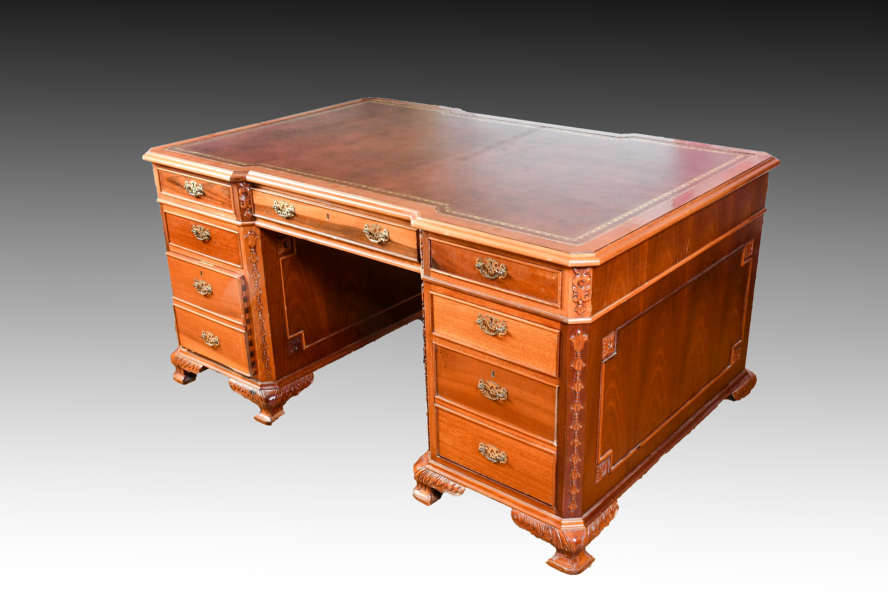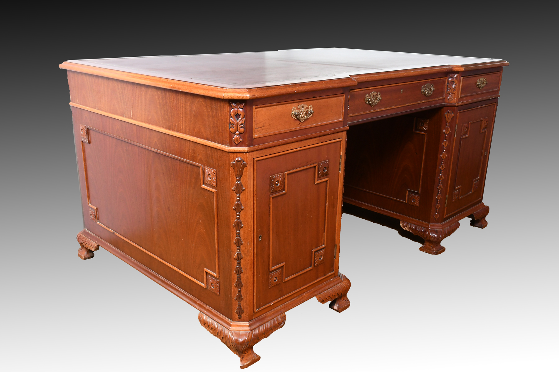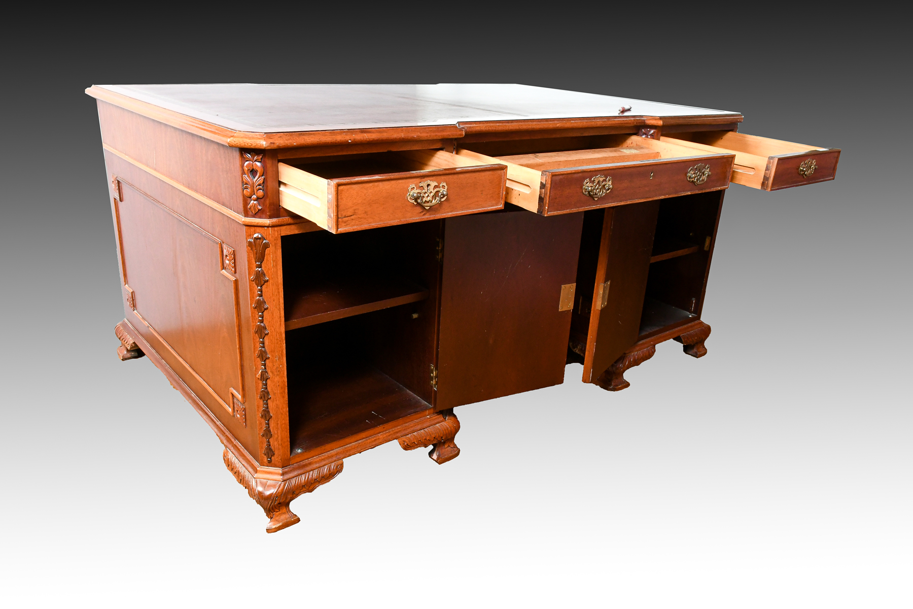 CONTEMPORARY PARTNERS DESK: Glass top protecting a Gold embossed leather writing surface. One side has 5 drawers over 2 file cabinet drawers. Other side has 3 drawers over 2 doors. Approx. 30.25'' h x 62'' l x 40'' w.