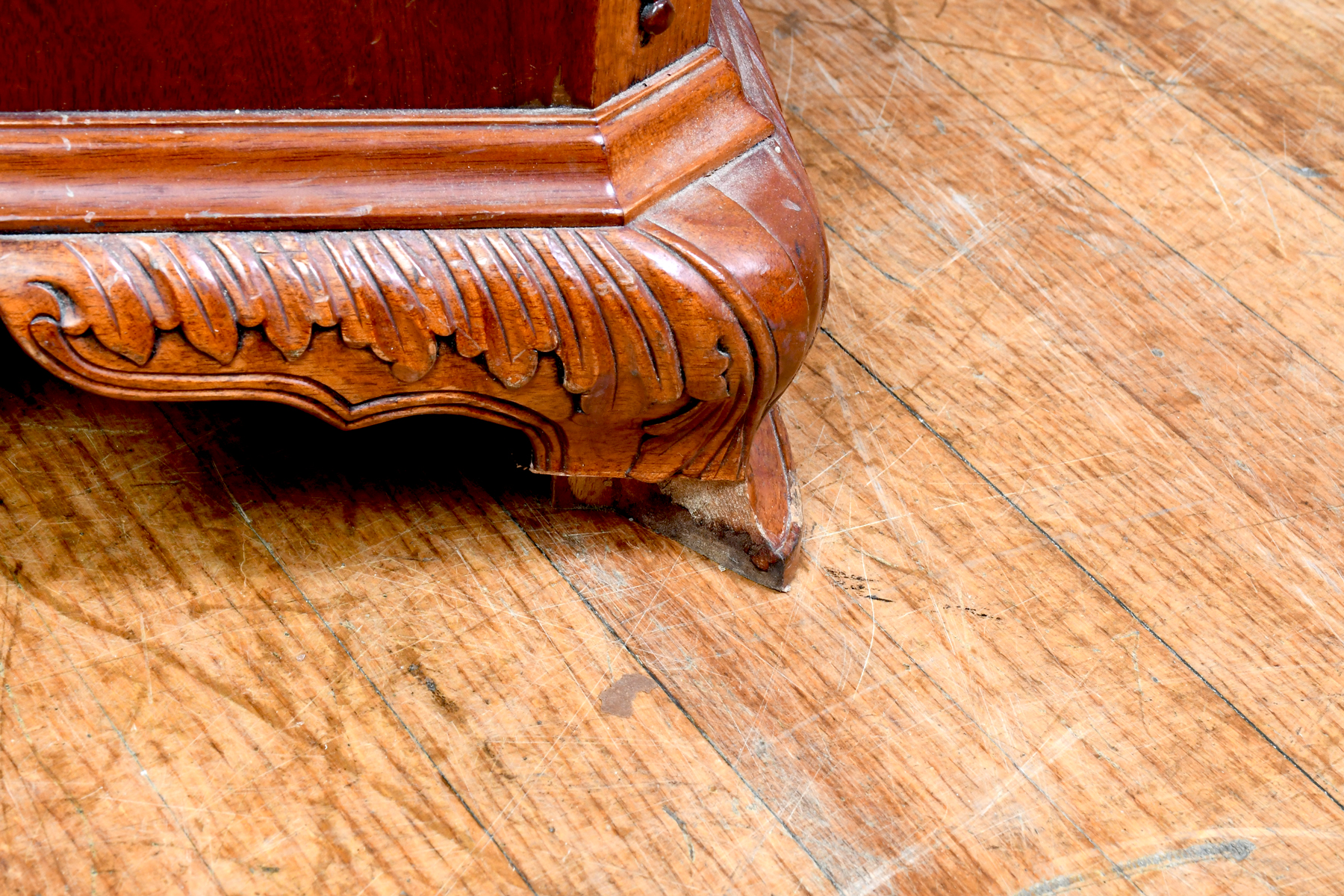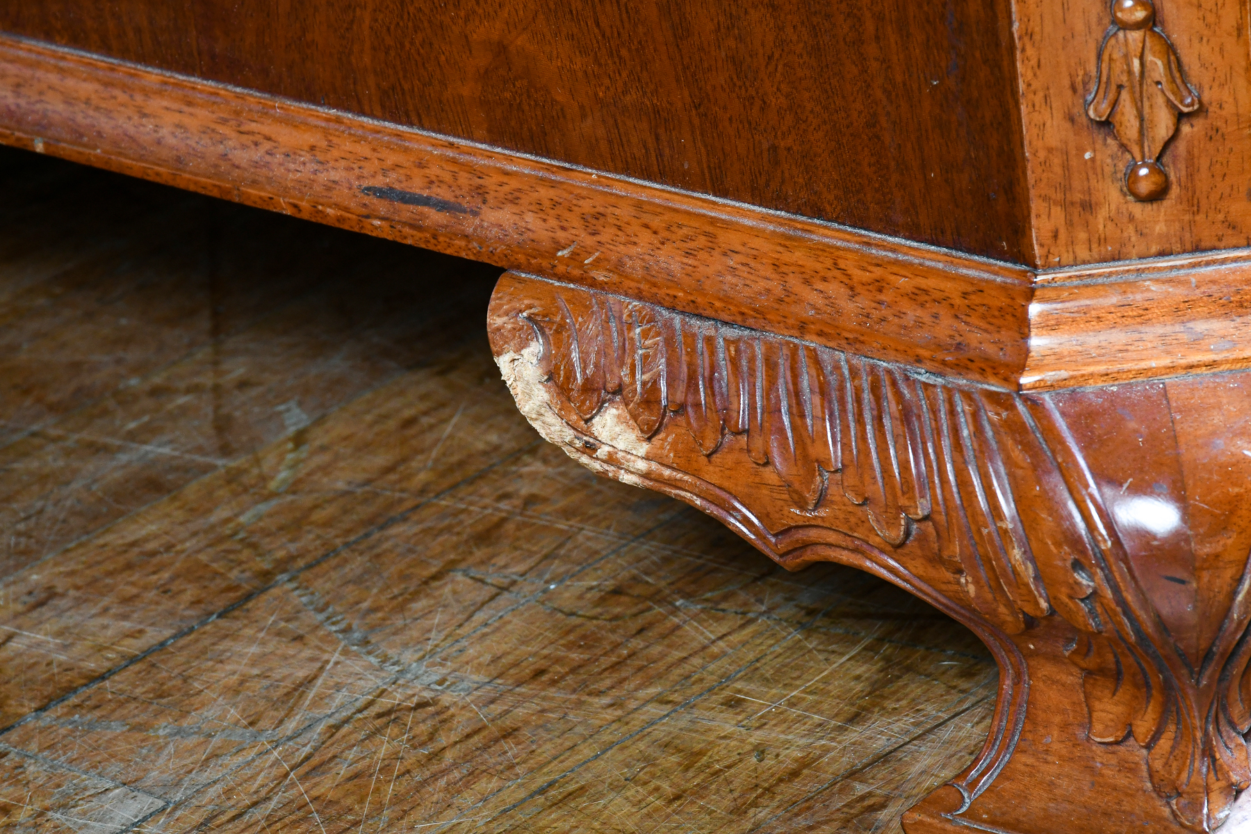 CONDITION: Some drawers & doors with missing trim pieces. File drawers have a tight fit. Scattered wear consistent with age and use.
