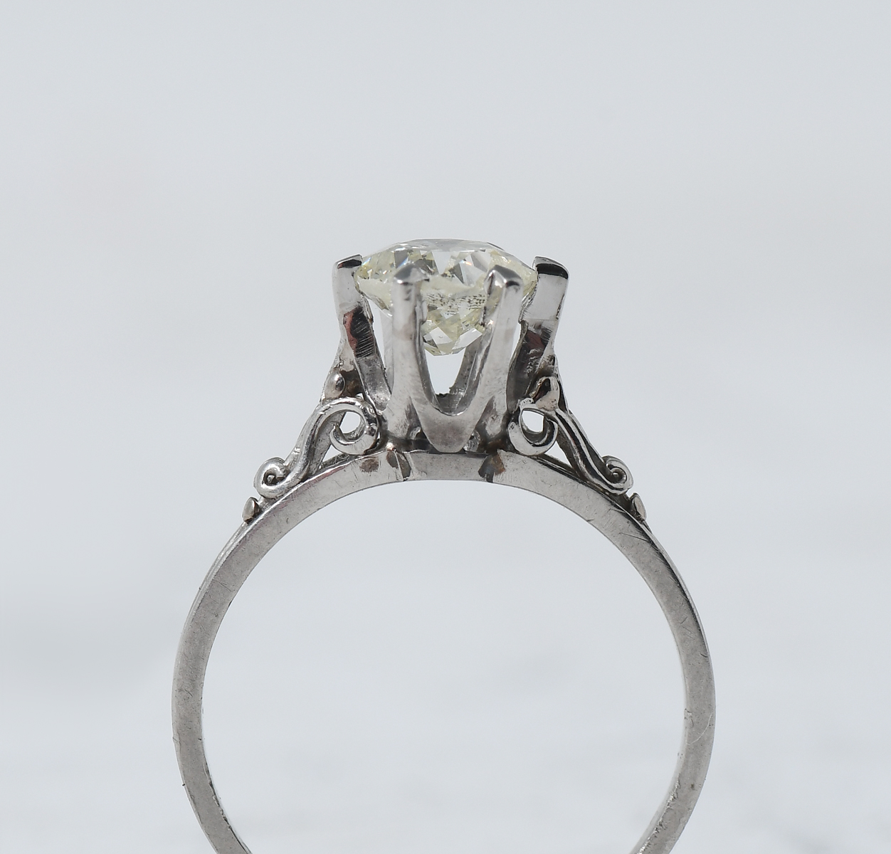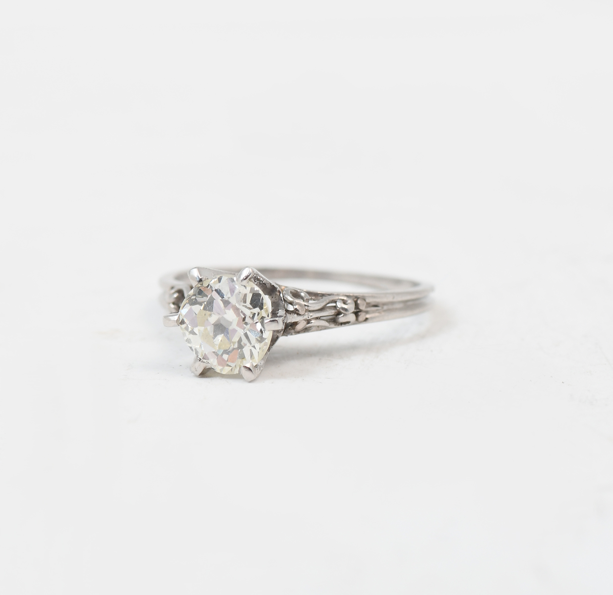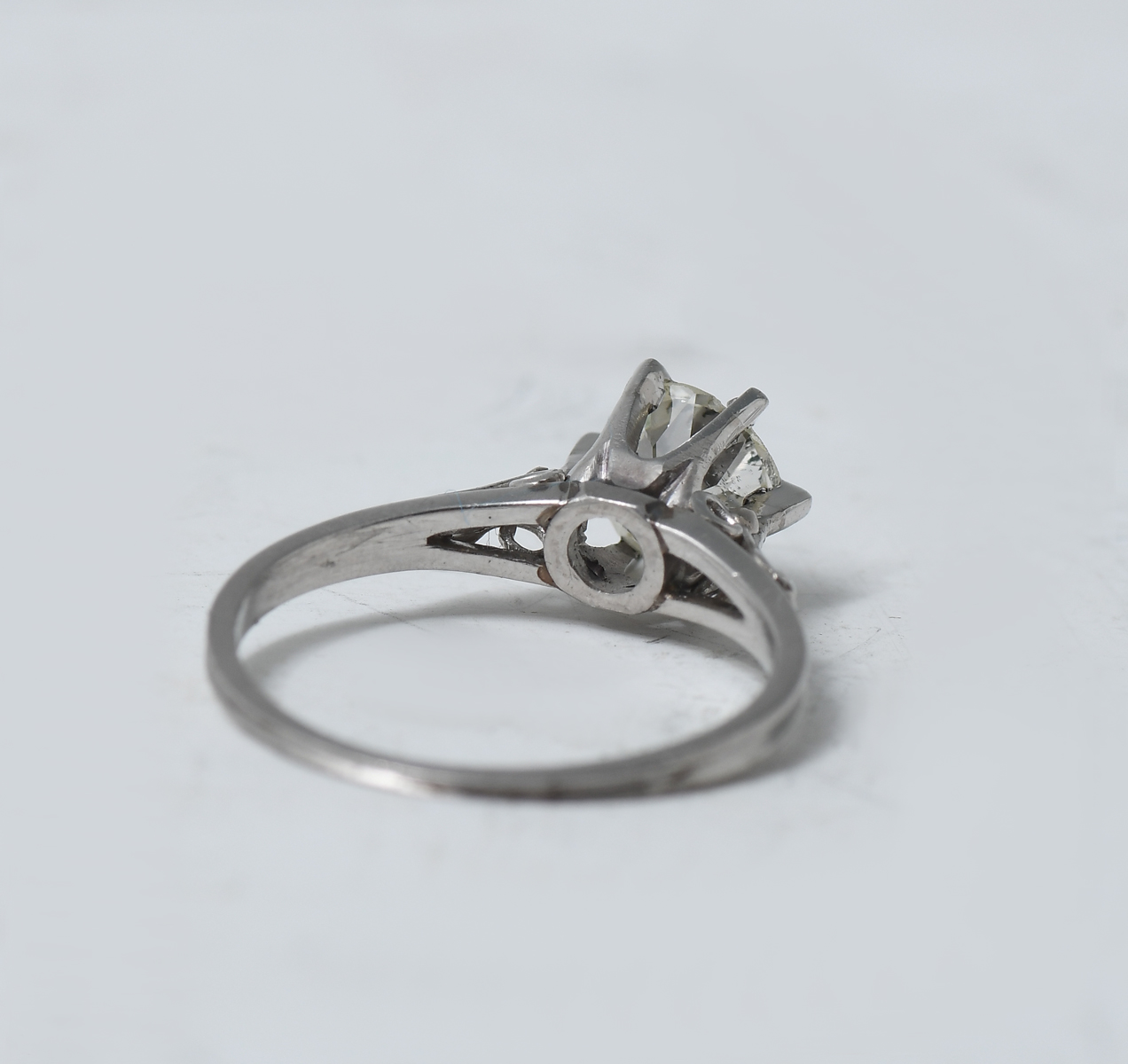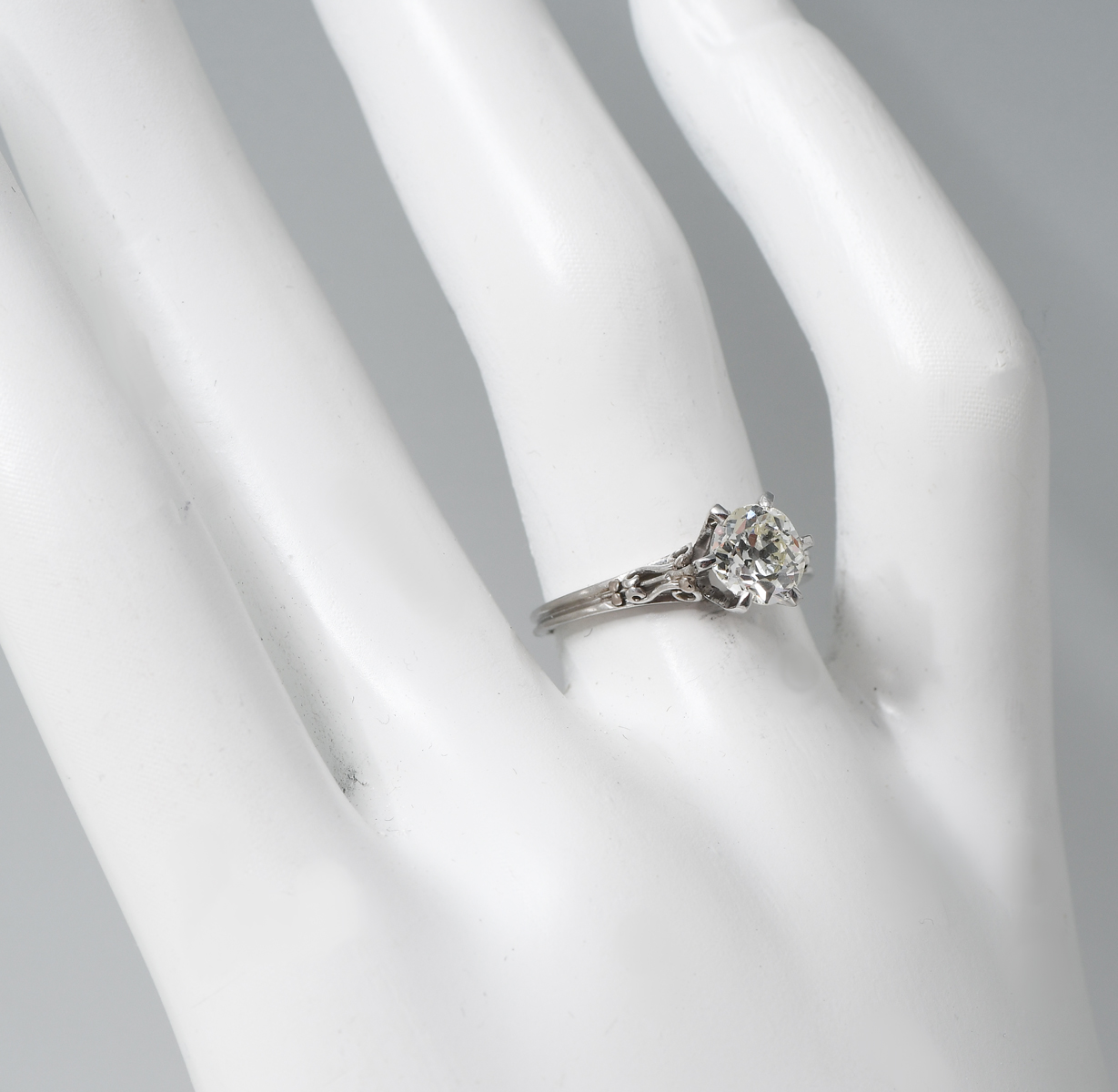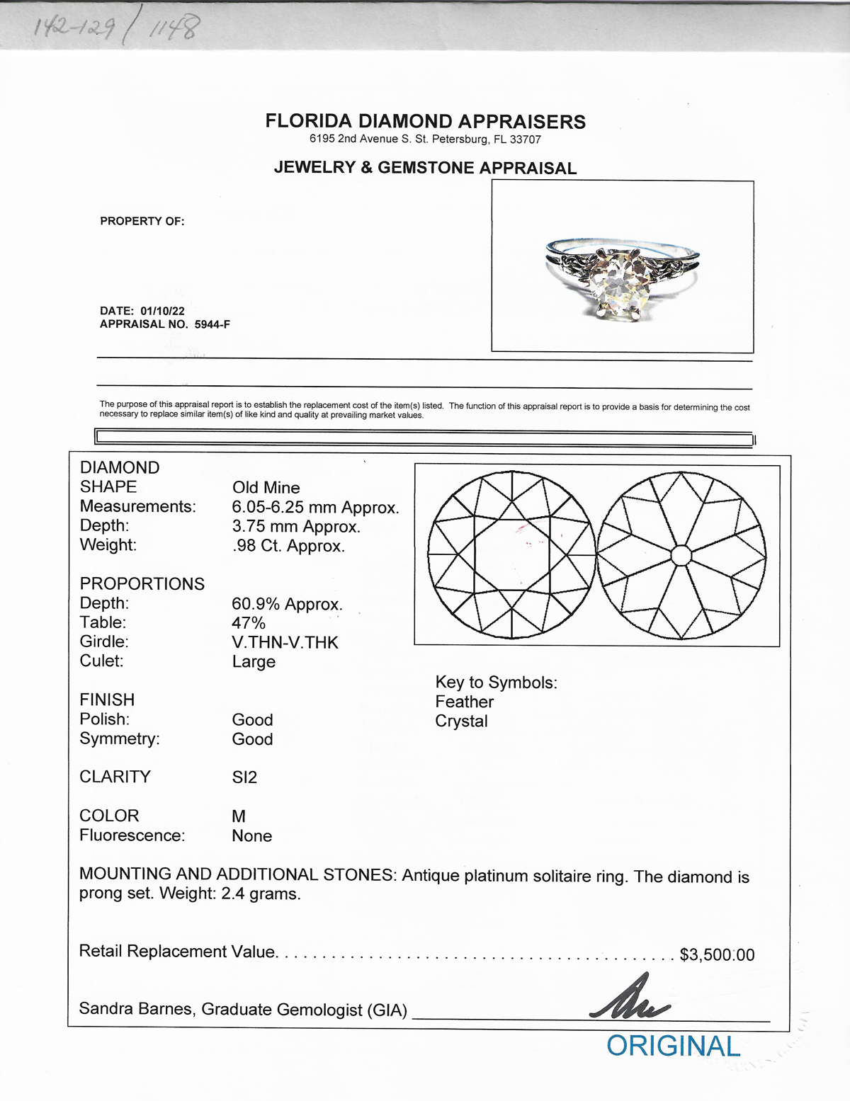 ANTIQUE PLATINUM .98 CTW DIAMOND RING: Early 1900s platinum setting features a single .98 CT old mine cut diamond. Size 5.5. Total weight approx 2.4 grams. Sold with current Florida Diamond Appraisers GIA graduates appraisal for $3500. Est. $2500/4000**