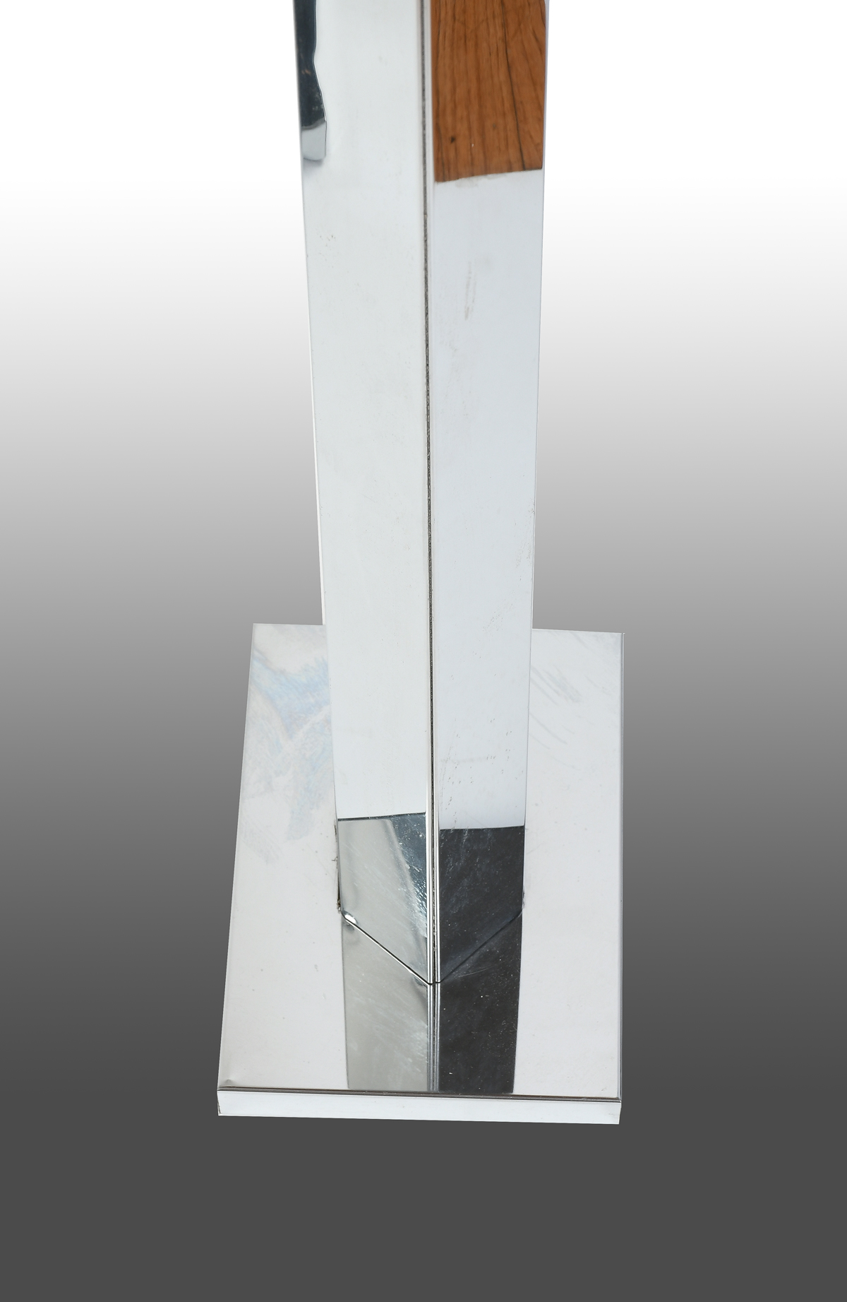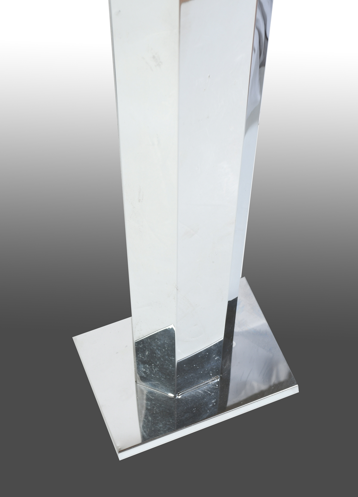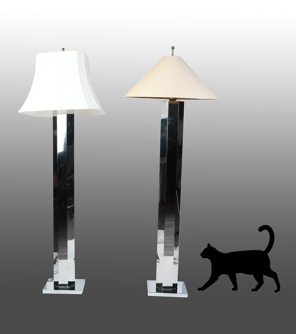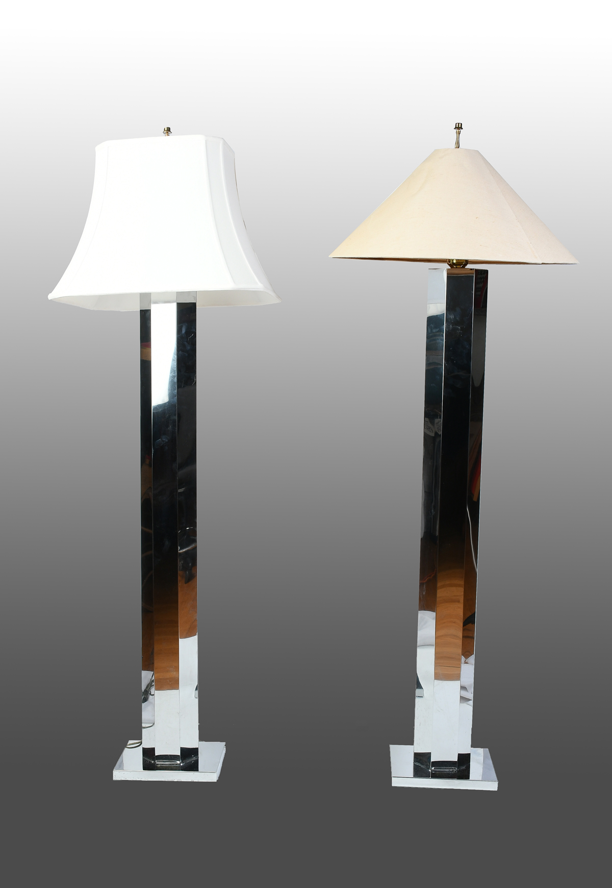 PAIR OF MODERN CHROME FLOOR LAMPS: Single light hexagonal chromed floor lamps with cloth shades. Lamps Approx. 62.25'' h x 17'' l x 7'' w. Largest shade Approx. 23'' w.