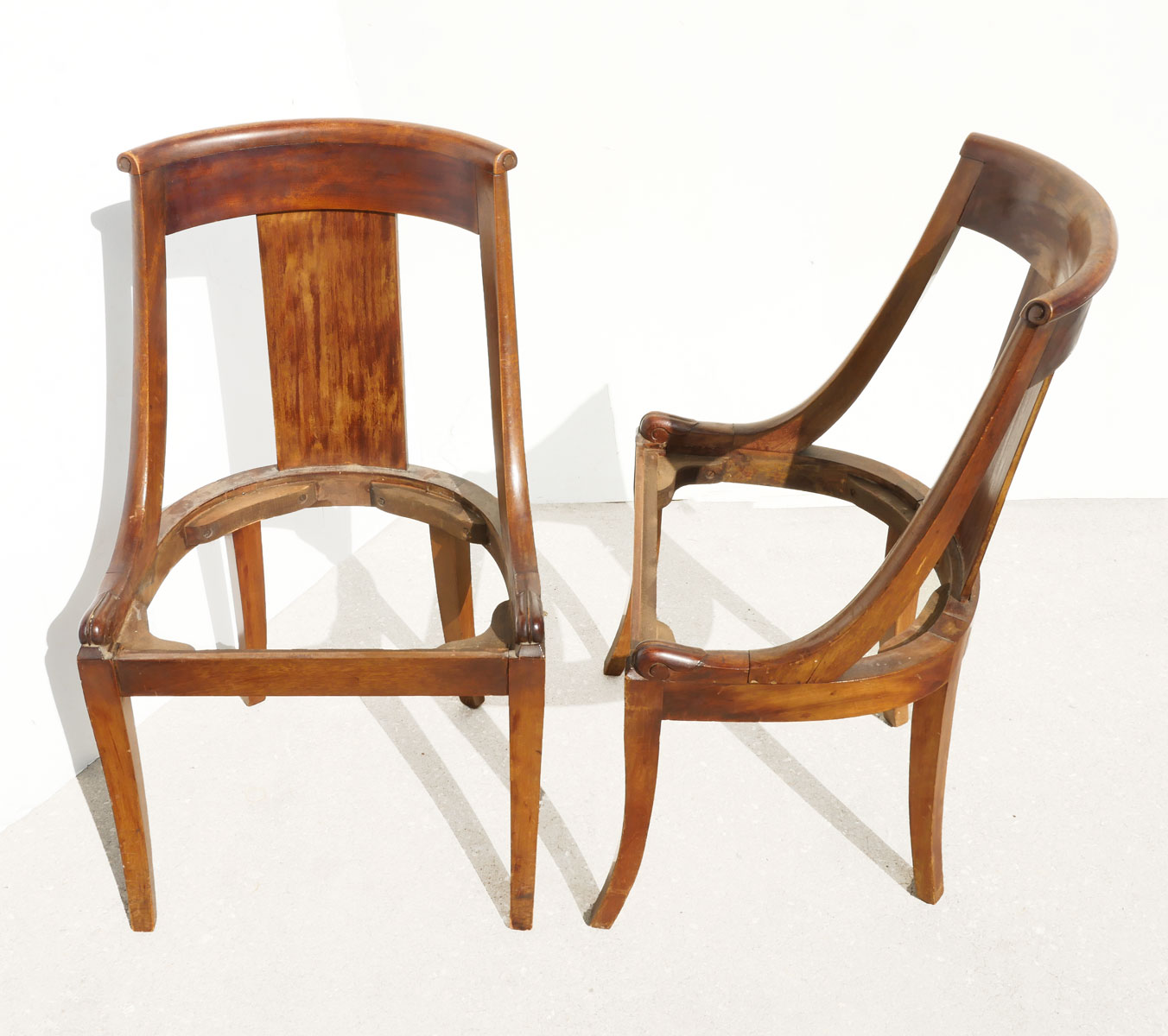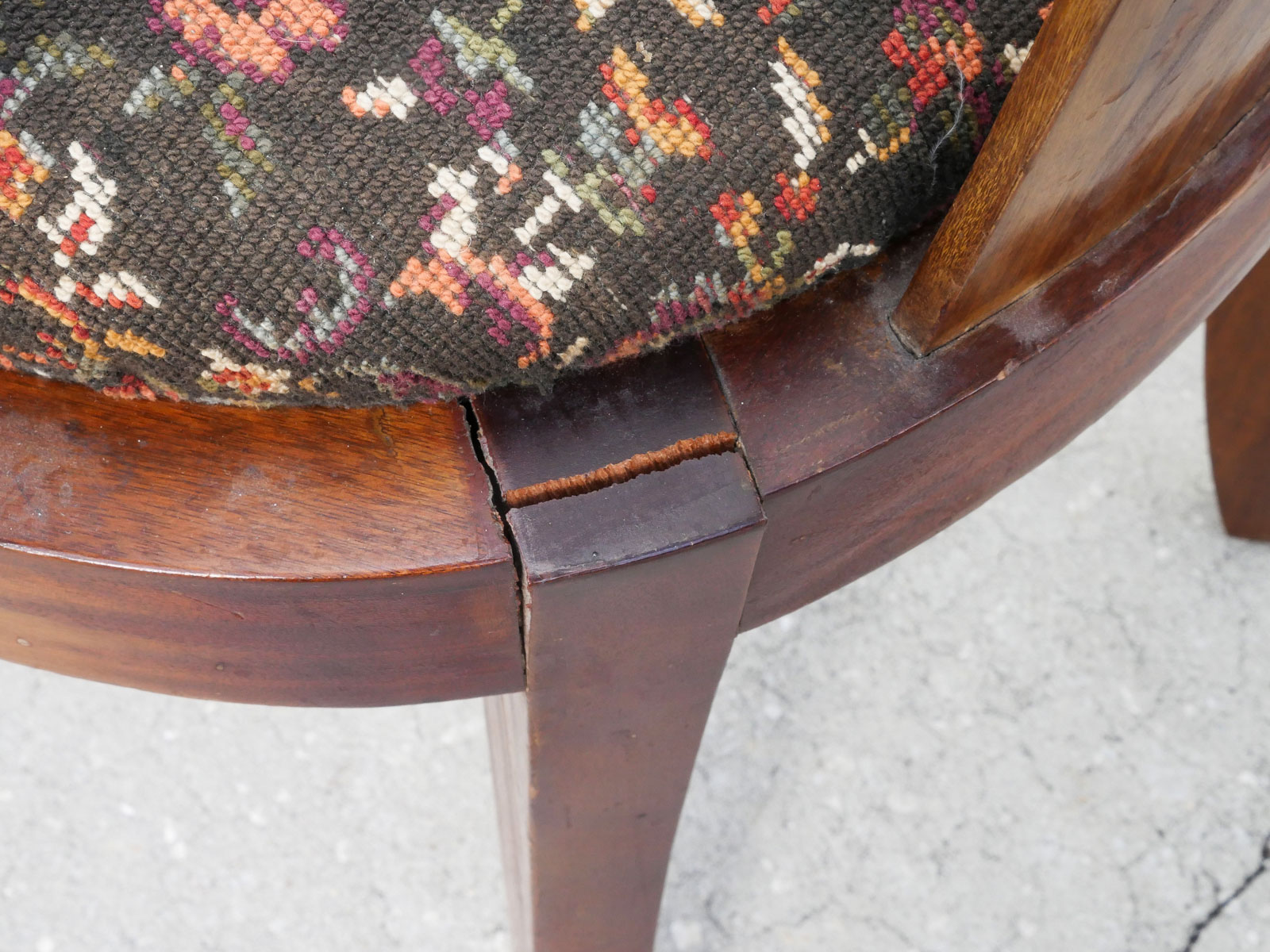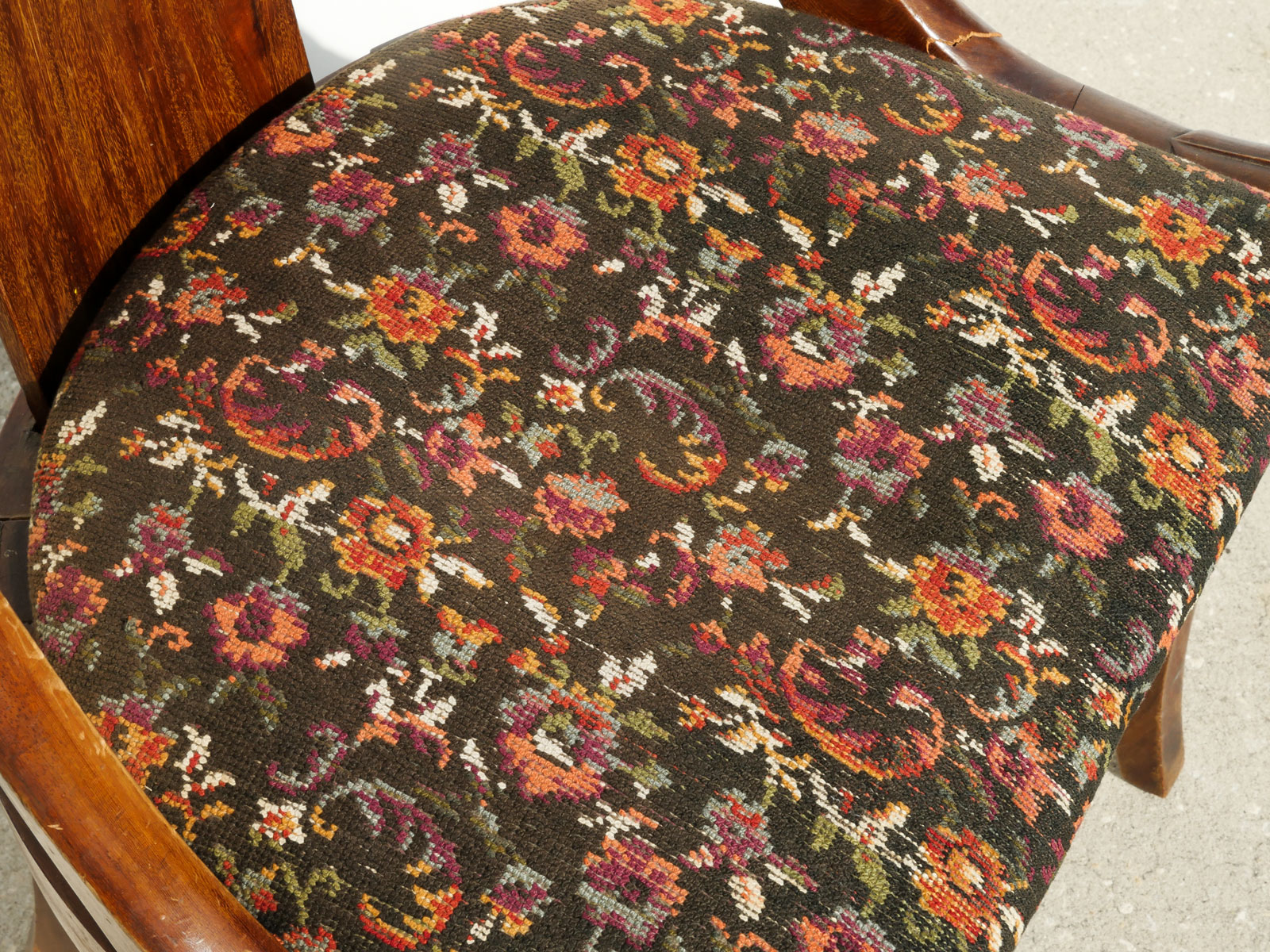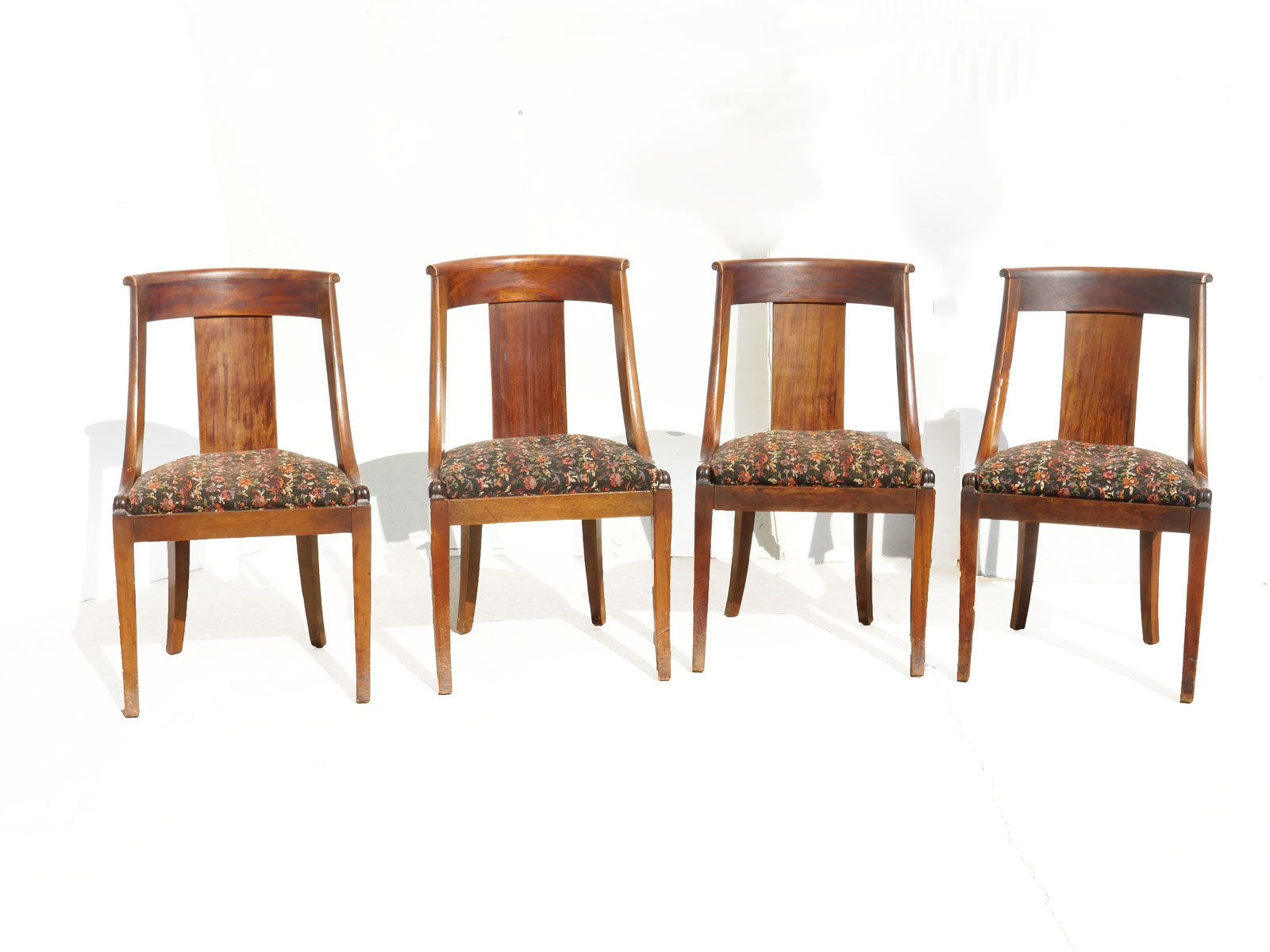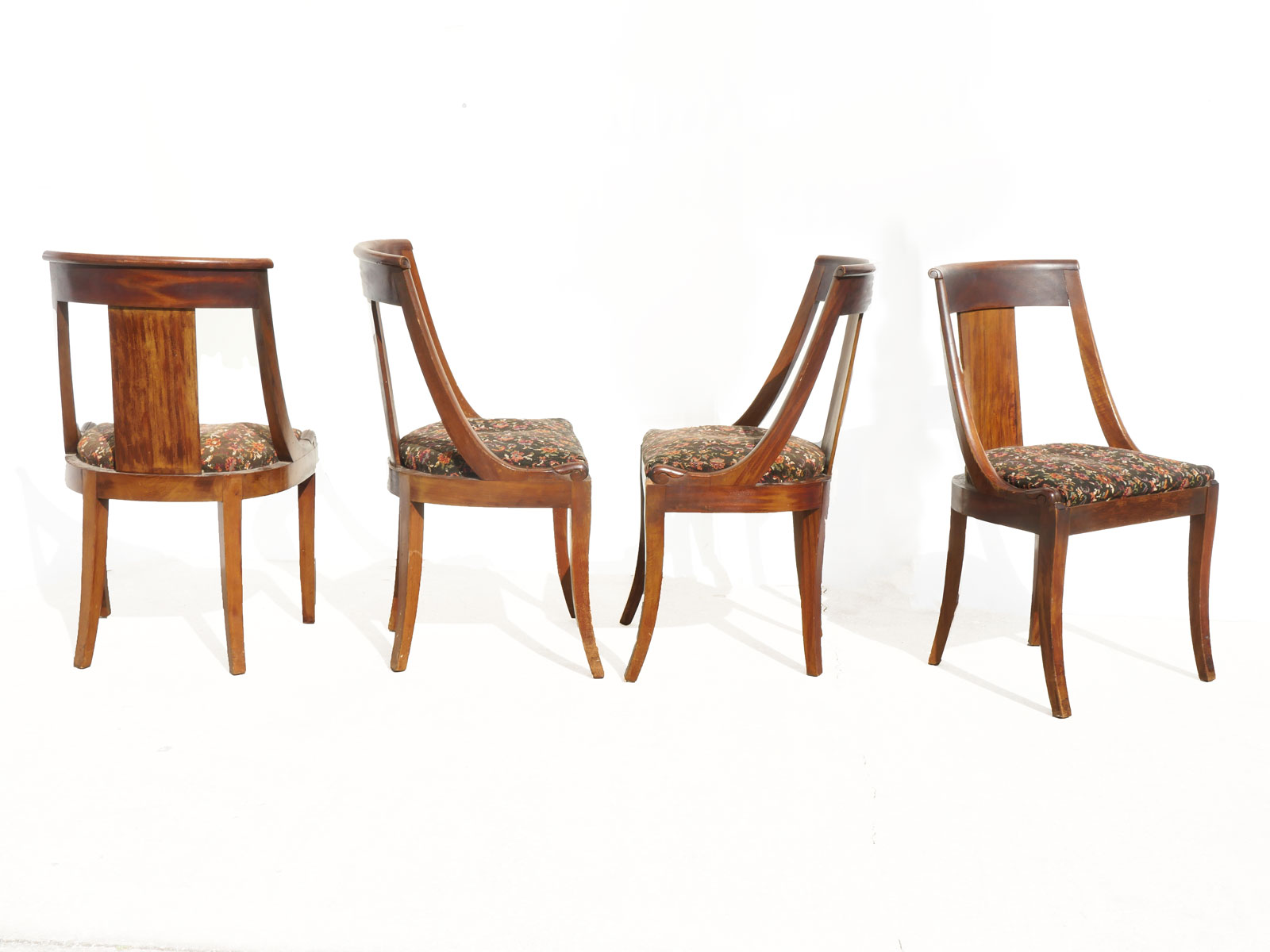 4 CARVED GONDOLA CHAIRS: 4 Early 20th century Gondola chairs with scrolling crest rails. Floral & foliate pattern upholstery. Approx. 32.25'' h x 19.5'' w x 19.5'' d.