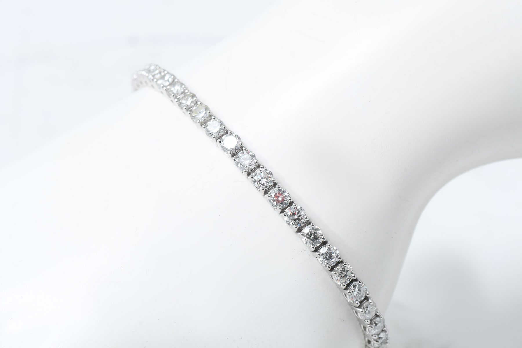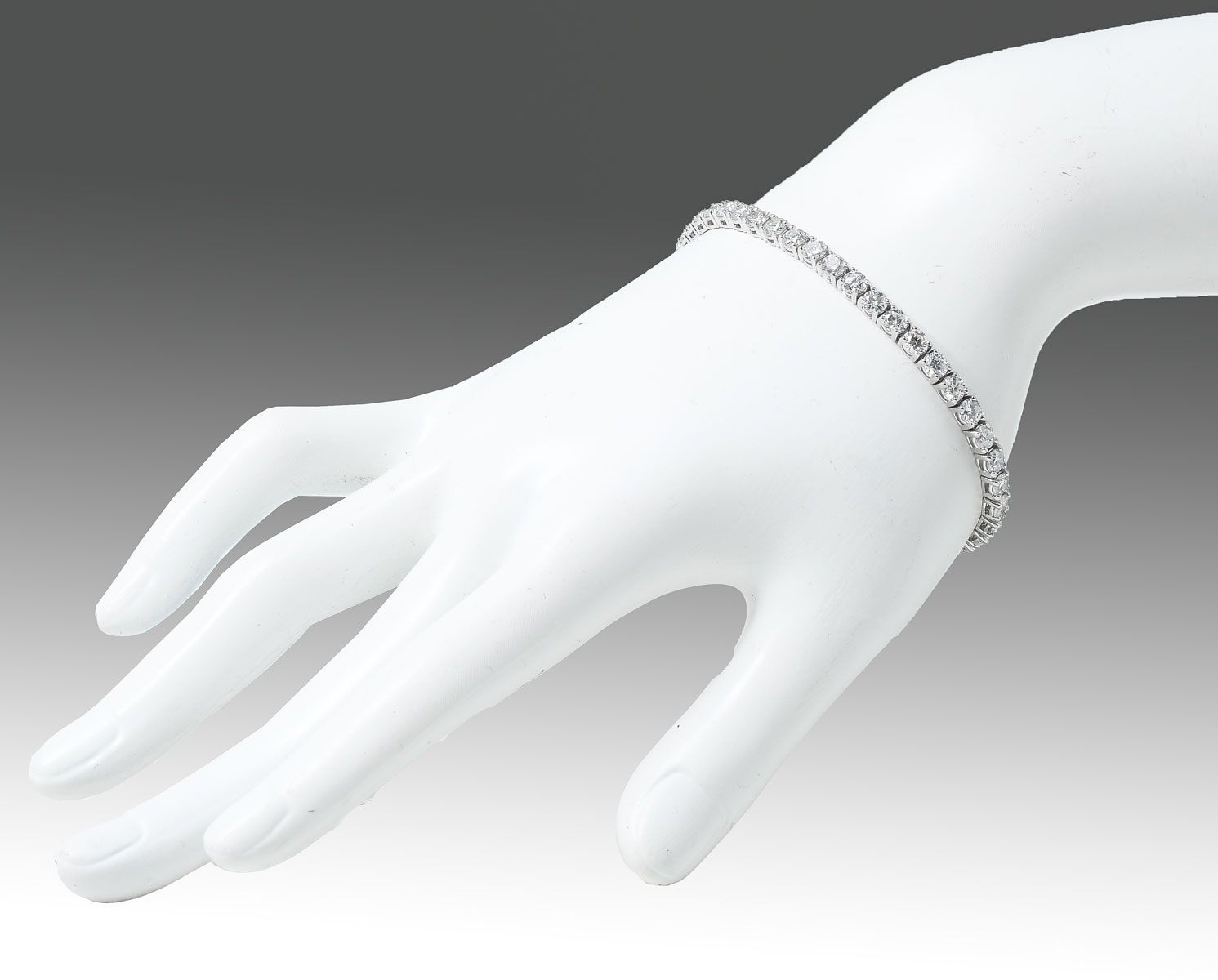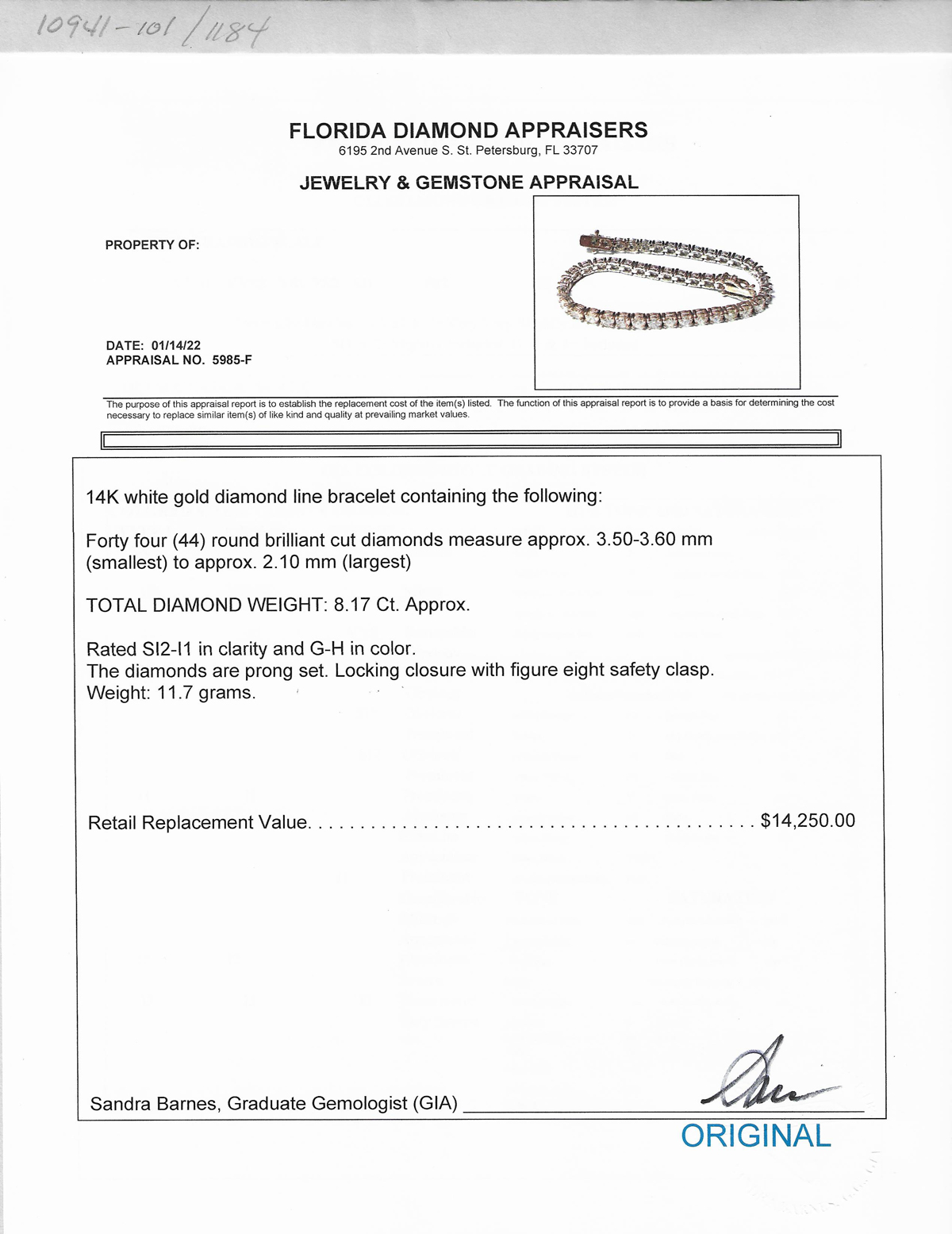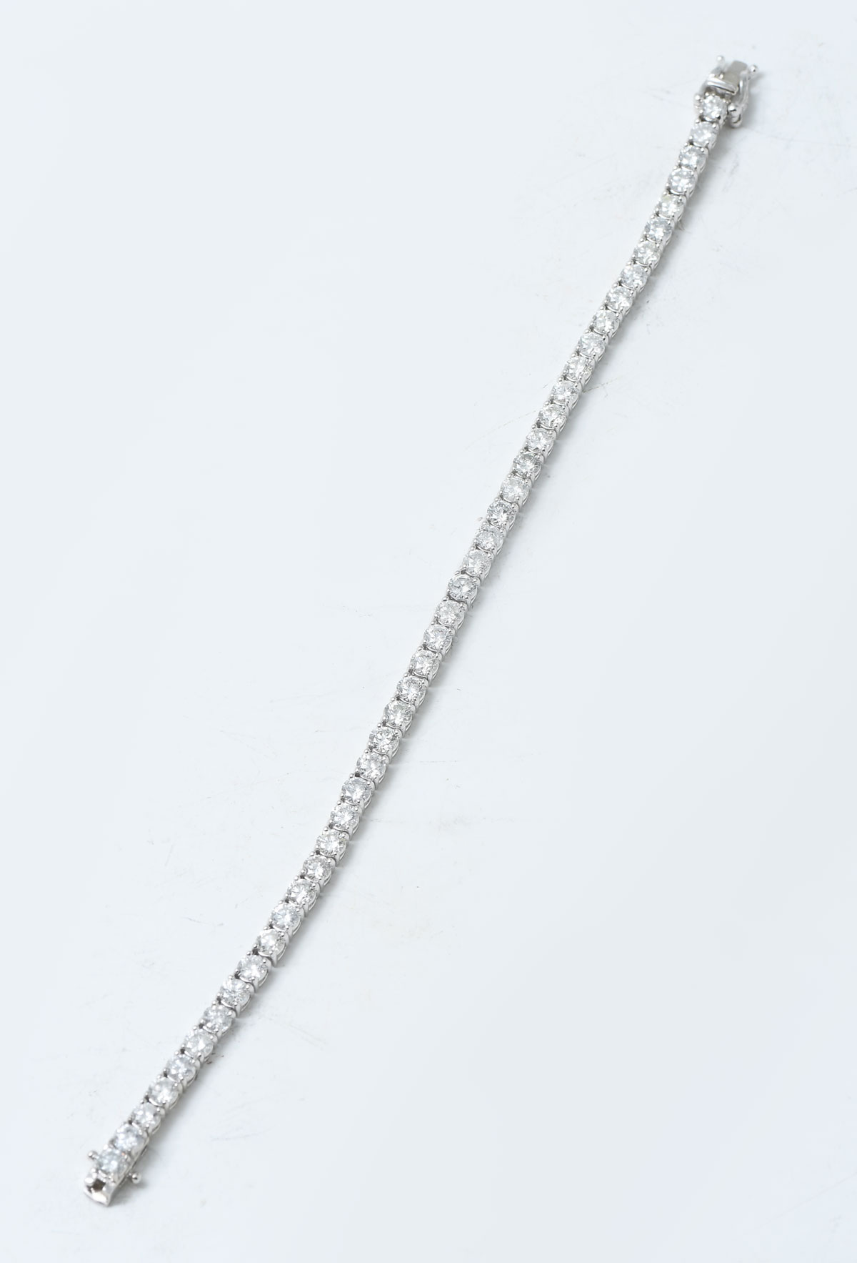 14K 8.17 CTW DIAMOND BRACELET: 44 round brilliant cut diamonds are prong set in-line in this 14K white gold bracelet. Diamonds approx 8.17 CTW. 7.25'' in length. Total weight approx 11.76 grams. Sold with current Florida Diamond Appraisers GIA graduates appraisal for $14,250. Est. $8000/15000**