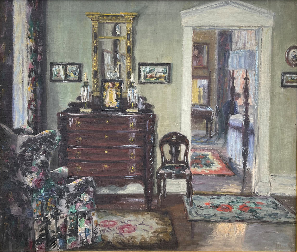 COCHRANE, Josephine, (American, 1864-1953): Interior Scene with Antique Furniture, Oil/Canvas, 34'' x 40'', label affixed verso, contemporary metal frame, 35.5'' x 41.5''. Est. $1500/2500**