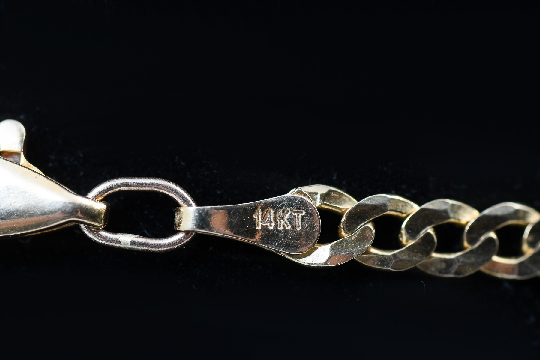 14K BEVELED FLAT CURB LINK CHAIN: 24.5'' yellow gold beveled flat curb link necklace weighs approx 15.25 grams. Est. $1000/1700**