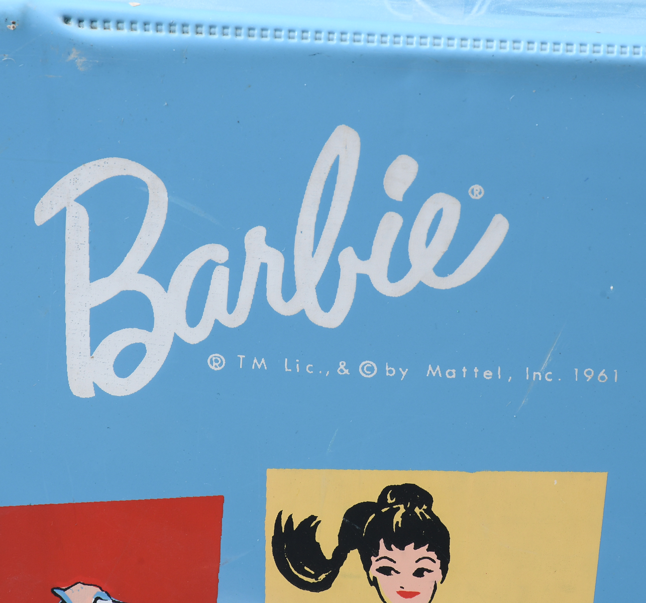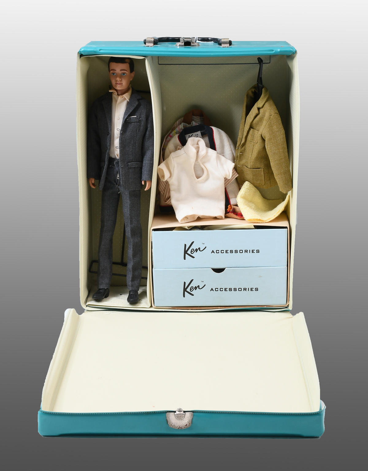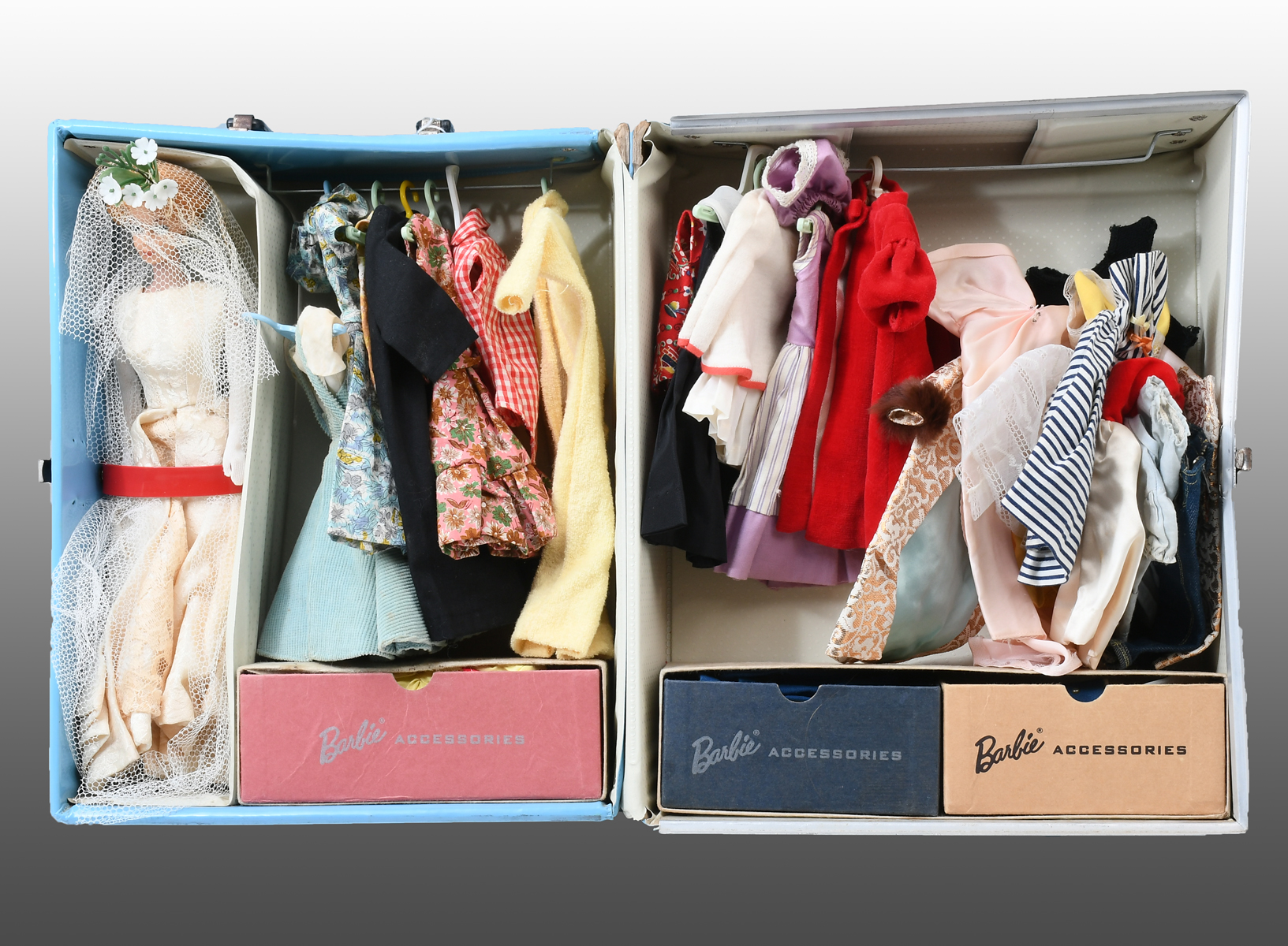 1961 KEN & BARBIE DOLLS W/CASES & CLOTHES: 1) 1961 Bridal Barbie with a doll case and more than 20 outfits plus accessories; 2) 1961 Ken doll and case with clothes and accessories including several pairs of slacks, shirts, shorts, socks, and PJs.