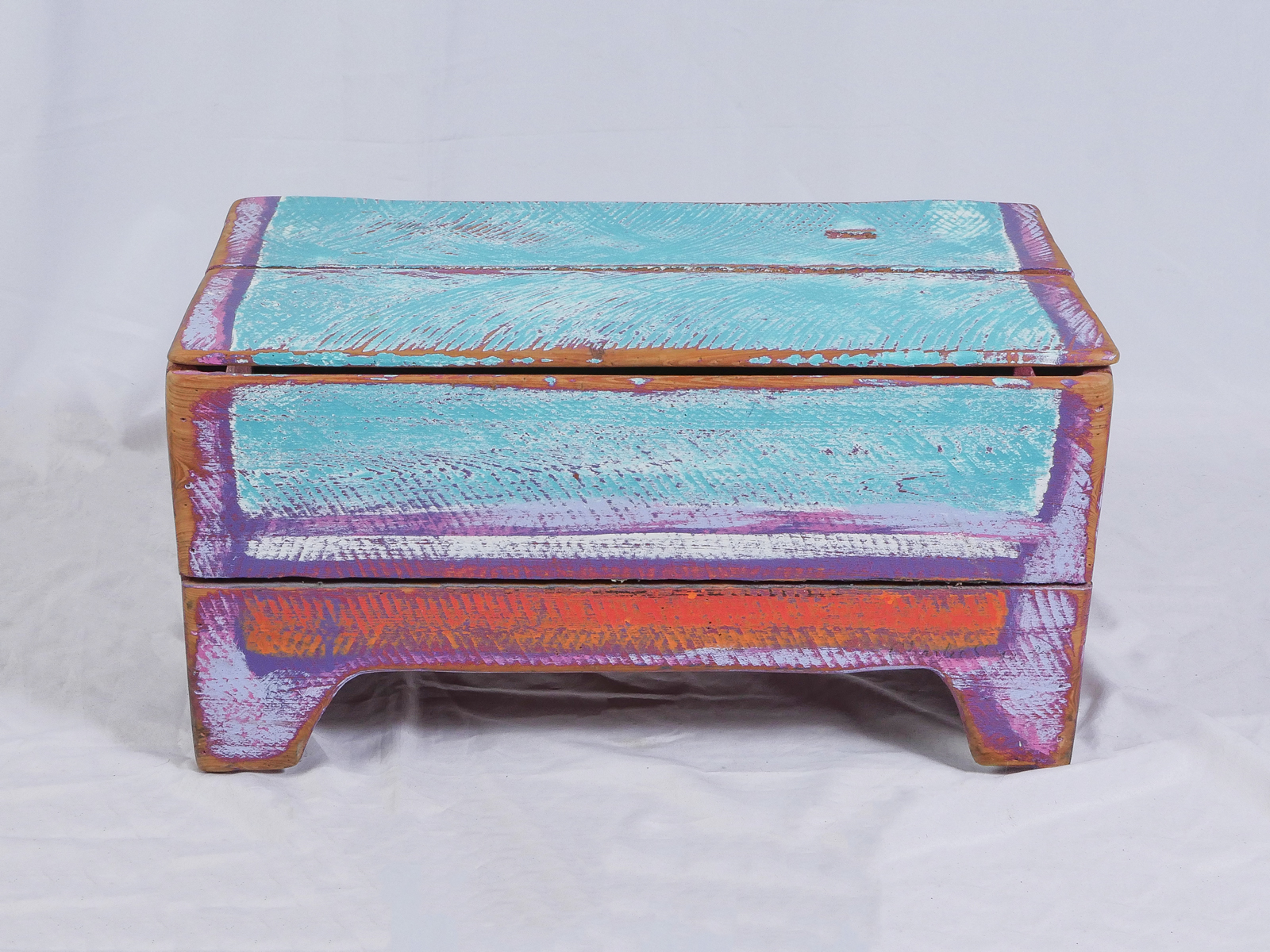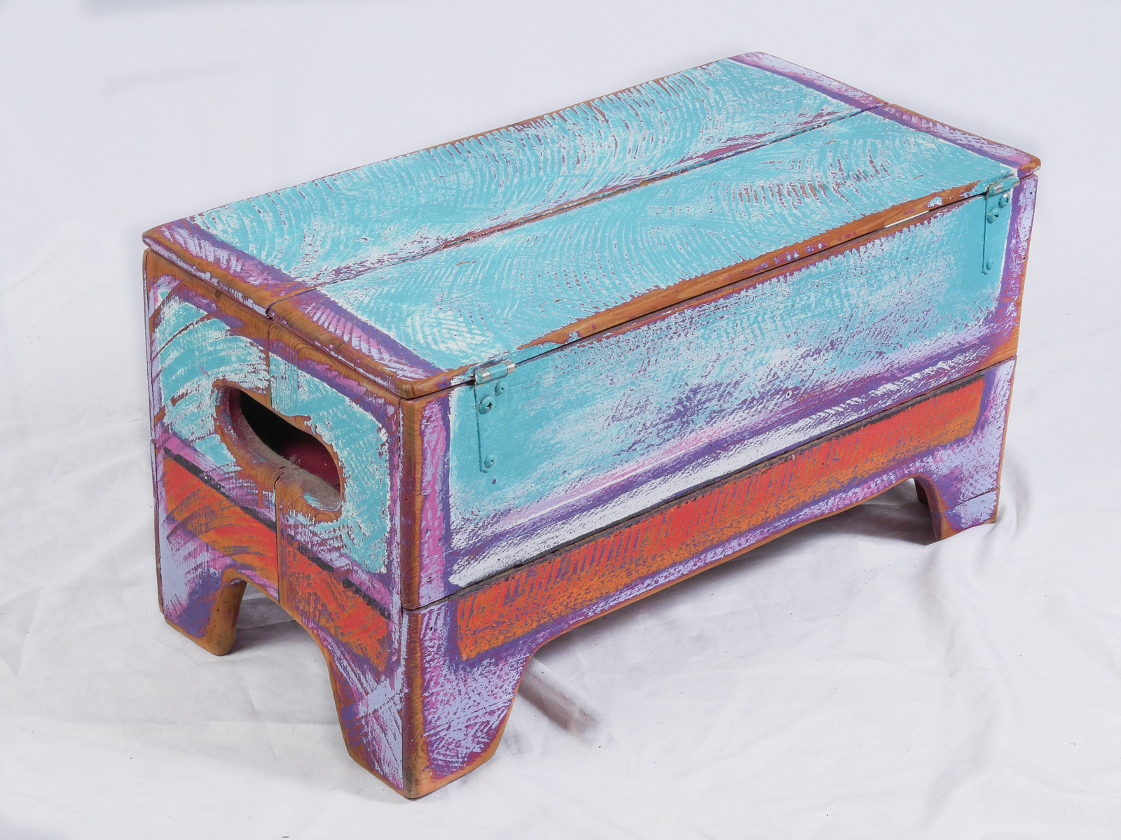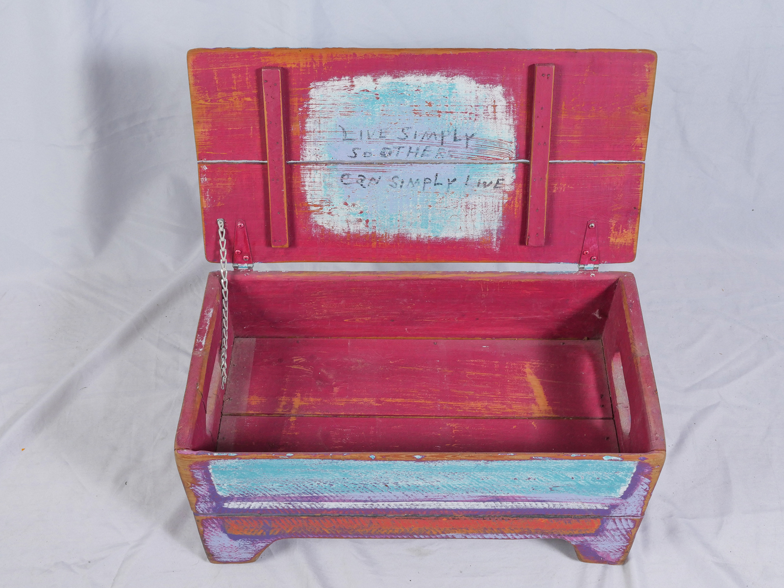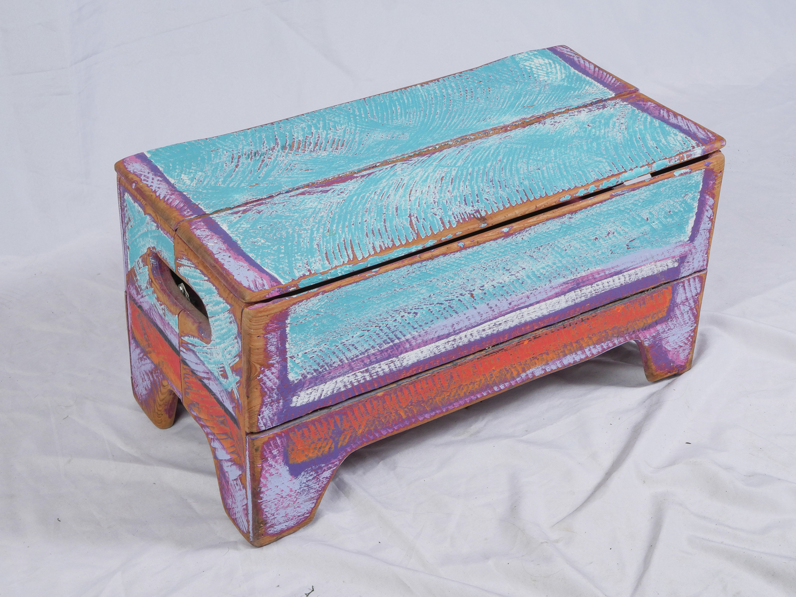 CHARLIE KACH? PAINTED CHEST FOR BEYOND TRADITION DISTINCTIVE ART FURNITURE: Lidded child's chest approximately 12.5'' in height, 24'' in width, 12'' in depth. Beyond Tradition label underneath along with signatures from Koch, dated 1992.