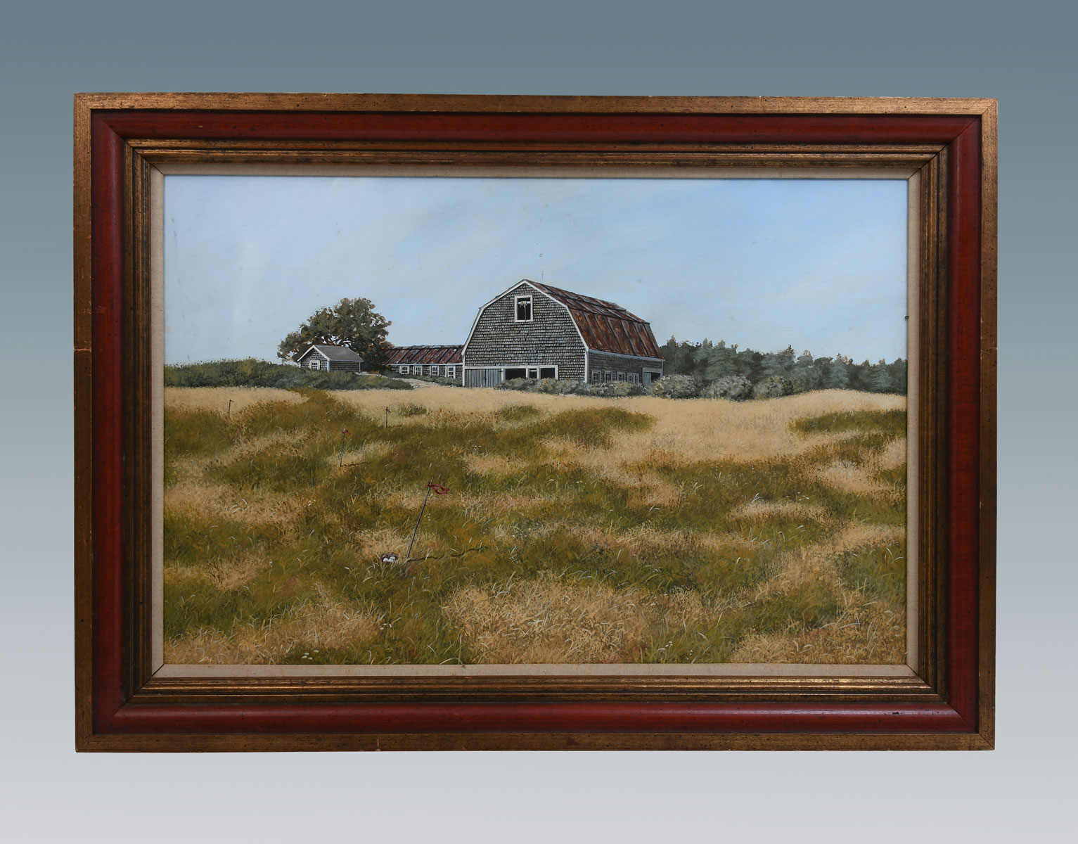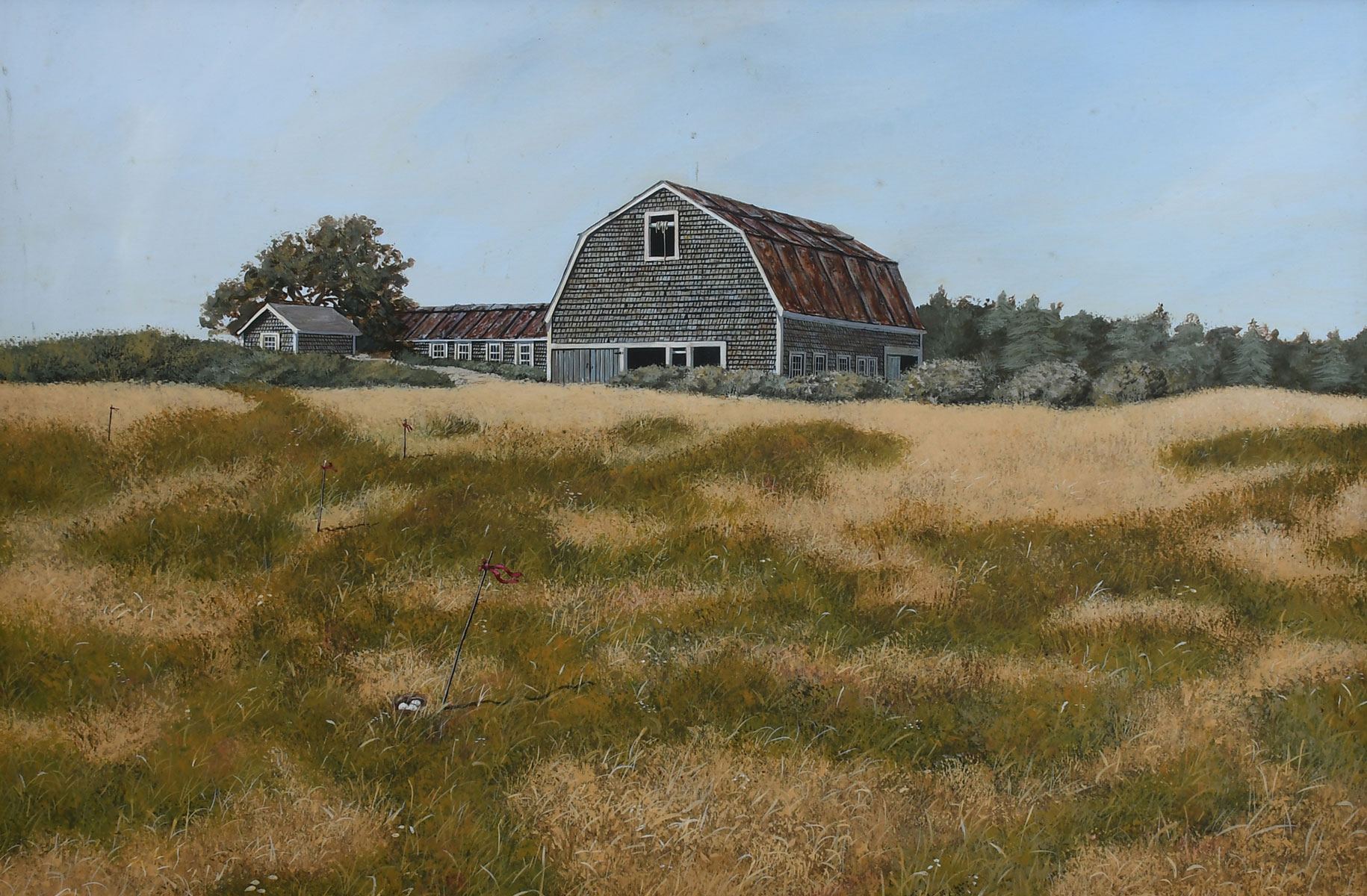 JAMES CROMARTIE STYLE BARN PAINTING WITH BIRDNESTS: From the same estate as Cromartie painting that we have sold in the past, consignor thought this was as well, but no visible signature. Depicts a Pasture with Barn and Marked Bird Nests with Eggs, Oil/Masonite, 15.75'' x 24'', framed, 20'' x 28''.