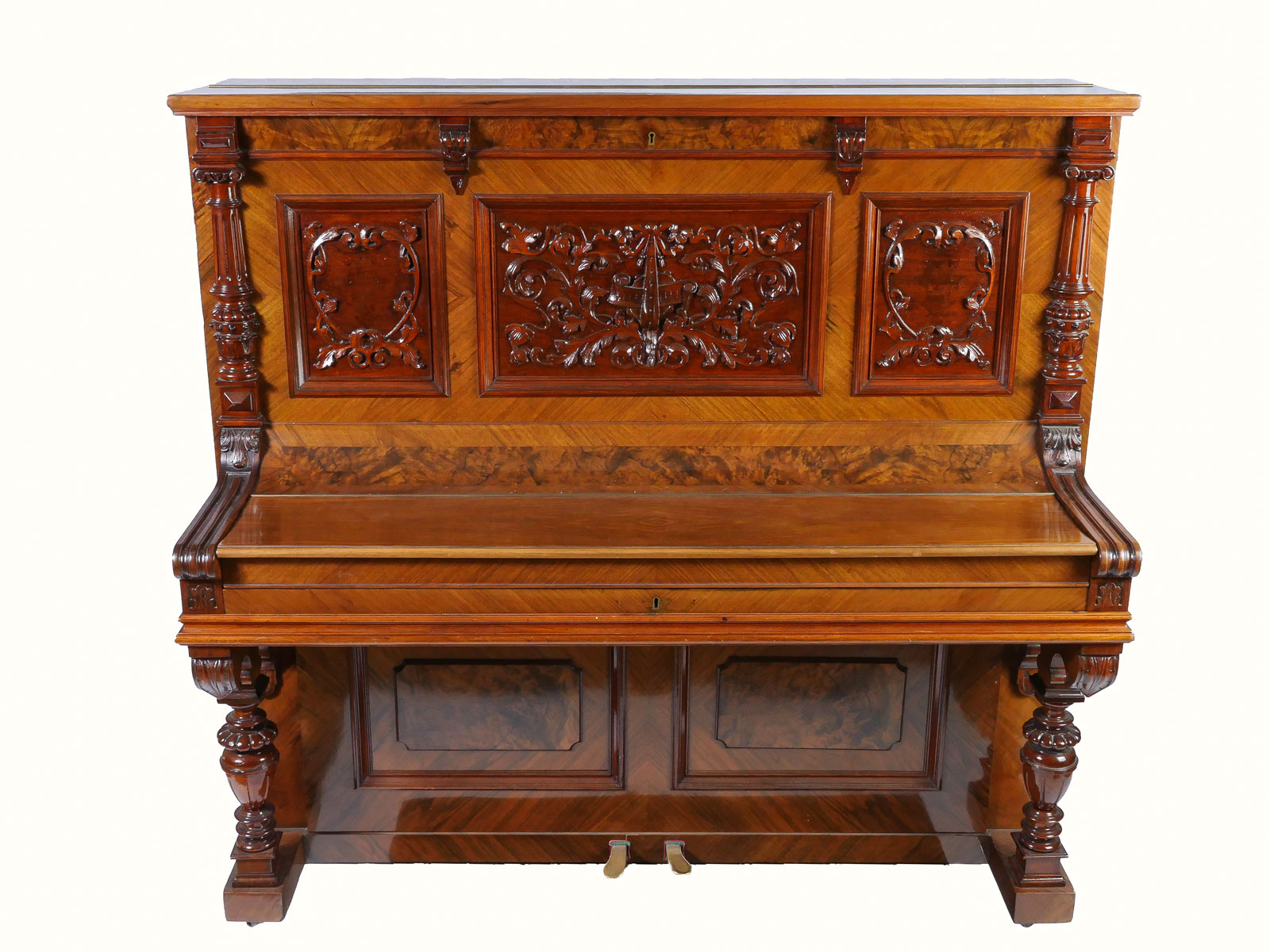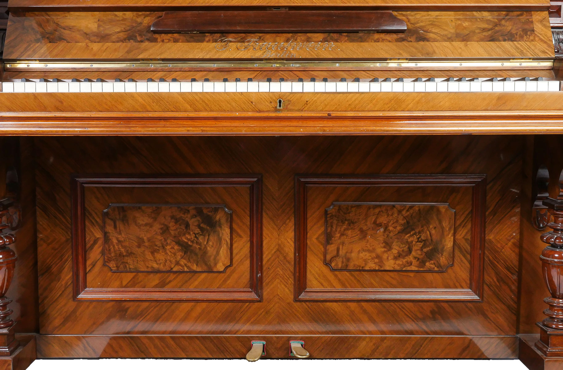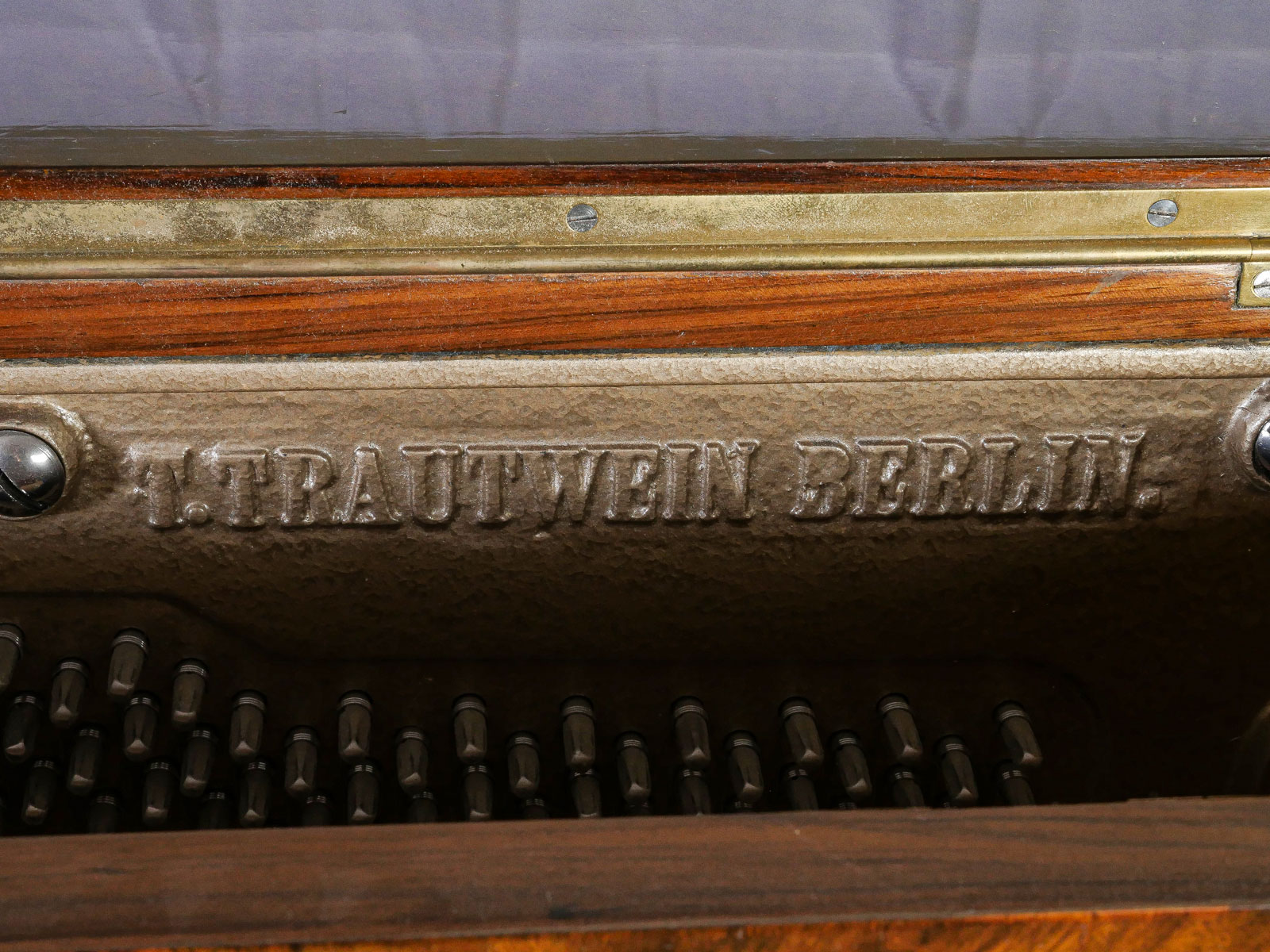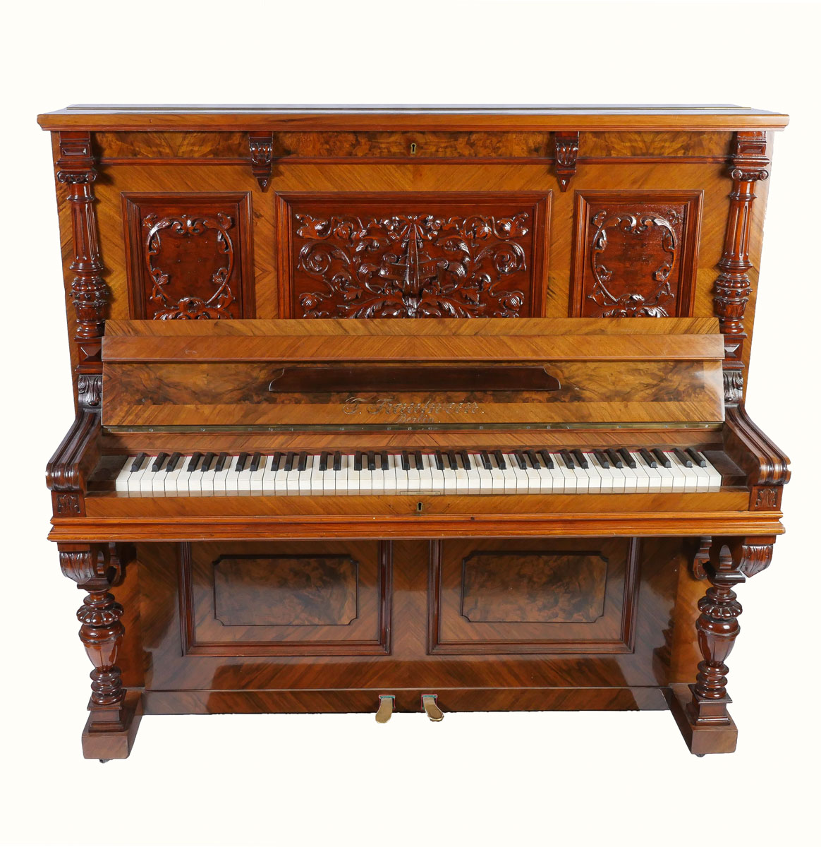 HIGHLY CARVED GERMAN UPRIGHT TRAUTWEIN PIANO: Serial #24708, circa 1910. Having carved foliate & instrumental panels, flanked by finely carved half-columns. Incised ''T. Trautwein, Berlin'', below sheet music ledge. Beautiful interior possibly needs tuning. Well maintained example of German craftsmanship. Approx. 54.25'' h x 59'' l x 28'' w. Est. $2000/4000**