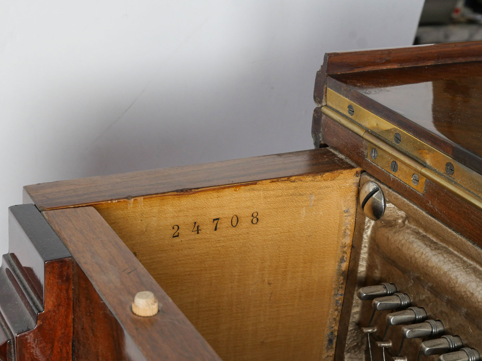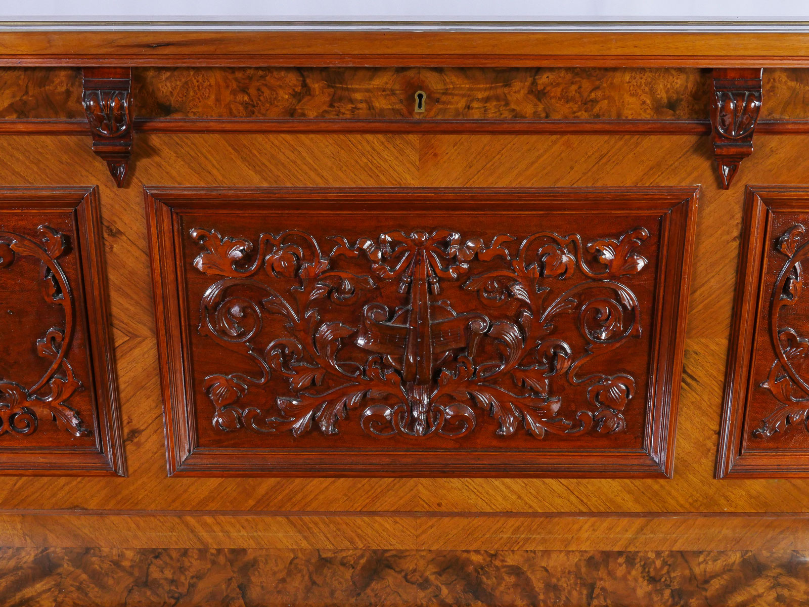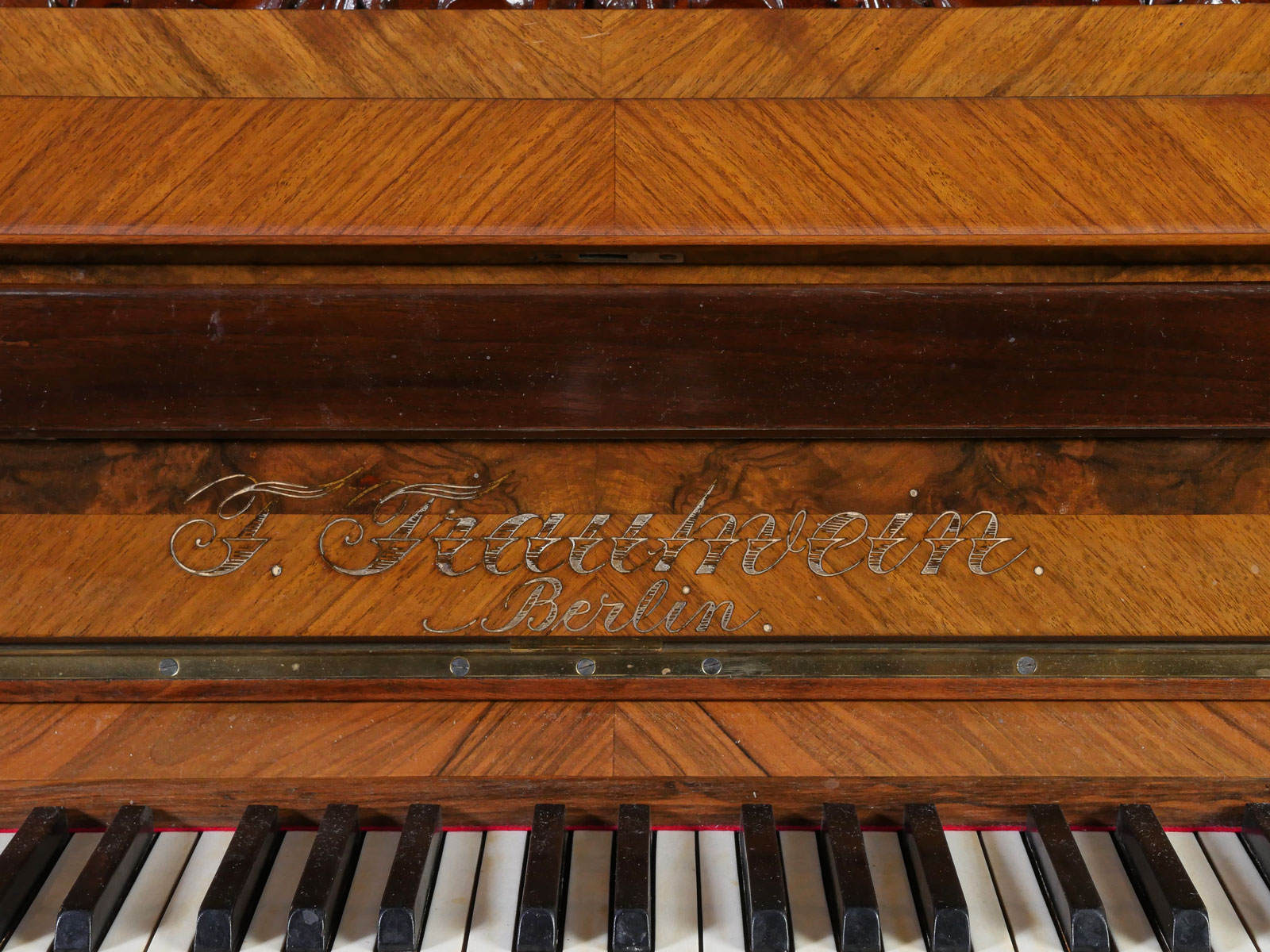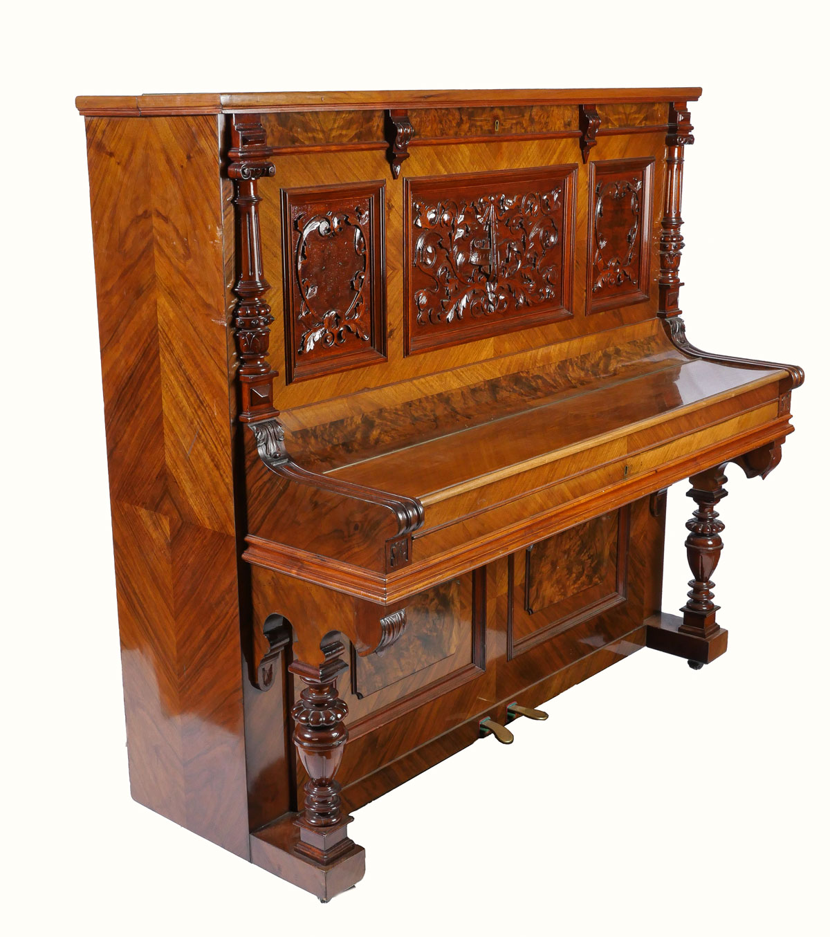 HIGHLY CARVED GERMAN UPRIGHT TRAUTWEIN PIANO: Serial #24708, circa 1910. Having carved foliate & instrumental panels, flanked by finely carved half-columns. Incised ''T. Trautwein, Berlin'', below sheet music ledge. Beautiful interior possibly needs tuning. Well maintained example of German craftsmanship. Approx. 54.25'' h x 59'' l x 28'' w. Est. $2000/4000**