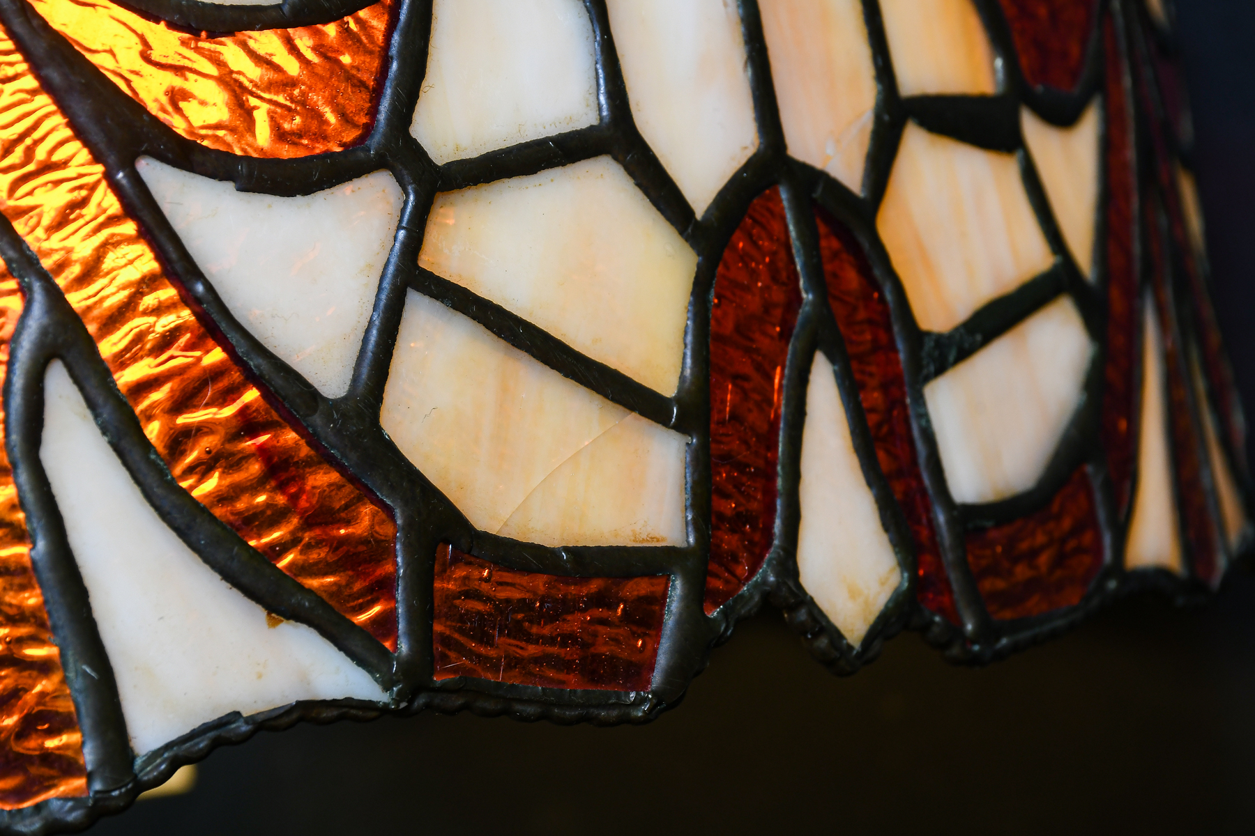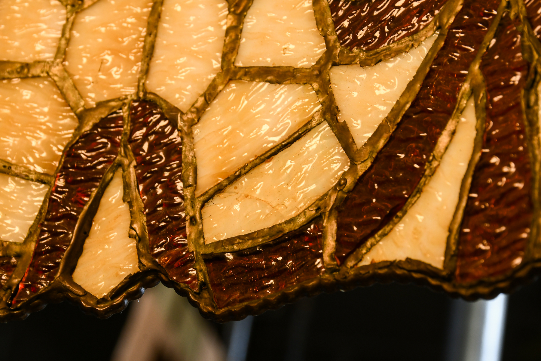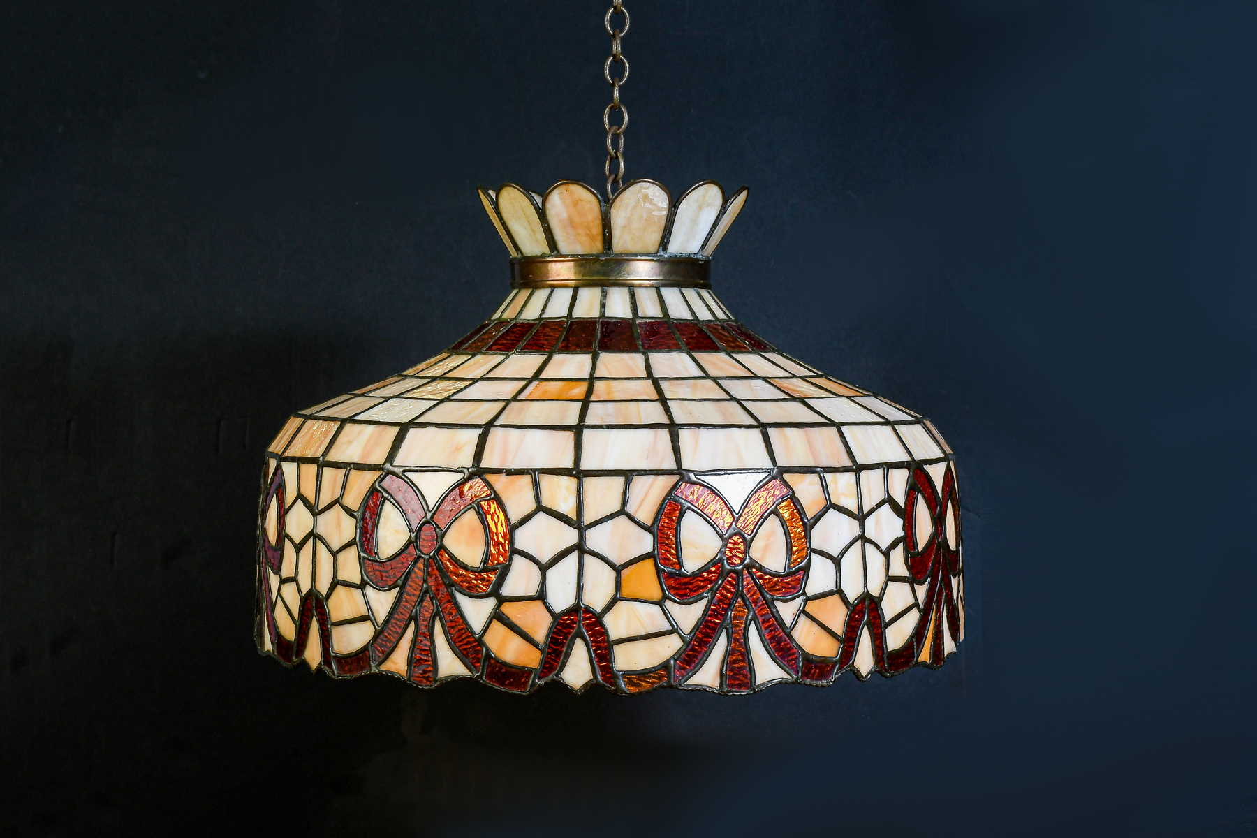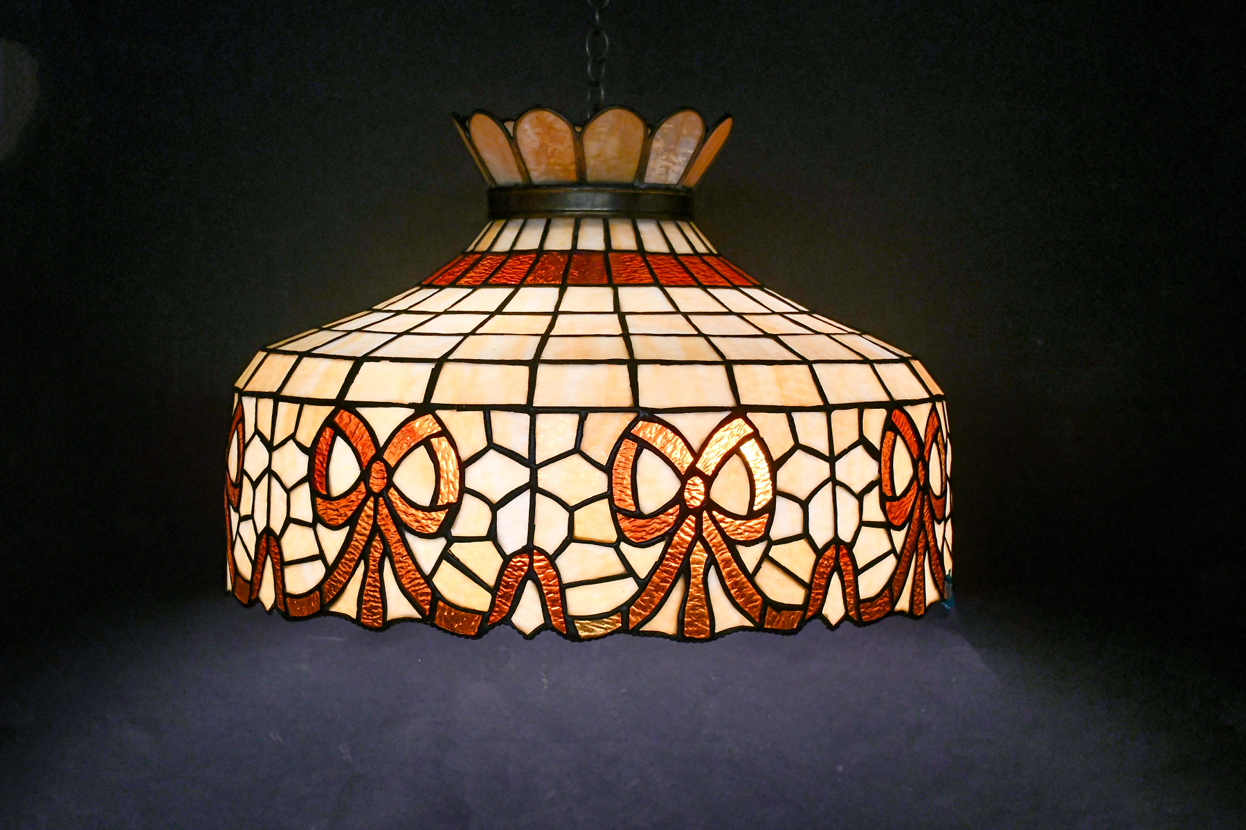 RIBBON MOTIF STAINED GLASS HANGING LIGHT: Caramel slag glass 3- light chandelier, having an overall ribbon motif. Removable upper collar reveals a ''Larry's Fashion Mfg. Co.'', metal tag. Approx. 14.5'' h x 22'' w.