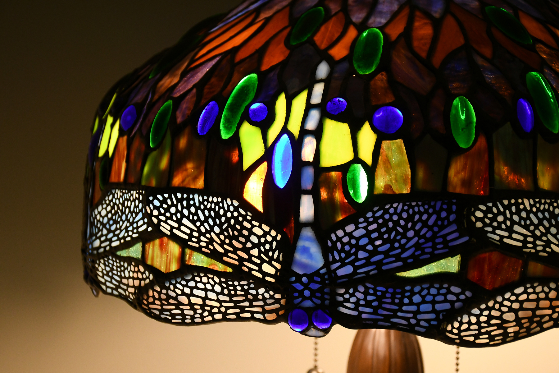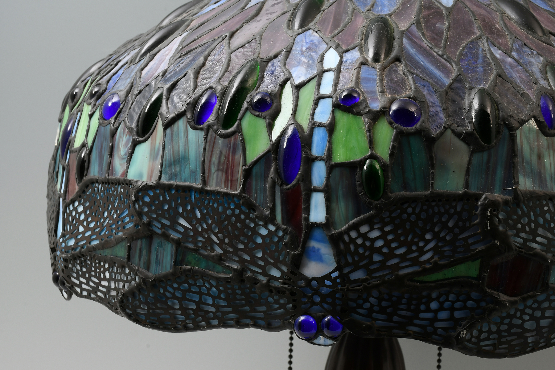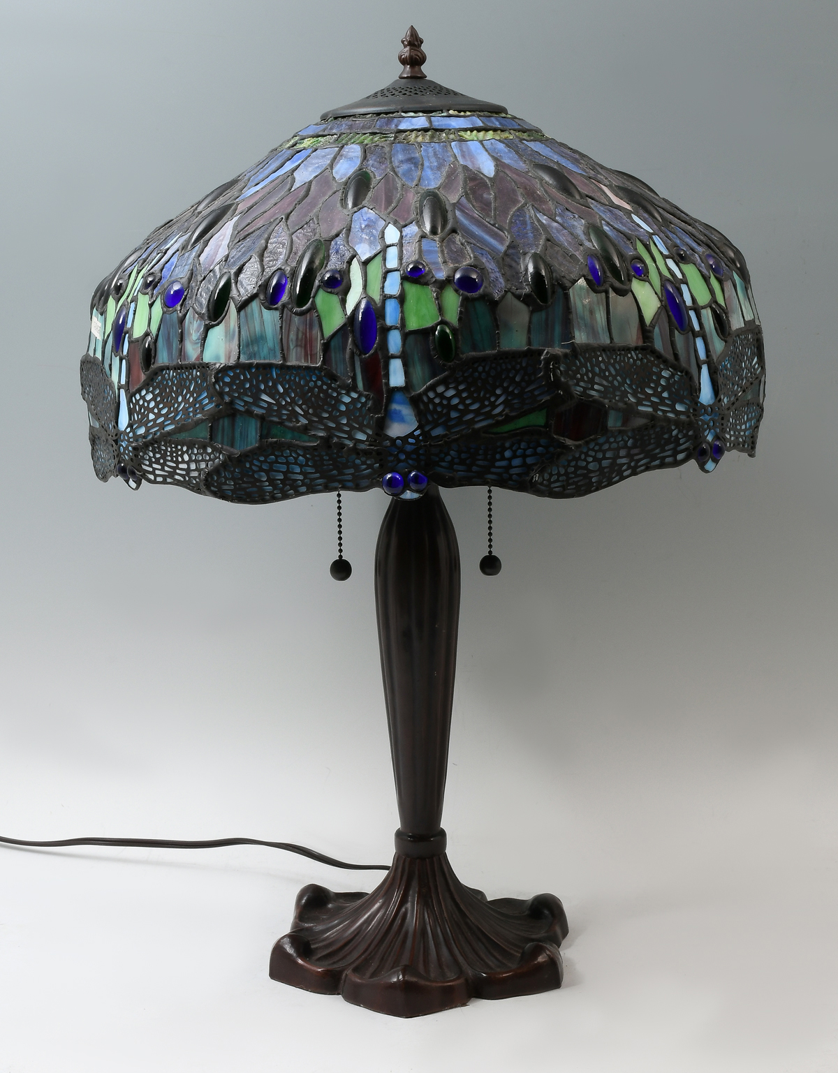 CONTEMPORARY LEADED GLASS DRAGONFLY LAMP: Colorful stained glass shade with an encompassing Dragonfly border. Resting on a patinated metal floriform 2 light base with ball form pulls. Approx. 24.5'' h x 17.5'' w.
