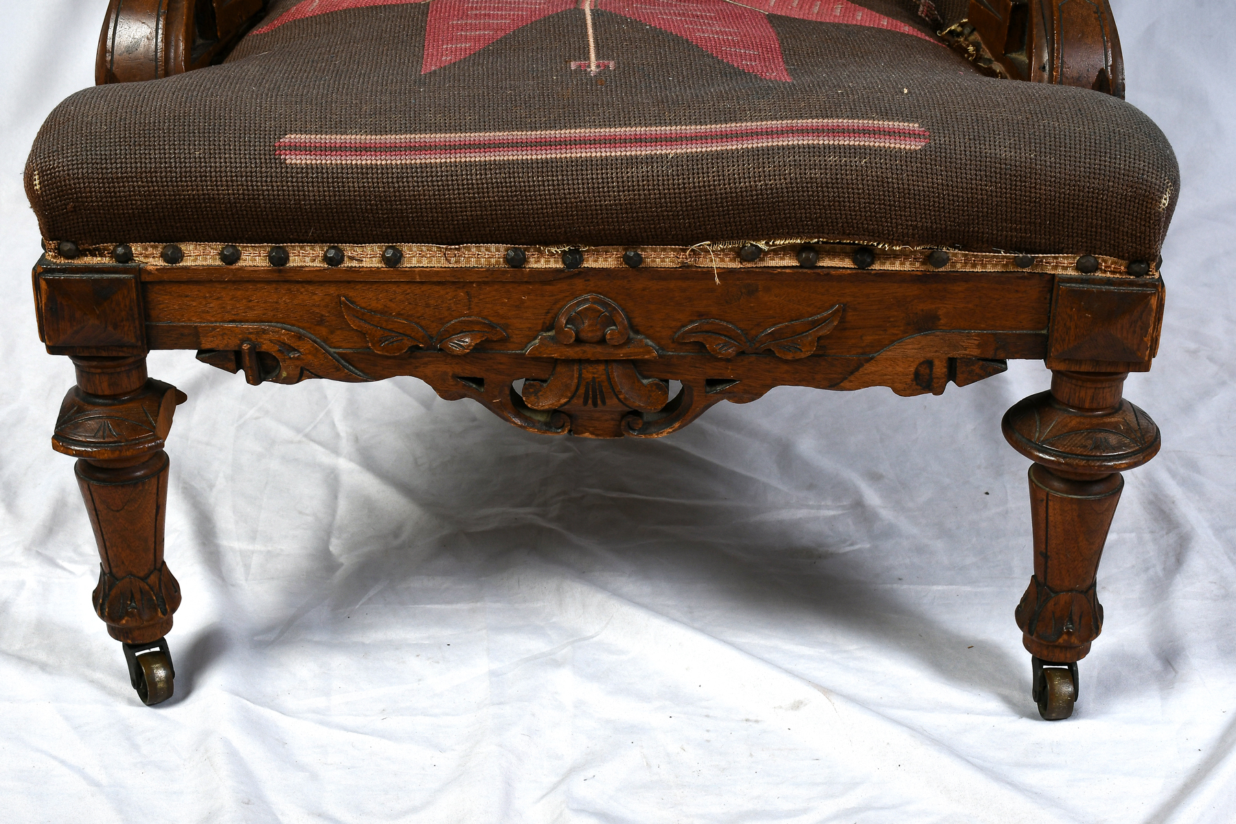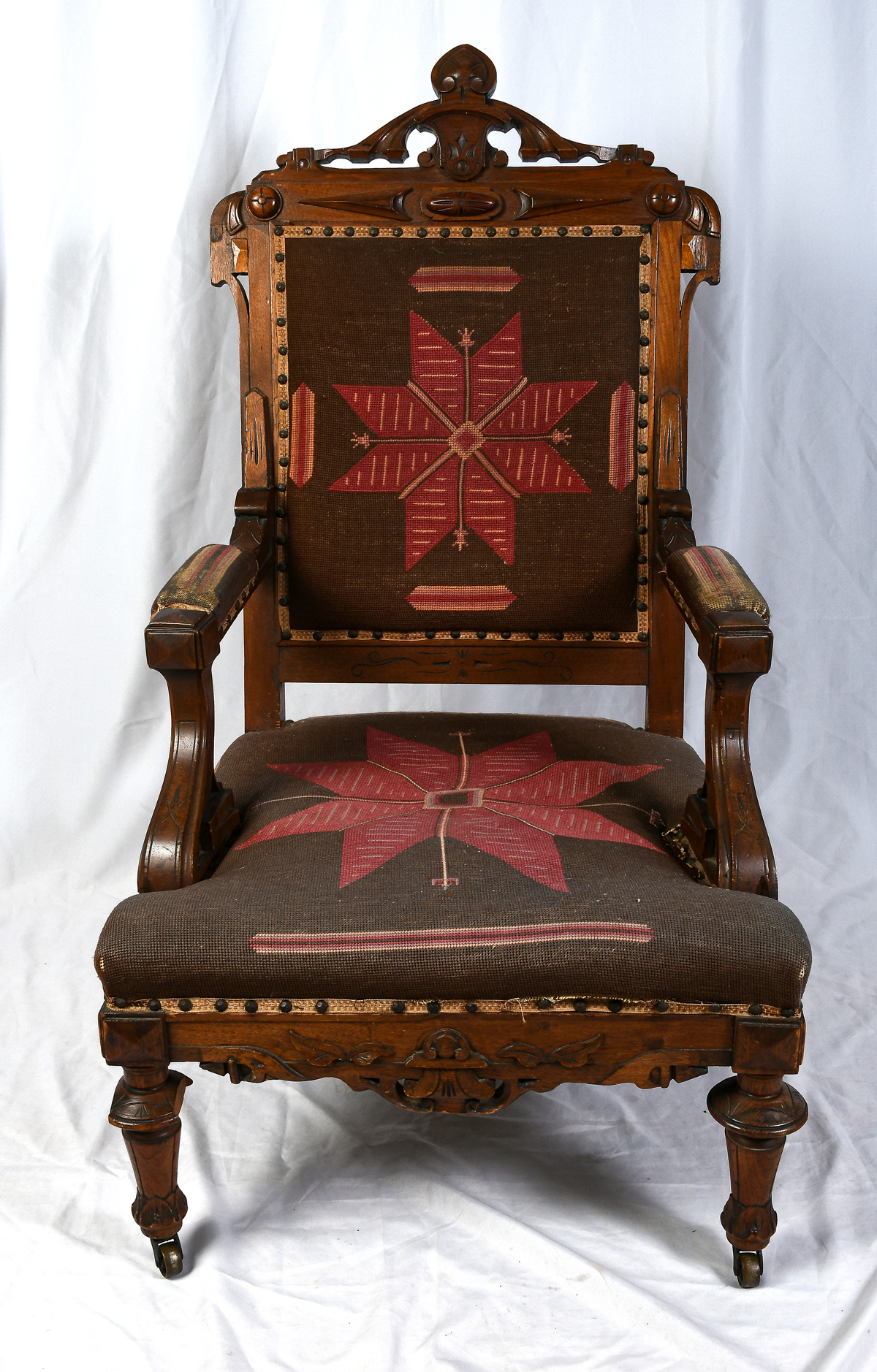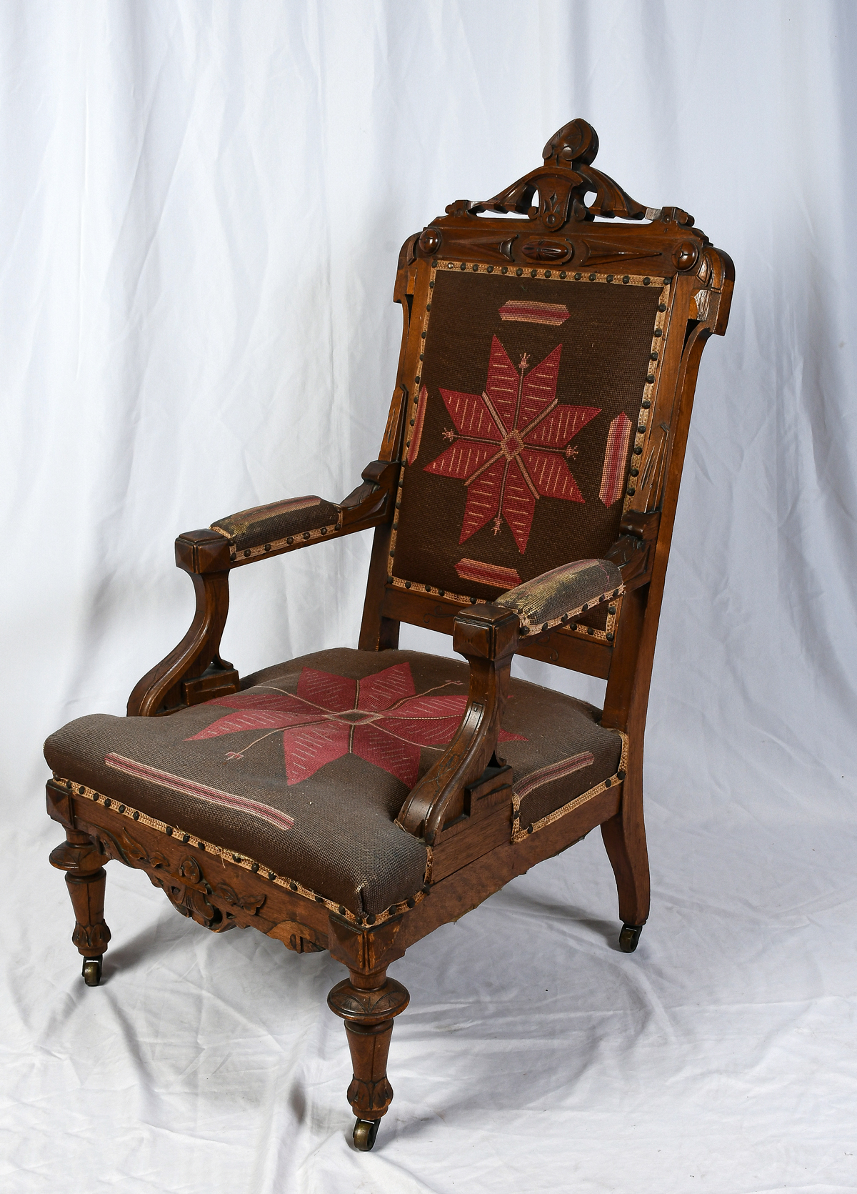 VICTORIAN AESTHETIC MOVEMENT NEEDLEPOINT CHAIR: Carved Victorian armchair, having stylized needlepoint floral medallion. Raised on turned & carved legs with foliate feet & metal casters. Approx. 43.5'' h x 25.5'' w x 30'' d. Est. $400/600**