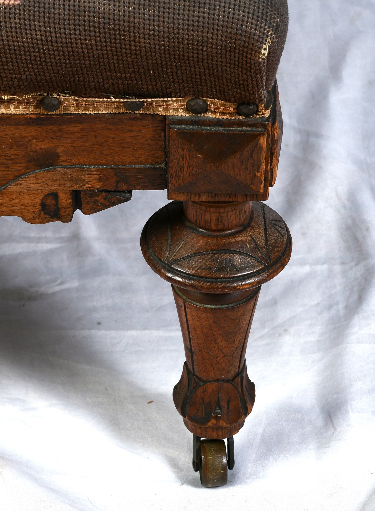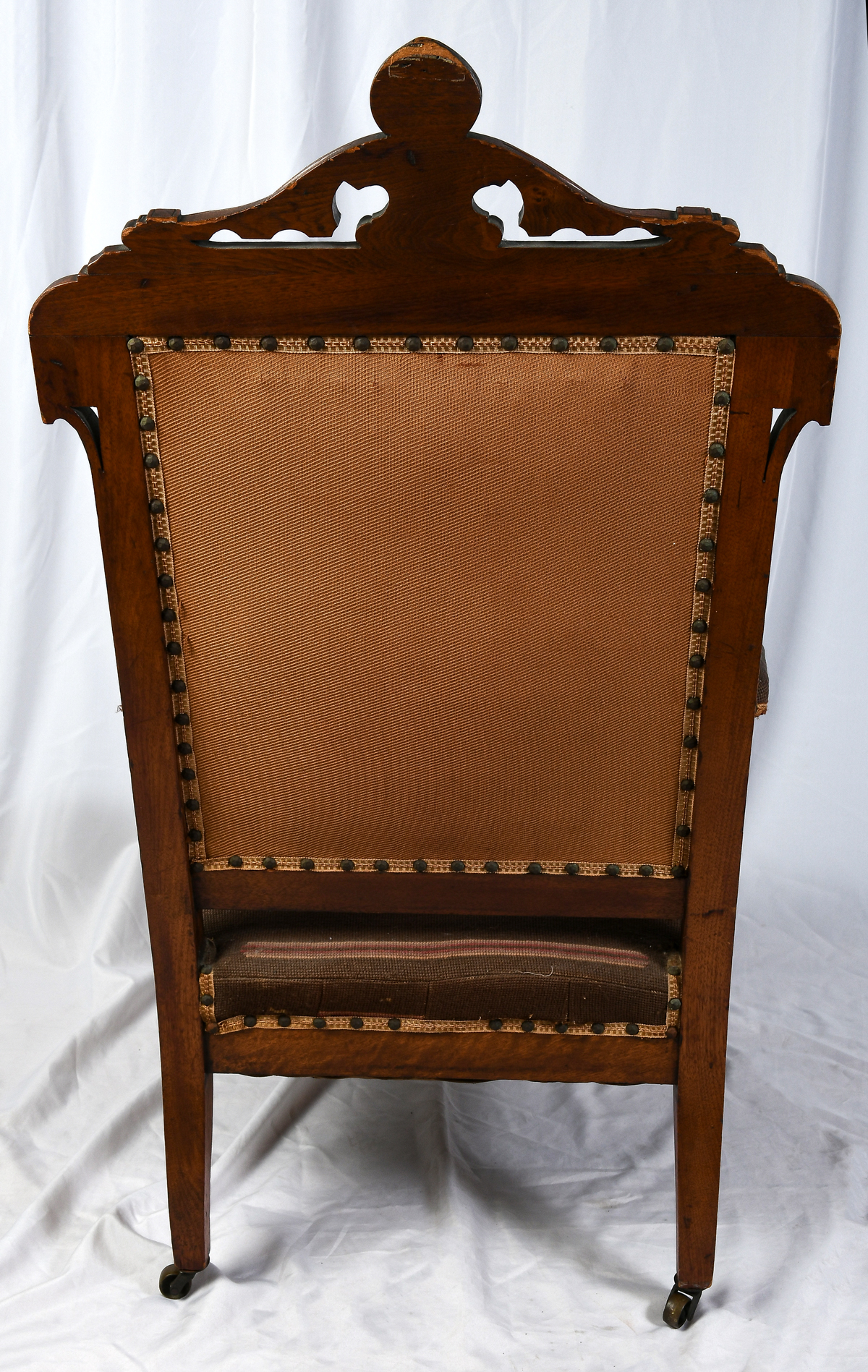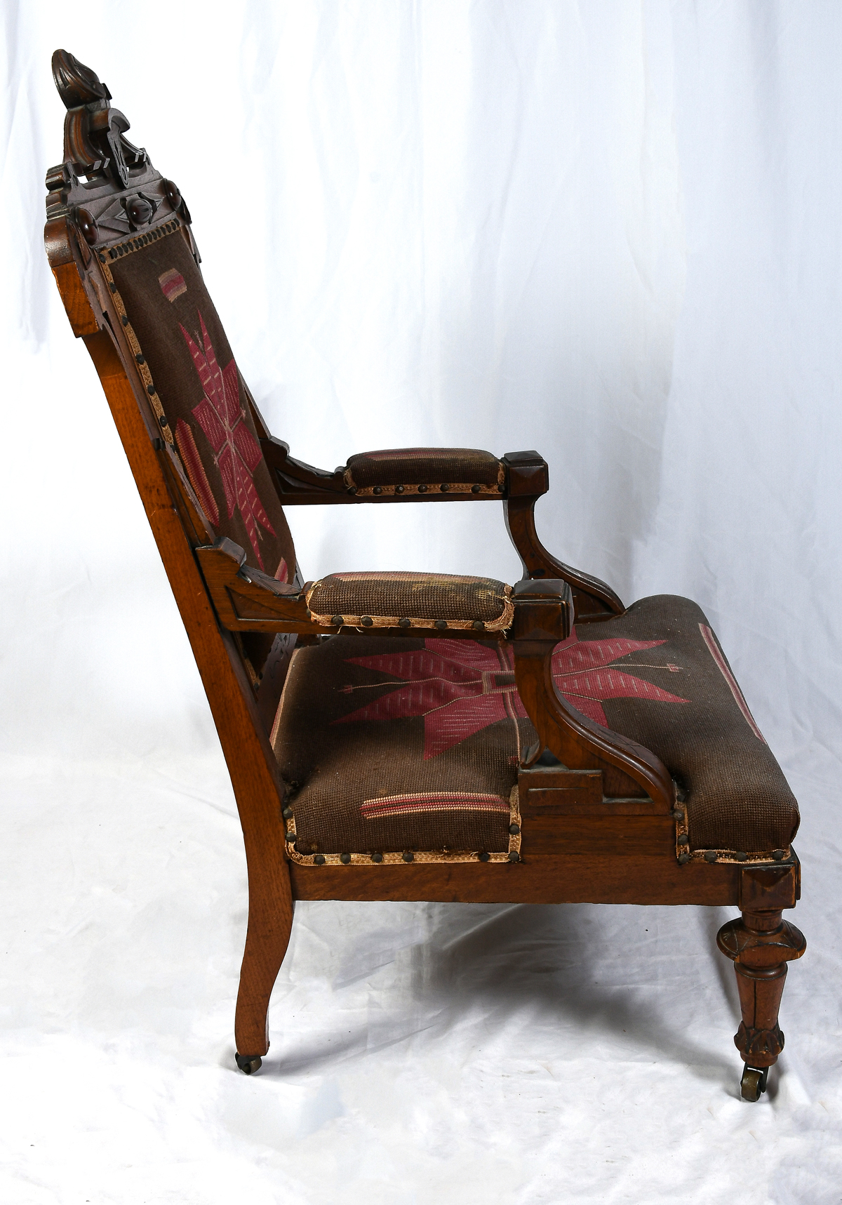 VICTORIAN AESTHETIC MOVEMENT NEEDLEPOINT CHAIR: Carved Victorian armchair, having stylized needlepoint floral medallion. Raised on turned & carved legs with foliate feet & metal casters. Approx. 43.5'' h x 25.5'' w x 30'' d. Est. $400/600**