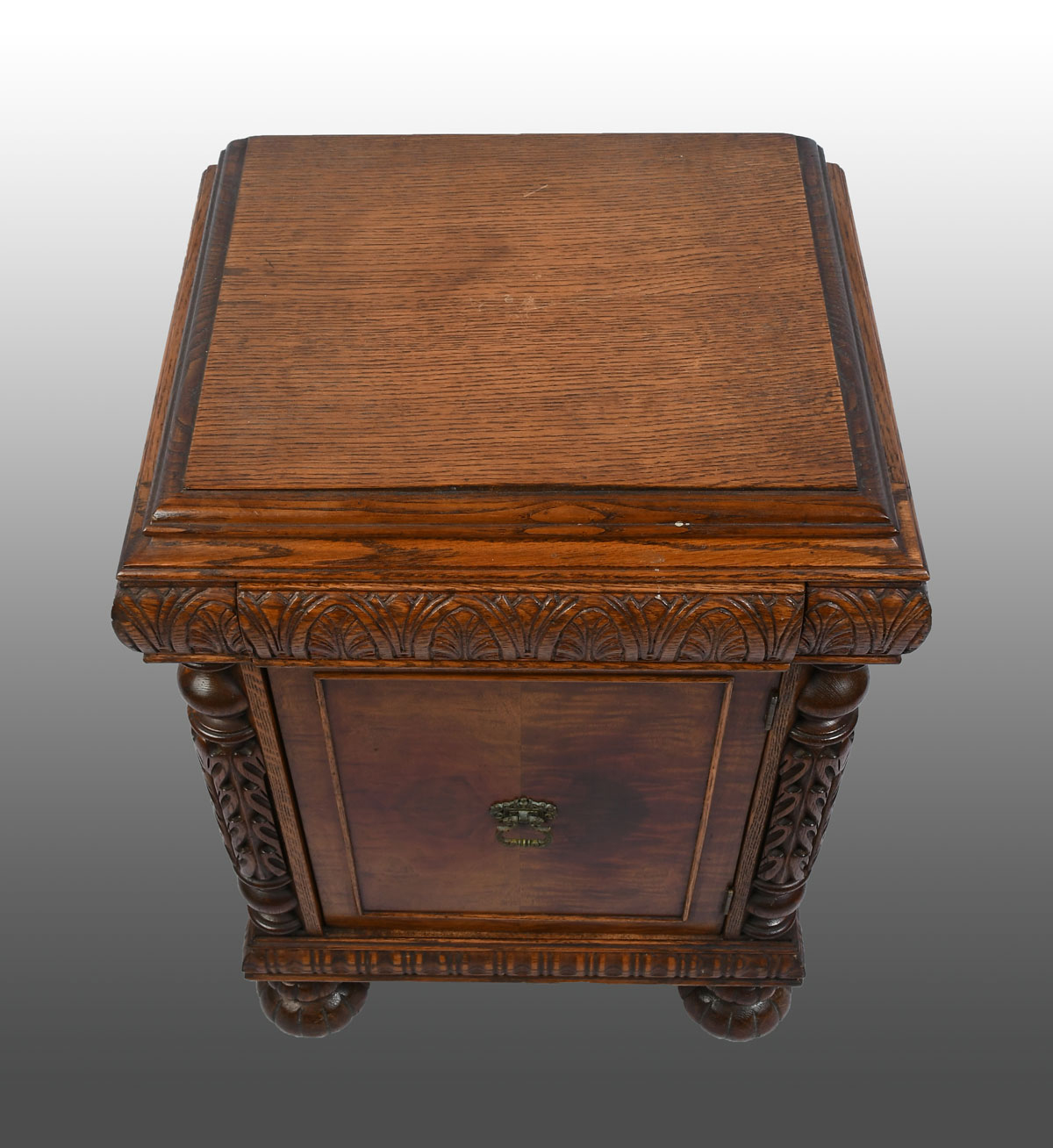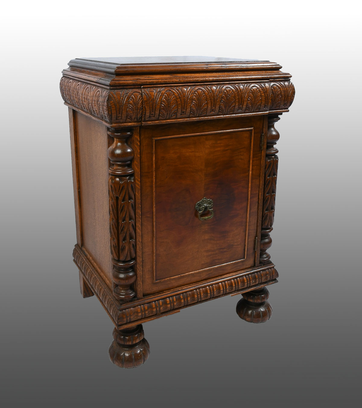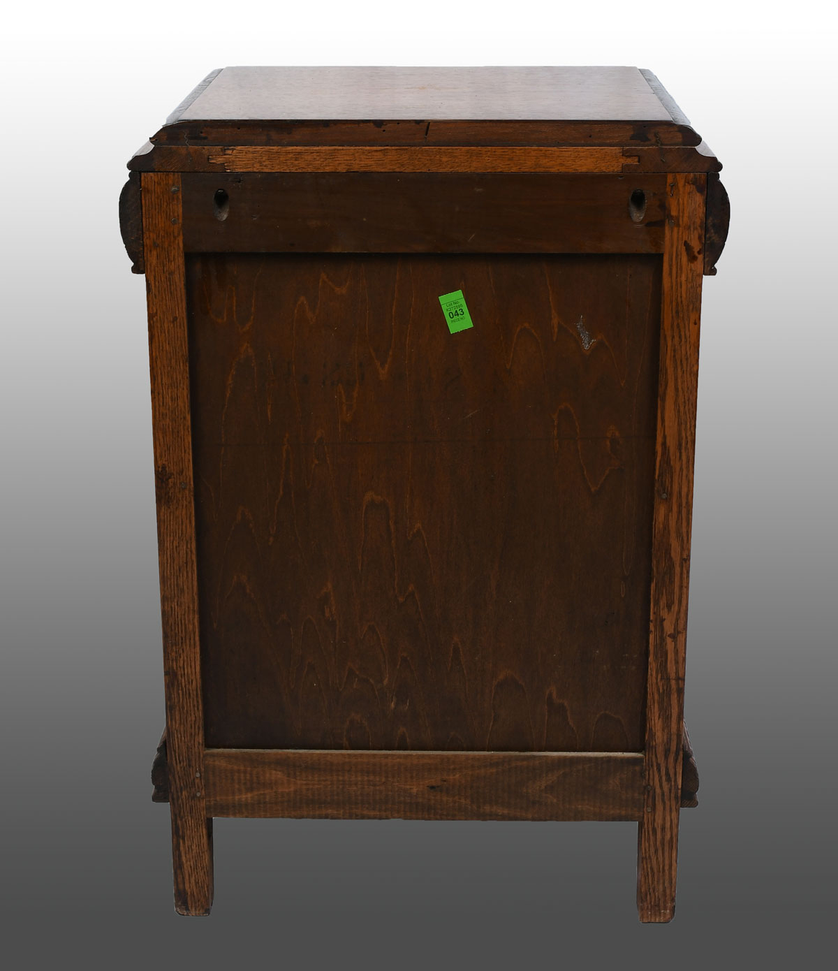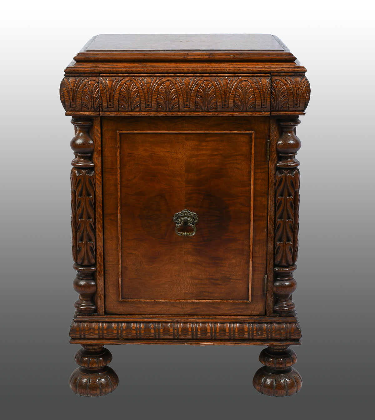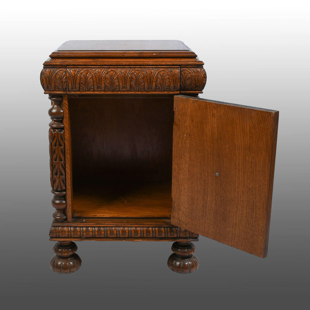 VICTORIAN STYLE CARVED OAK ONE DRAWER STAND: Single drawer cabinet, having a carved foliate motif. Raised on round ribbed feet. Approx. 28'' h x 19'' w x 15'' d. From the Estate of Franklin Wolfson, a resident of Beverly Hills, California and former President of Bugle Boy Clothing. Est. $400/500**