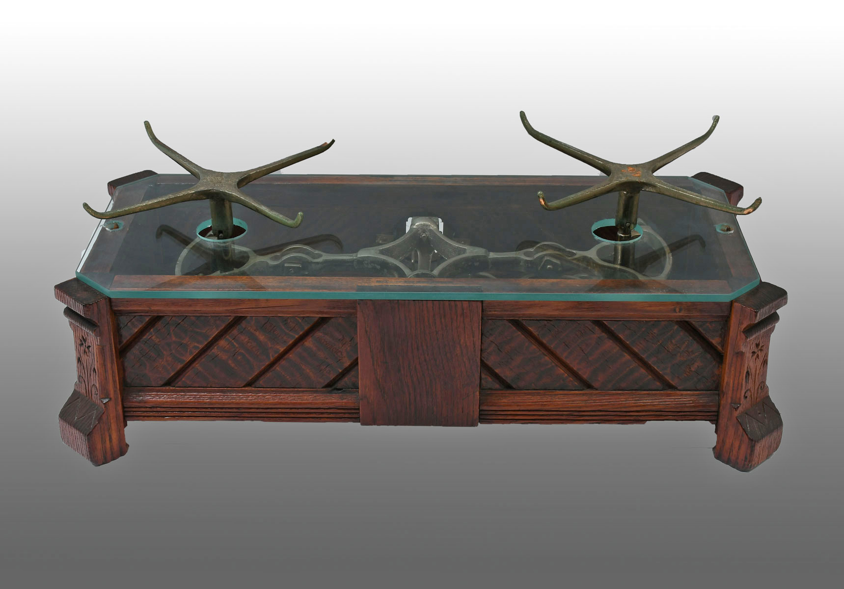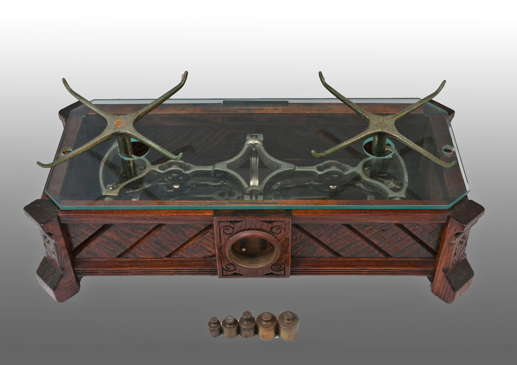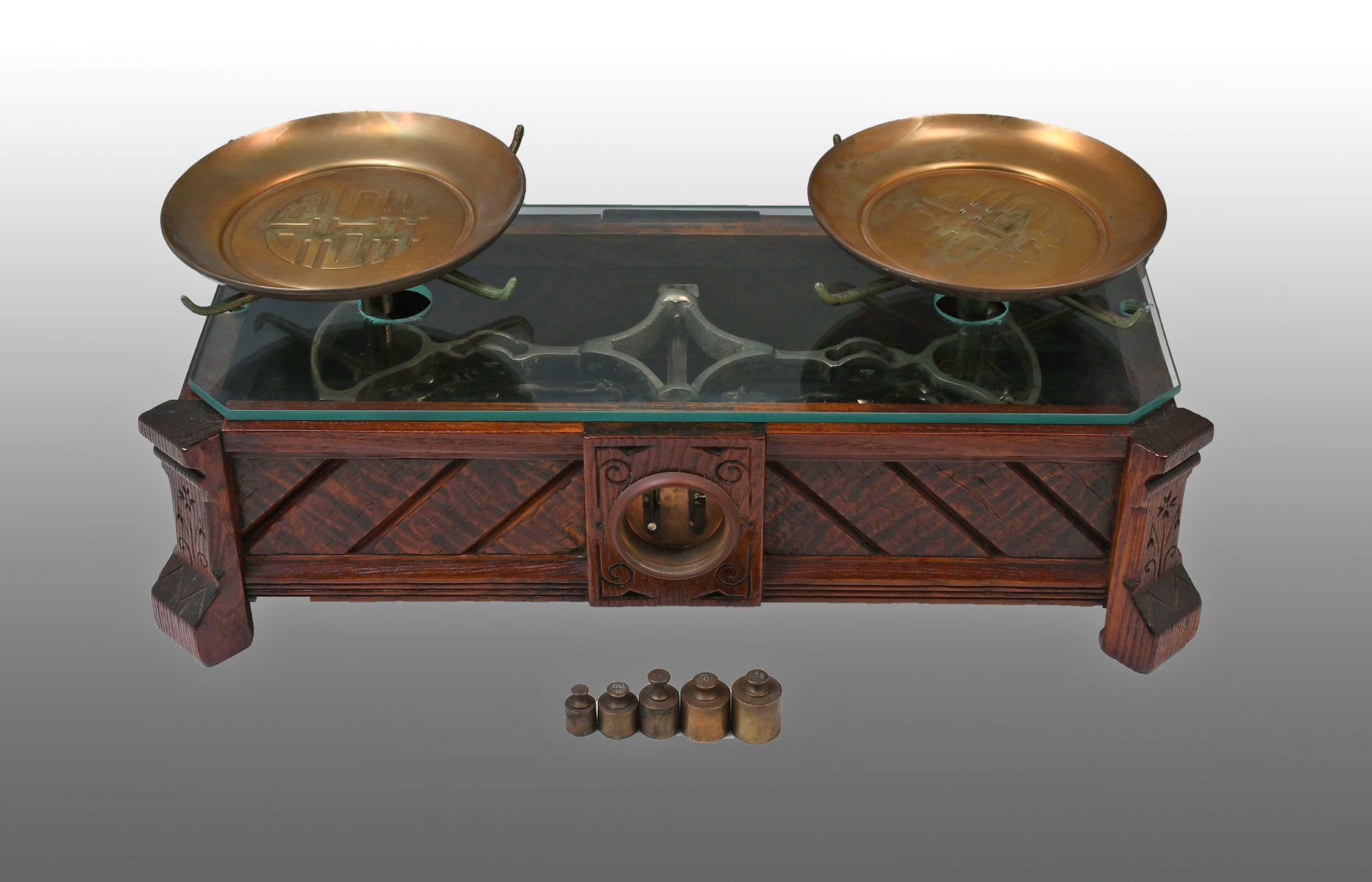 CARVED VICTORIAN BALANCE SCALE: Victorian pharmaceutical scale married with Chinese low bowls. Also included are 5 weights. Approx. 8.5'' h x 21.75'' l x 10.5'' w. From the Estate of Franklin Wolfson, a resident of Beverly Hills, California and former President of Bugle Boy Clothing. Est. $400/500**