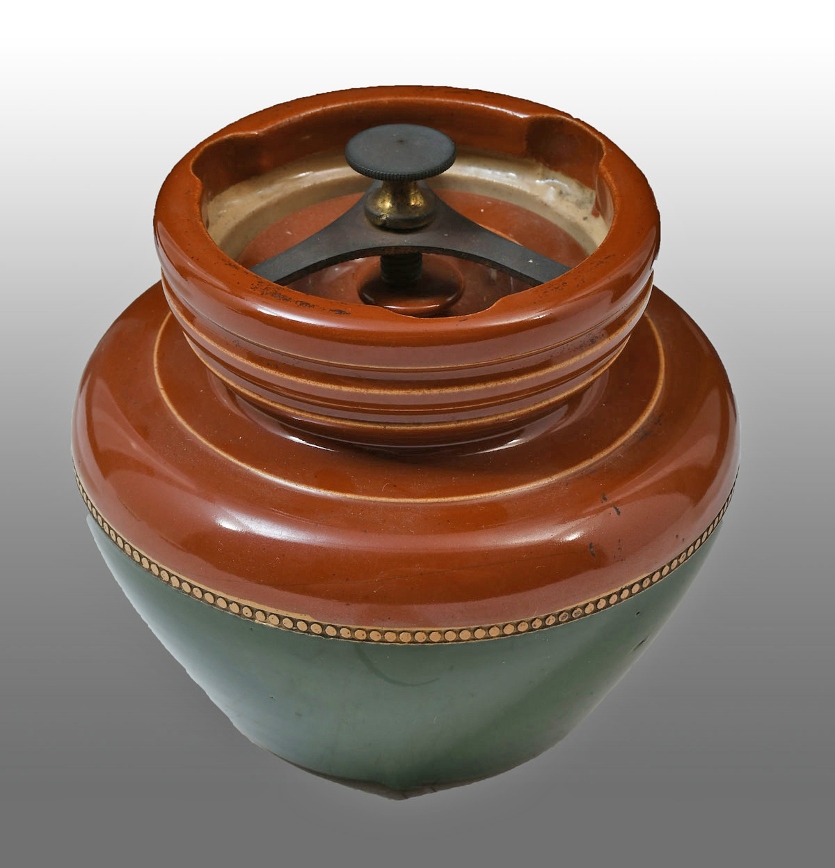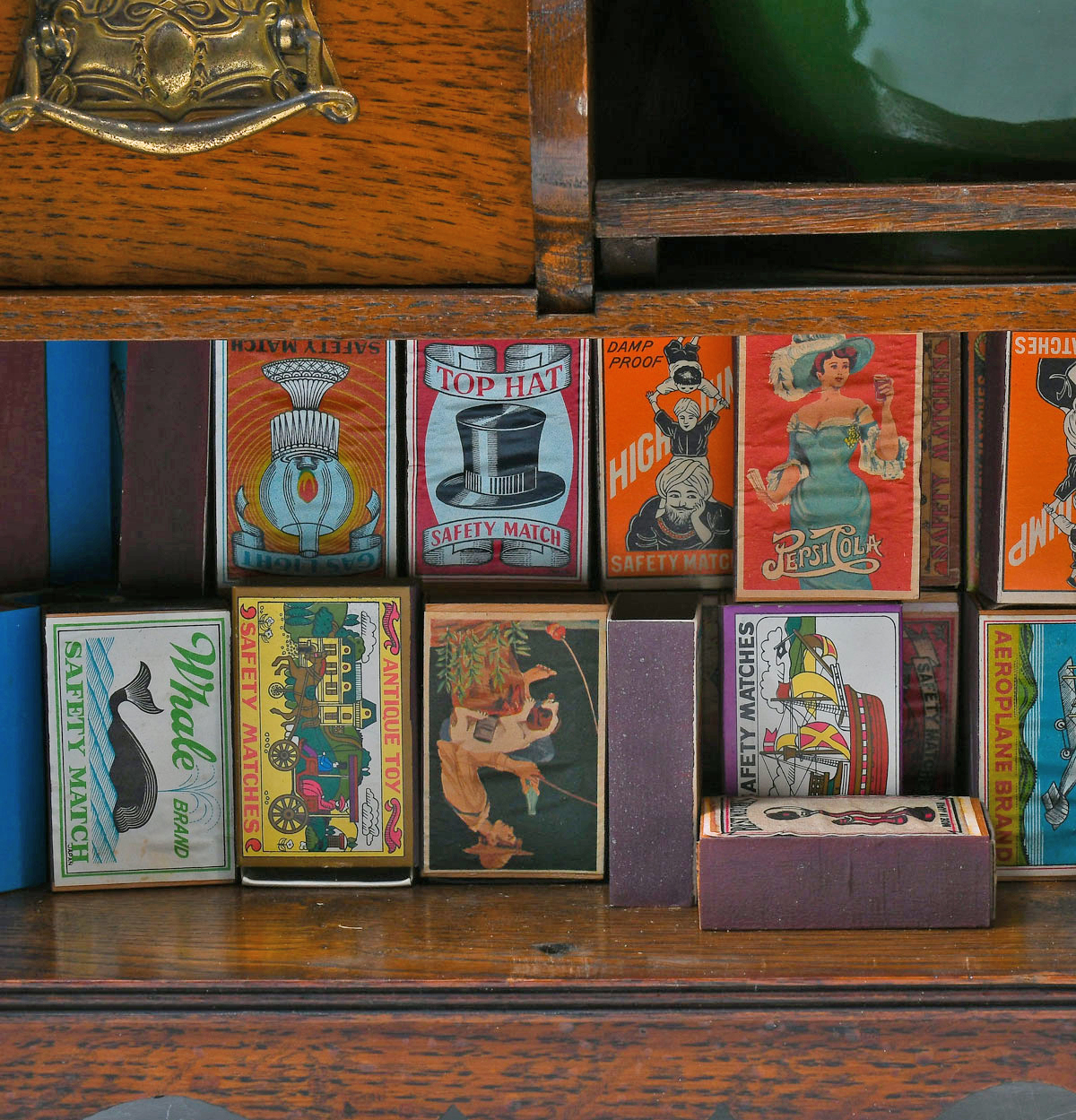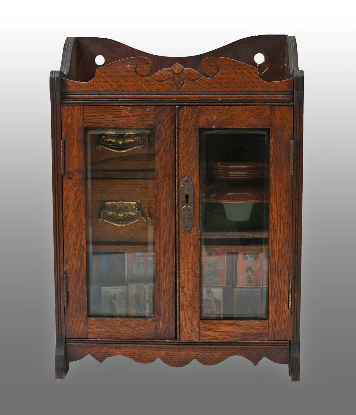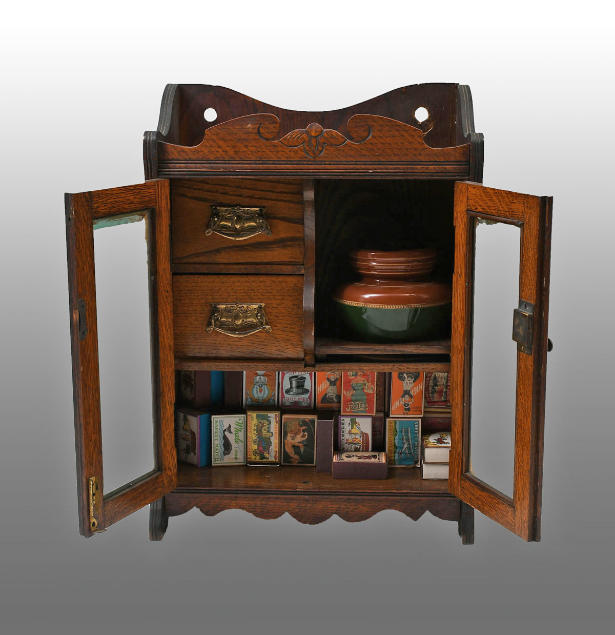 VICTORIAN OAK SMOKER'S CABINET WITH CONTENTS: Oak smoker's cabinet with beveled glass doors that open to reveal 2 drawers and a tobacco jar. Also included are some empty advertising match boxes. Approx. 17.75'' h x 13'' w x 7.25'' d. From the Estate of Franklin Wolfson, a resident of Beverly Hills, California and former President of Bugle Boy Clothing. Est. $400/600**