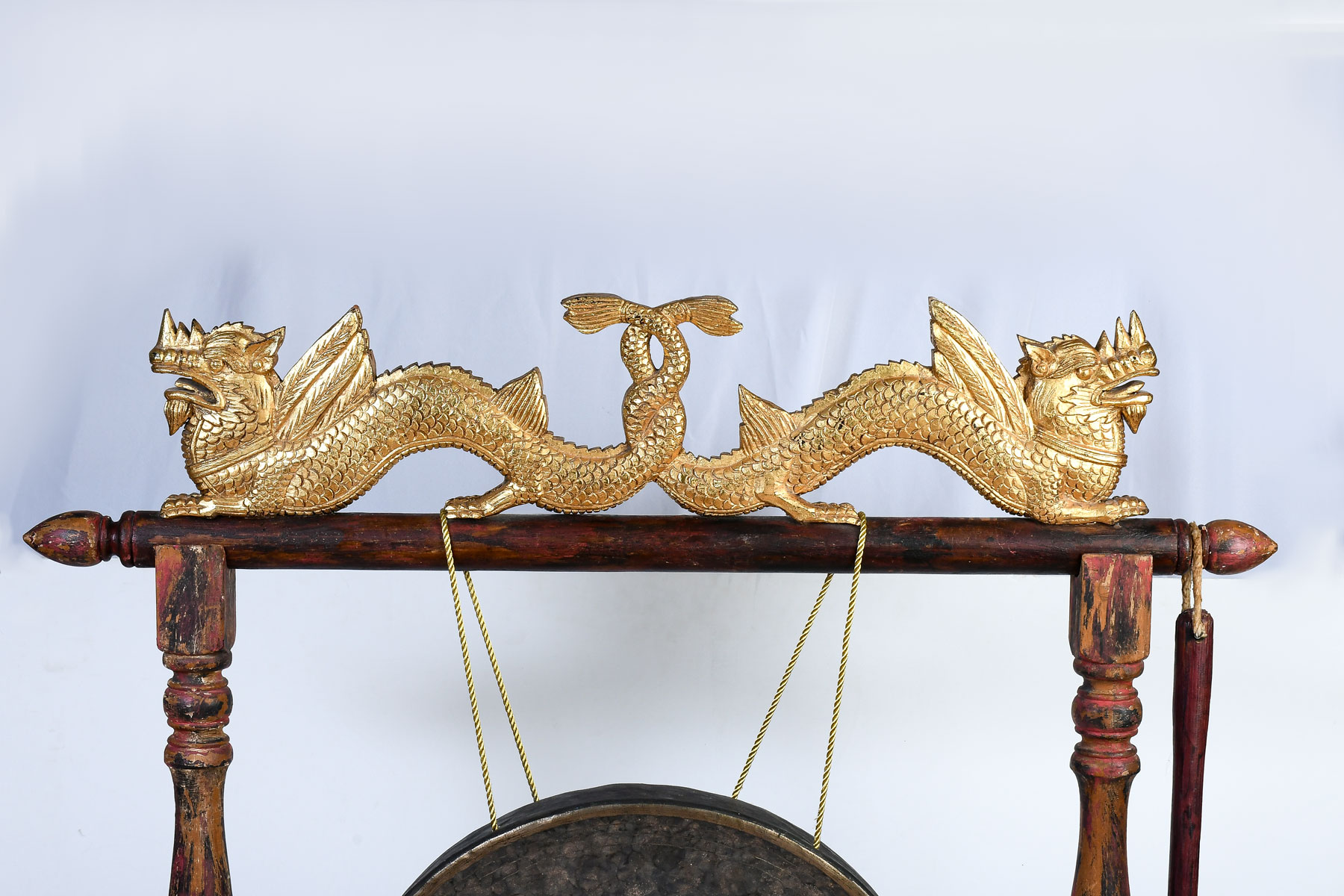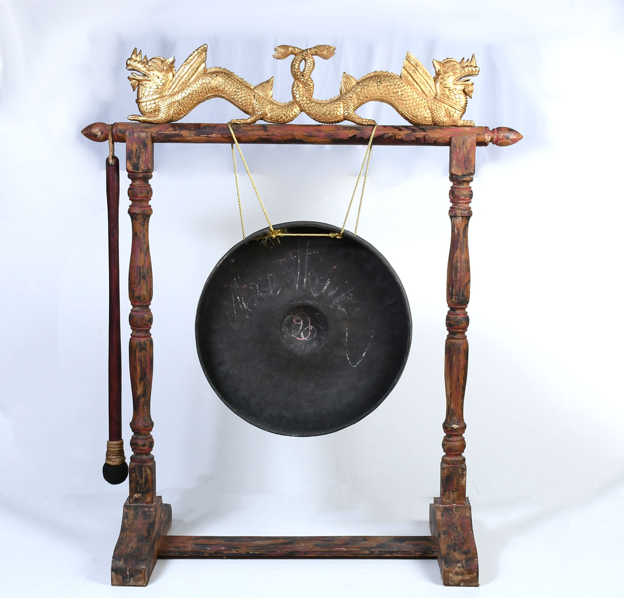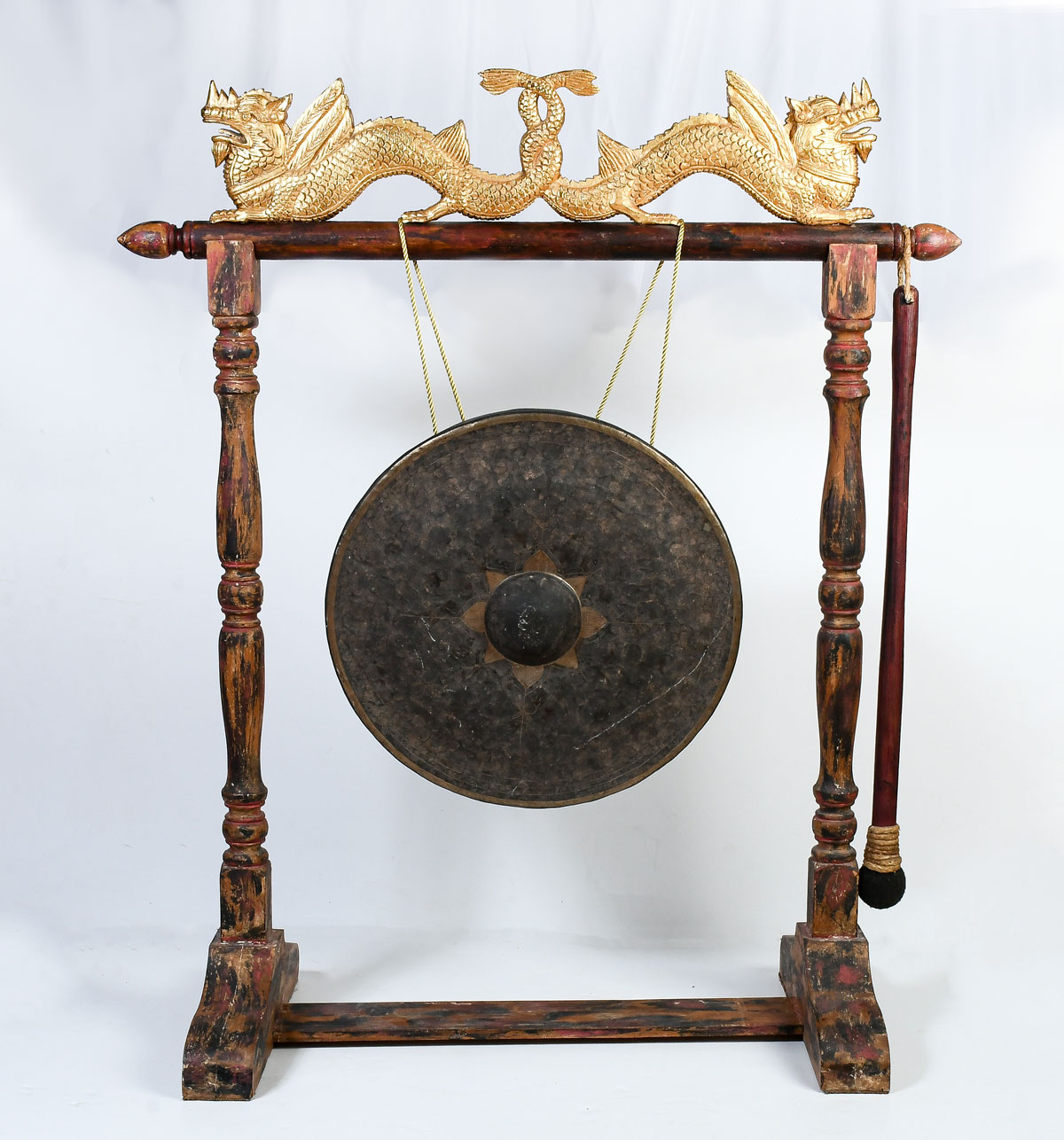 EARLY LARGE ASIAN GONG WITH STAND & STRIKER: Brass or Bronze Gong hangs from later Dragon Motif carved and painted stand, Gong is 22.5'' diameter, stand is 53'' h., 45'' w. Est. $500/700**