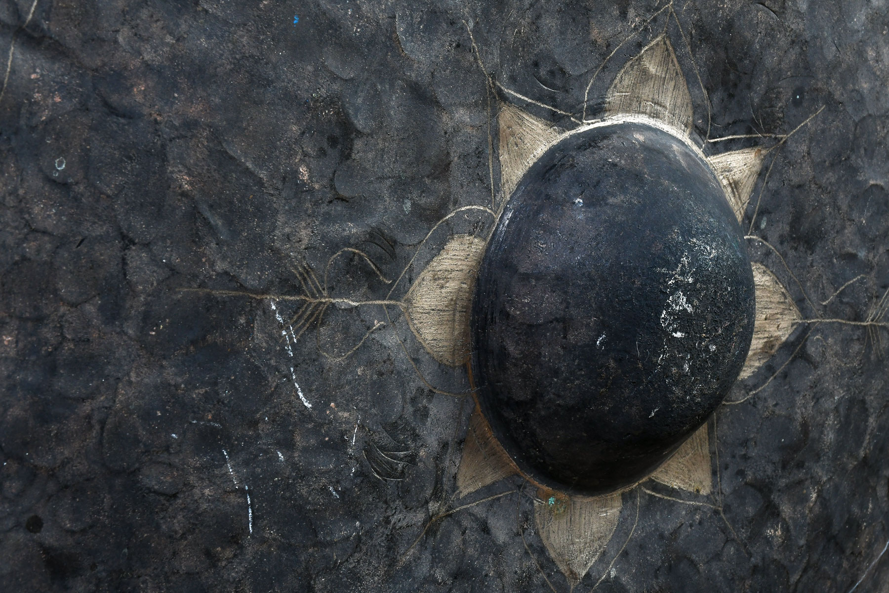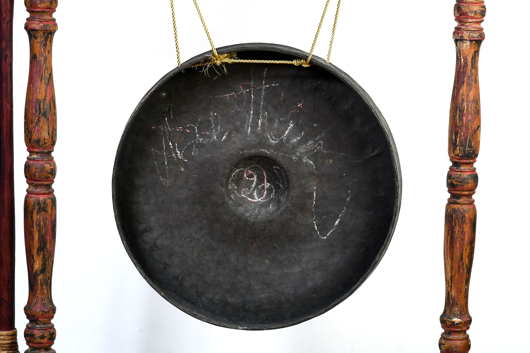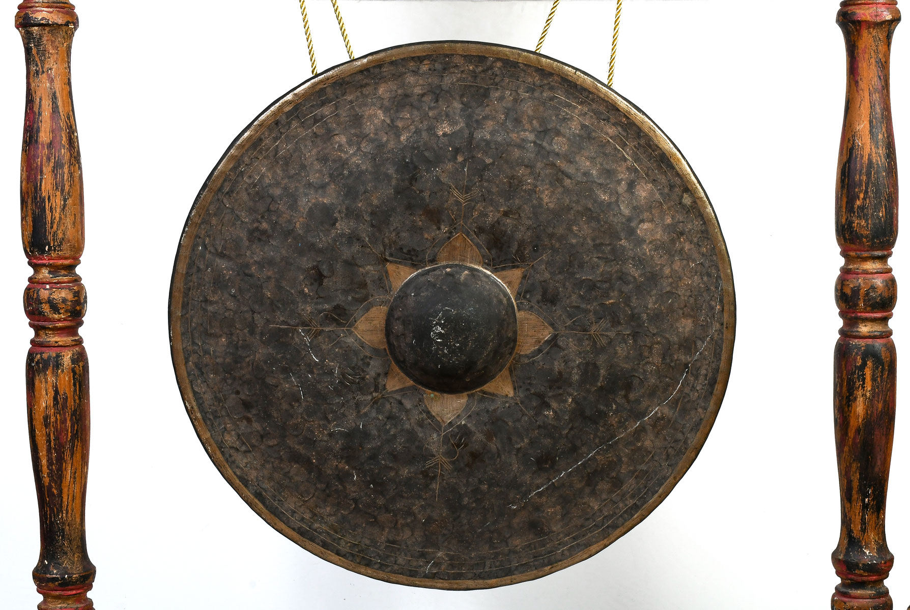 EARLY LARGE ASIAN GONG WITH STAND & STRIKER: Brass or Bronze Gong hangs from later Dragon Motif carved and painted stand, Gong is 22.5'' diameter, stand is 53'' h., 45'' w. Est. $500/700**