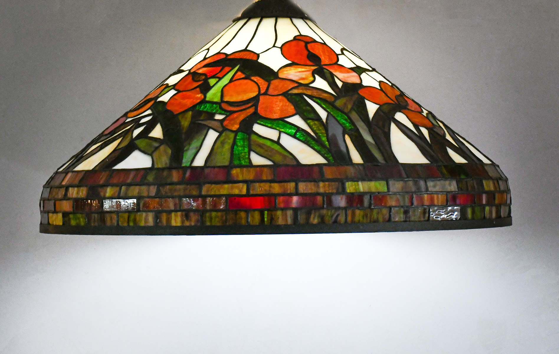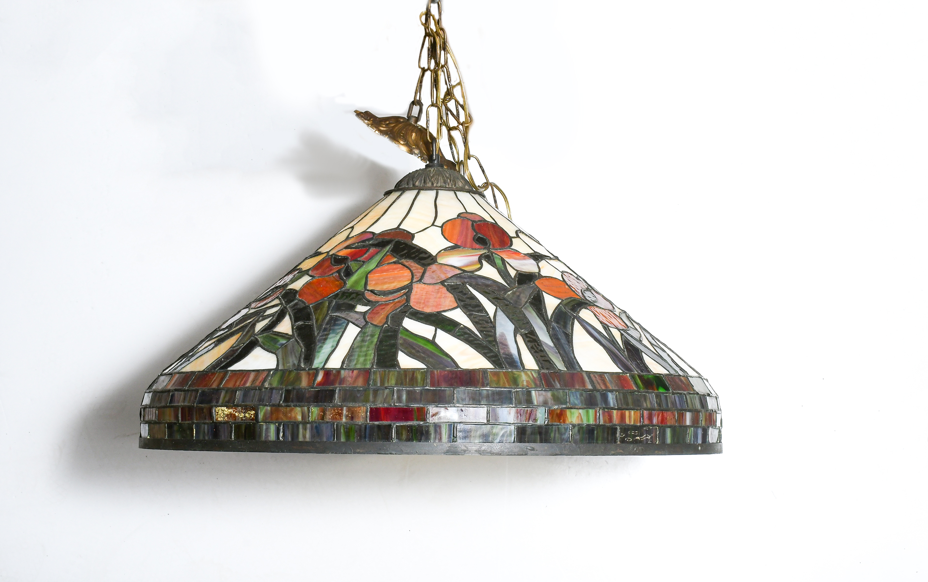 FLORAL LEADED GLASS HANGING LAMP: Large stained glass, having a stylized Orchid motif. Approx. 15.25'' h x 28.25'' w. From the Estate of Franklin Wolfson, a resident of Beverly Hills, California and former President of Bugle Boy Clothing. Est. $600/800**