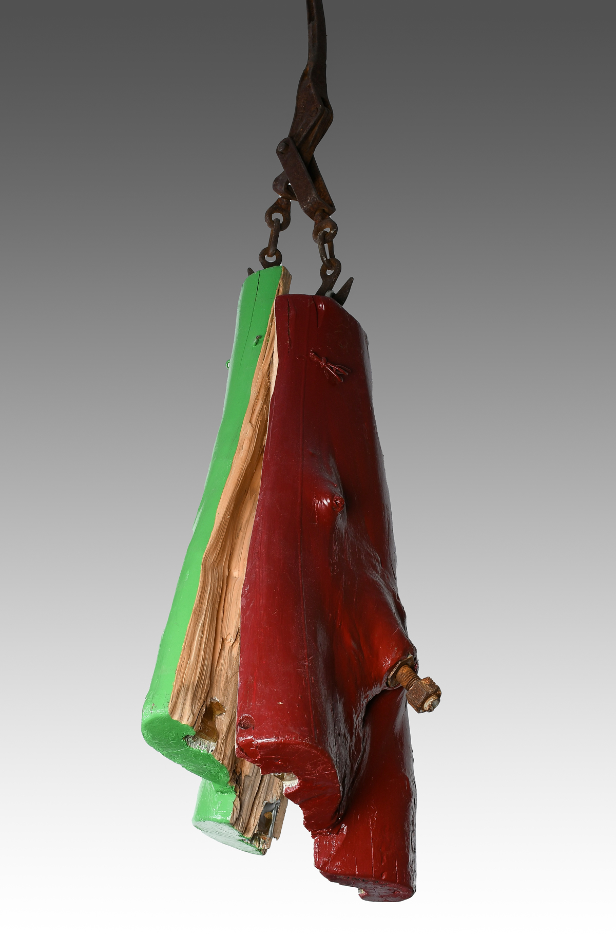 CARVED AND PAINTED MALE AND FEMALE TORSO SCULPTURES: Signed ''T. Lantz'', Mixed Media of Paint, Wood, Metal, and Epoxy, each torso measures approximately 31'', when hanging the sculpture with the metal components measures 58'' overall.