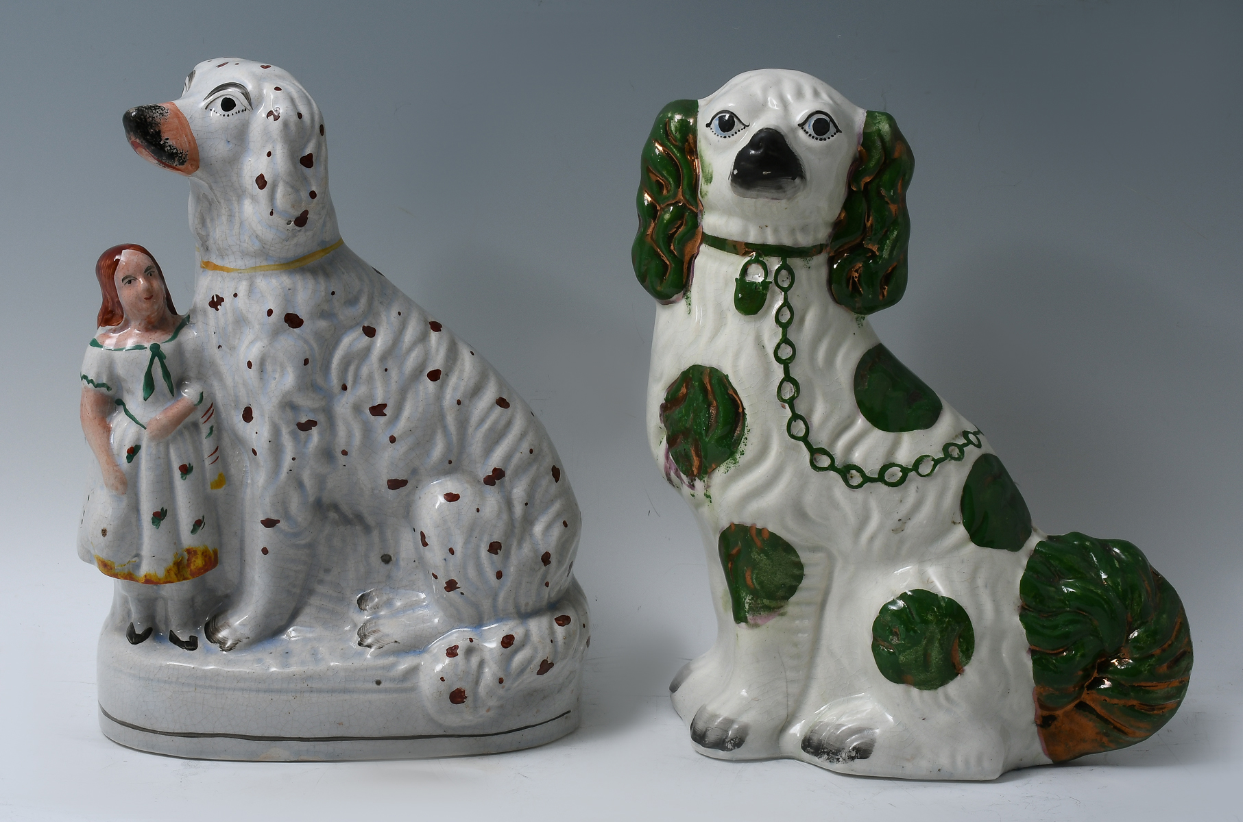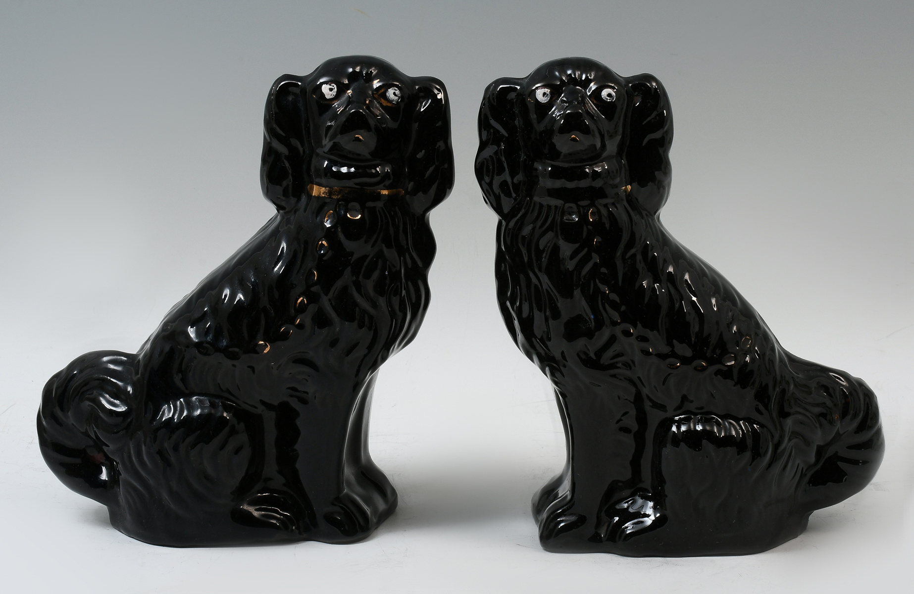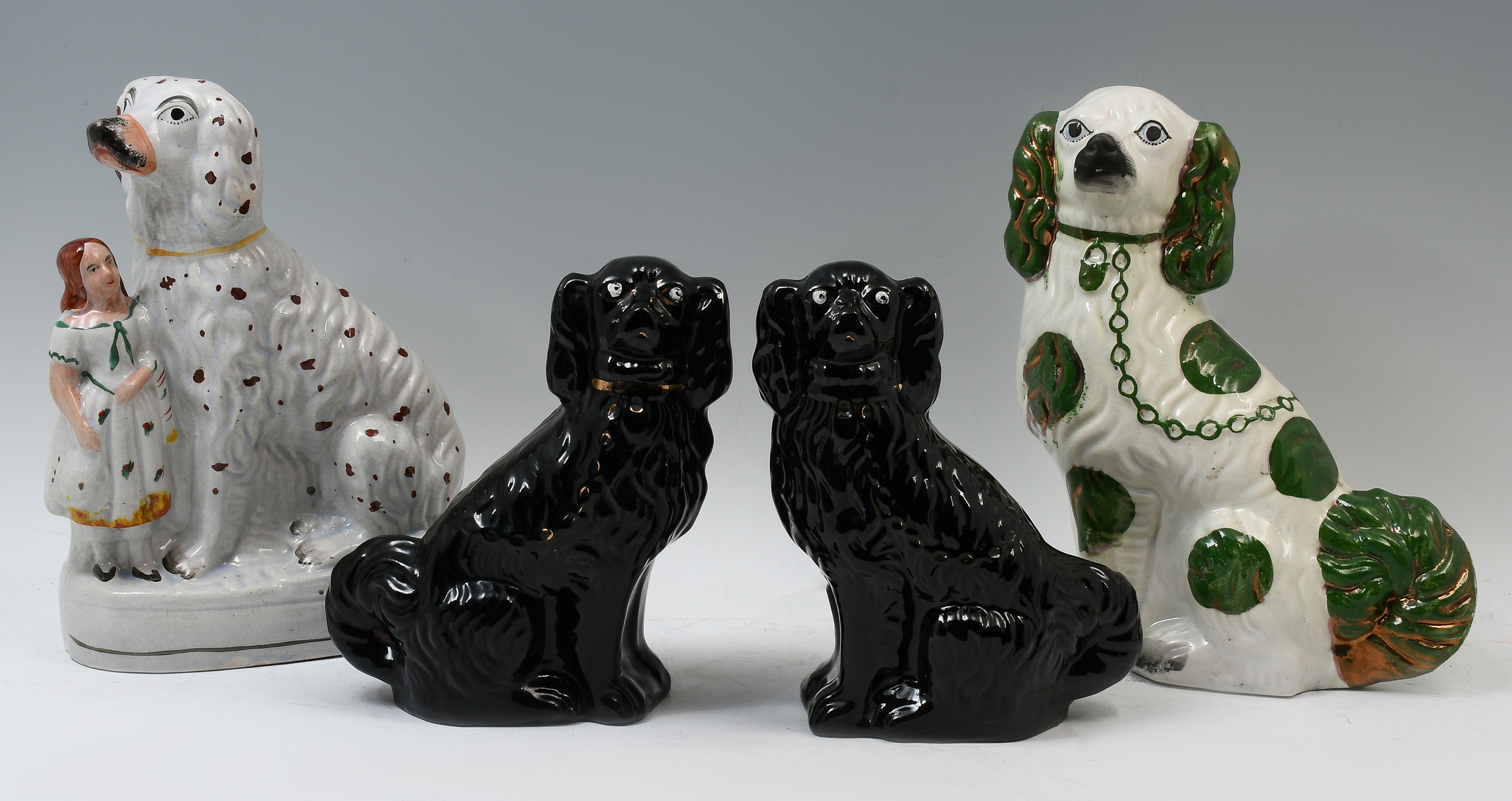 4 PC. STAFFORDSHIRE PORCELAIN DOG COLLECTION: Comprising; 1- Seated green & white Spaniel with gold painted accents. 1- Seated Spaniel with child. 2- Opposing seated black spaniels with gold accents. Largest Approx. 12.5'' h x 9.5'' l x 4.5'' w.