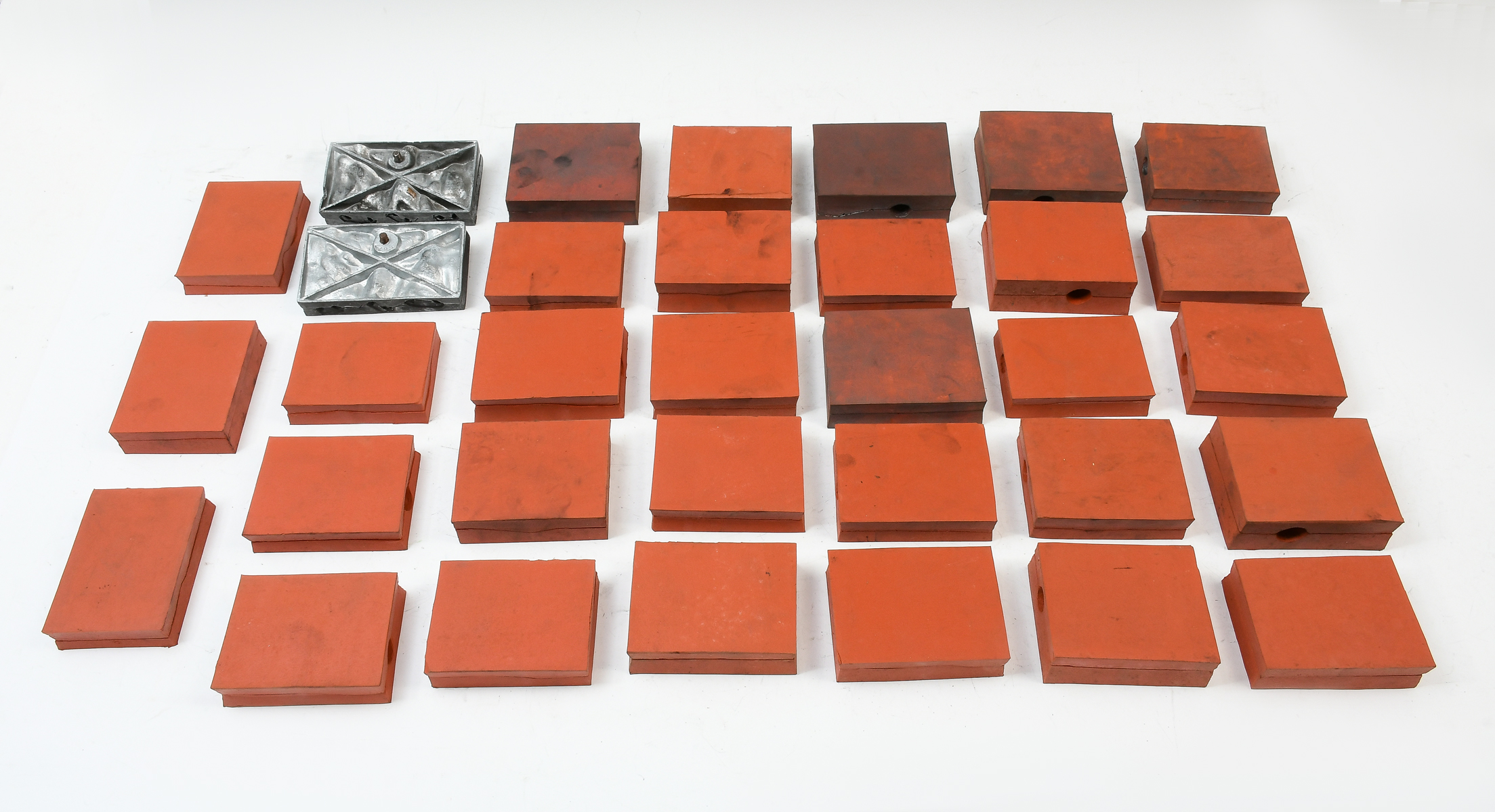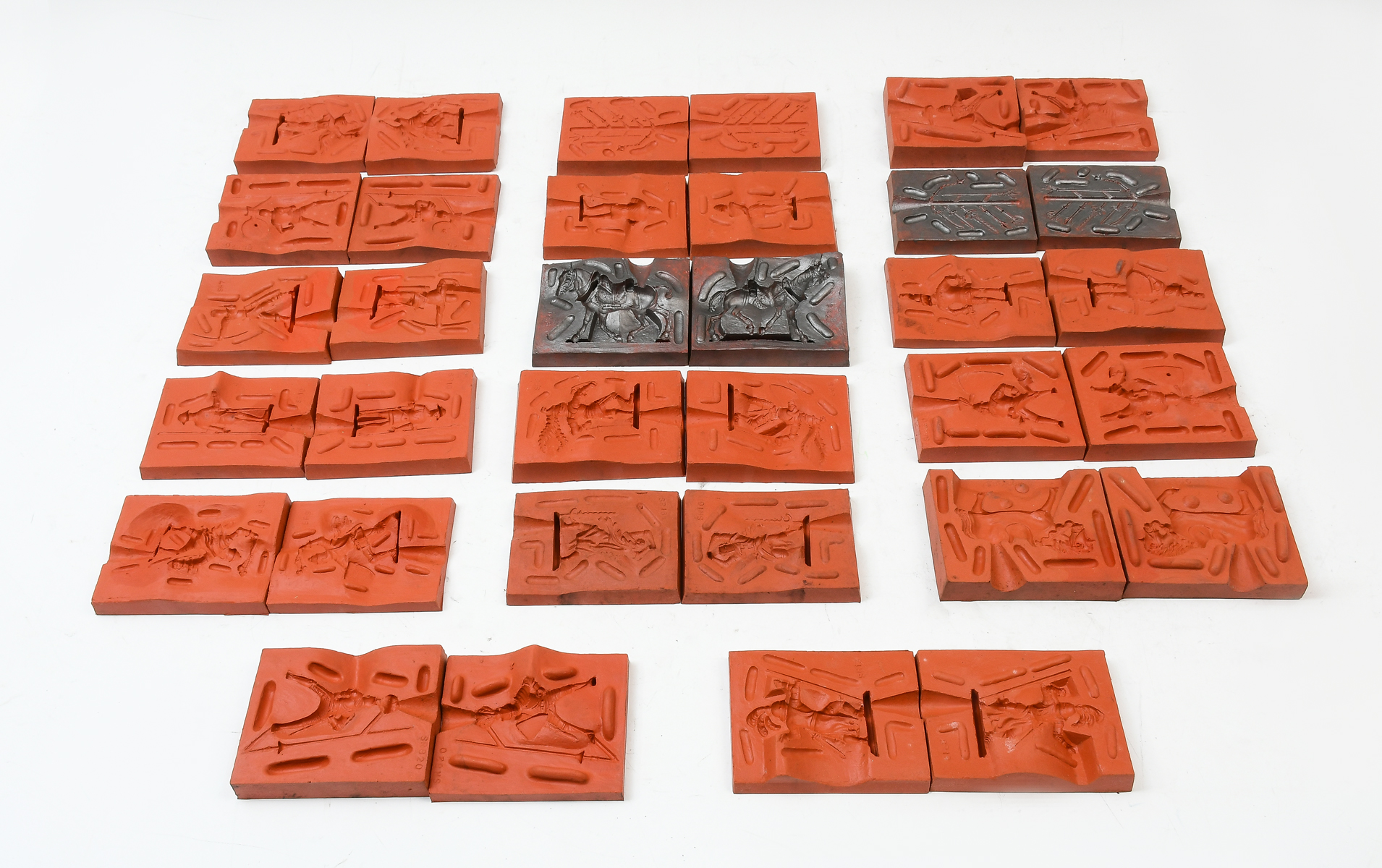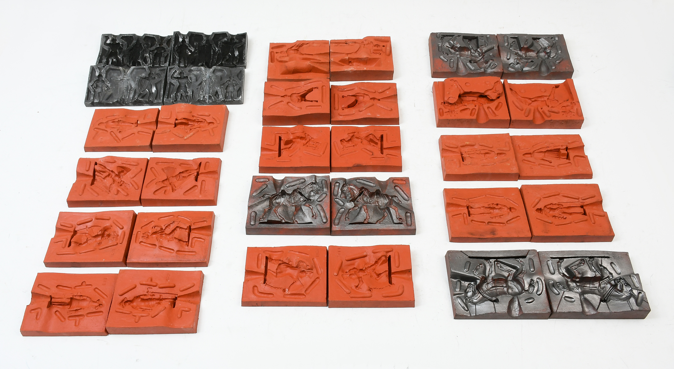 34 PC. CAST METAL MEDIEVAL KNIGHTS MOLD COLLECTION: A collection of 34 metal & rubber molds of knights in armor, horses, & more. Some unused. Largest Approx. 2.75'' h x 4.75'' l.