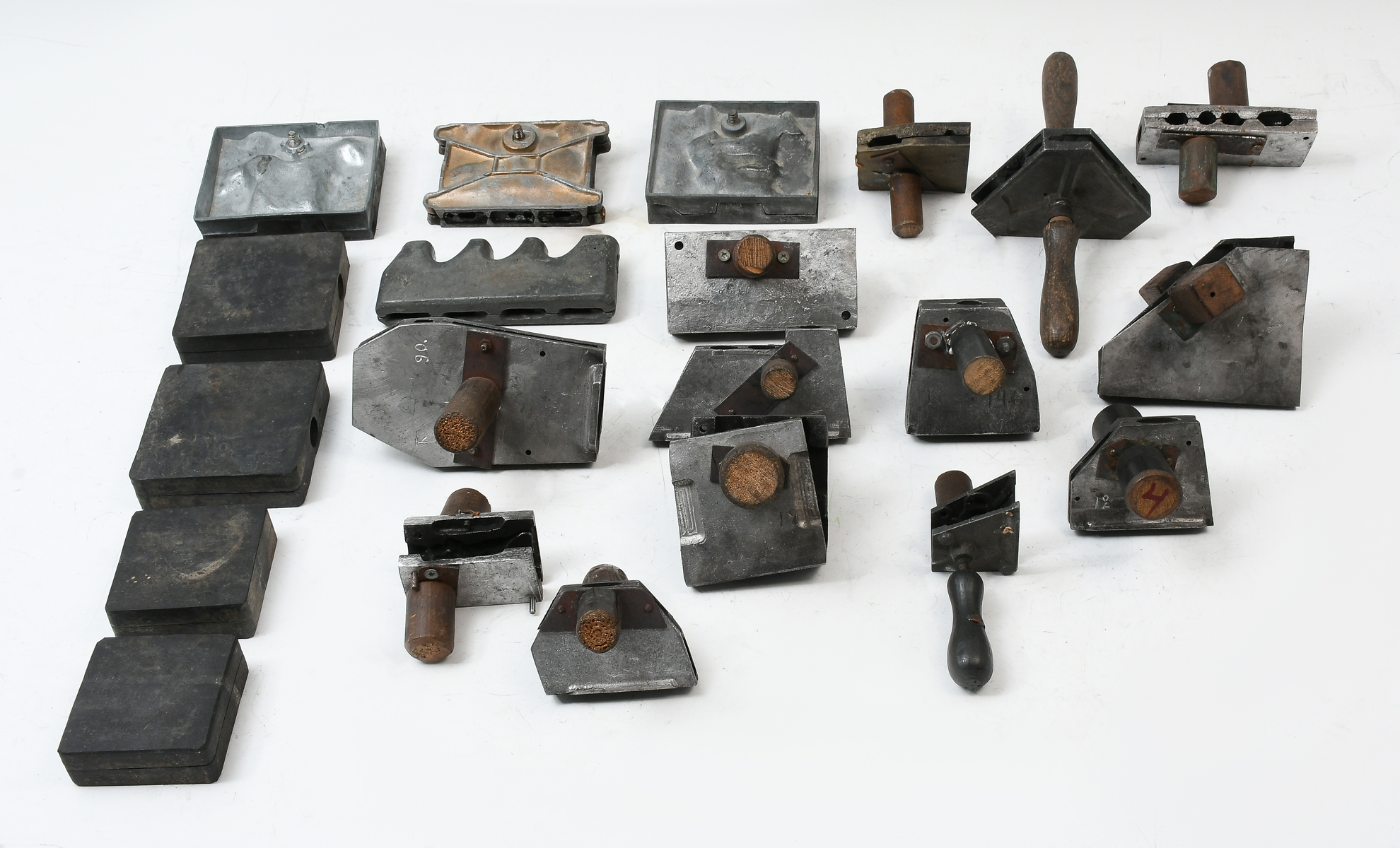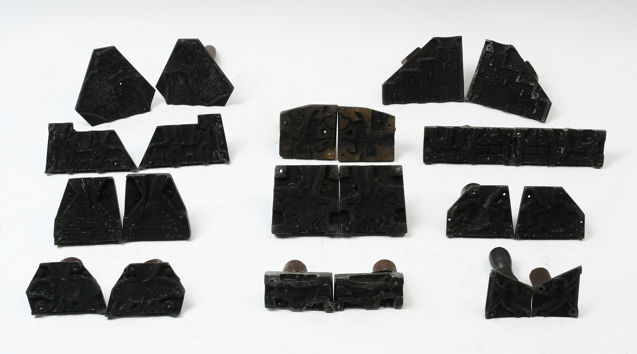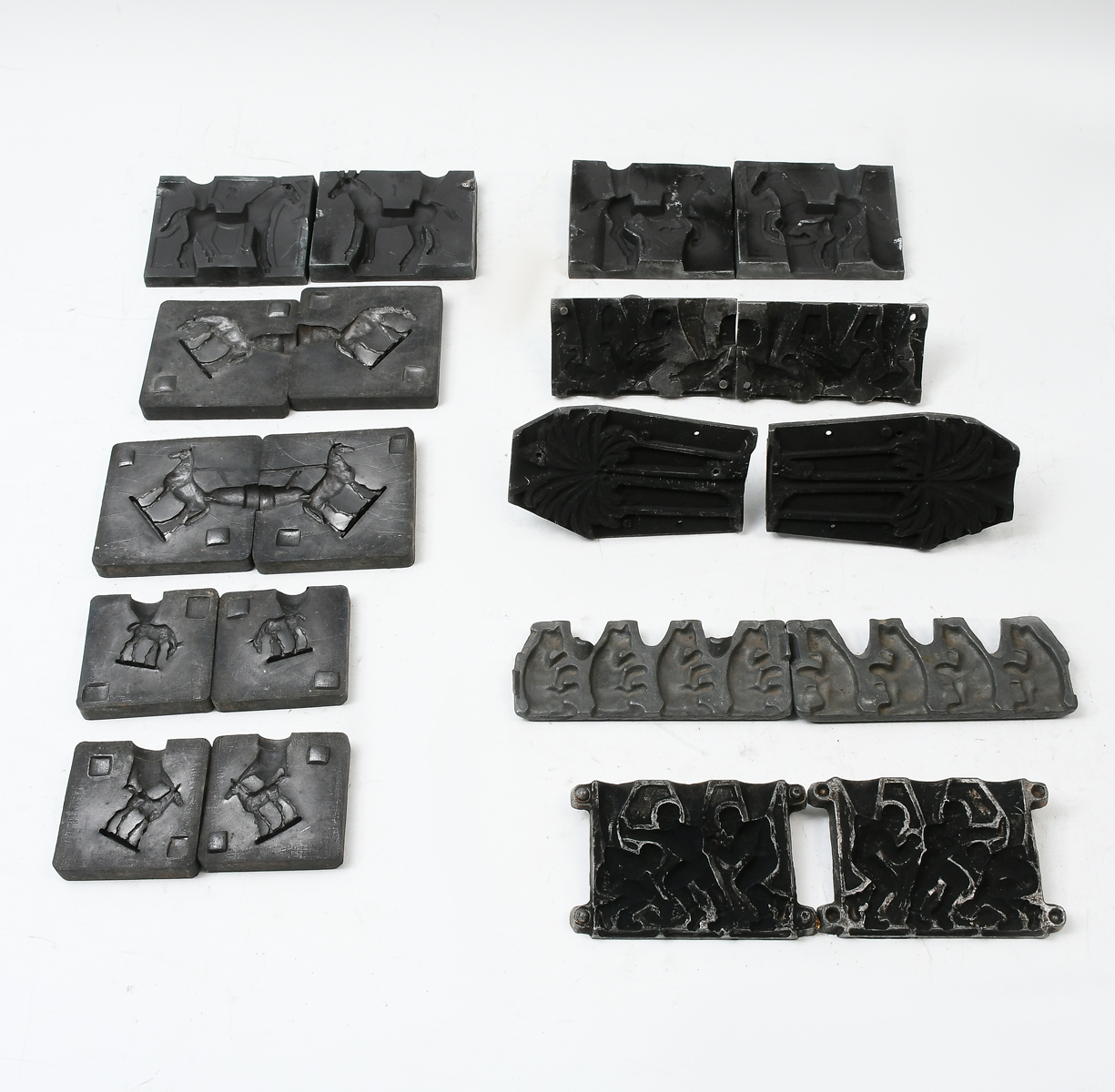 21 PC. CAST METAL TOY FIGURAL MOLD COLLECTION: A collection of 21 rubber & metal figural molds. Including: Horses, Palm tree, Football players, Buildings, bears, Fencing, Tee pee, Birds, Buffalo, & more. Largest approx. 3.5'' h x 4.25'' l.