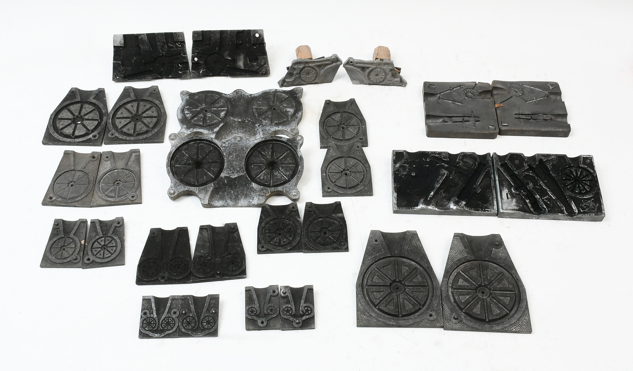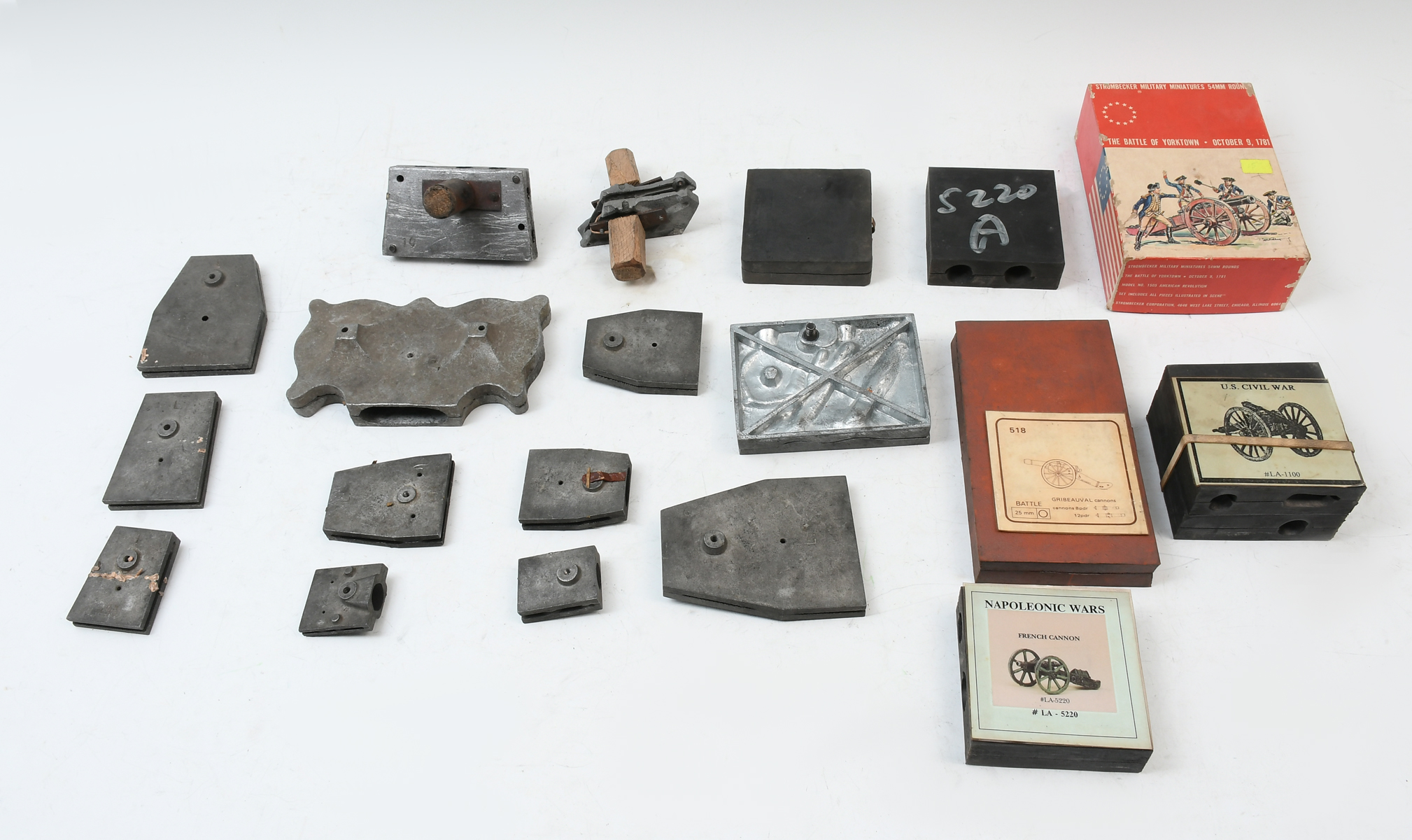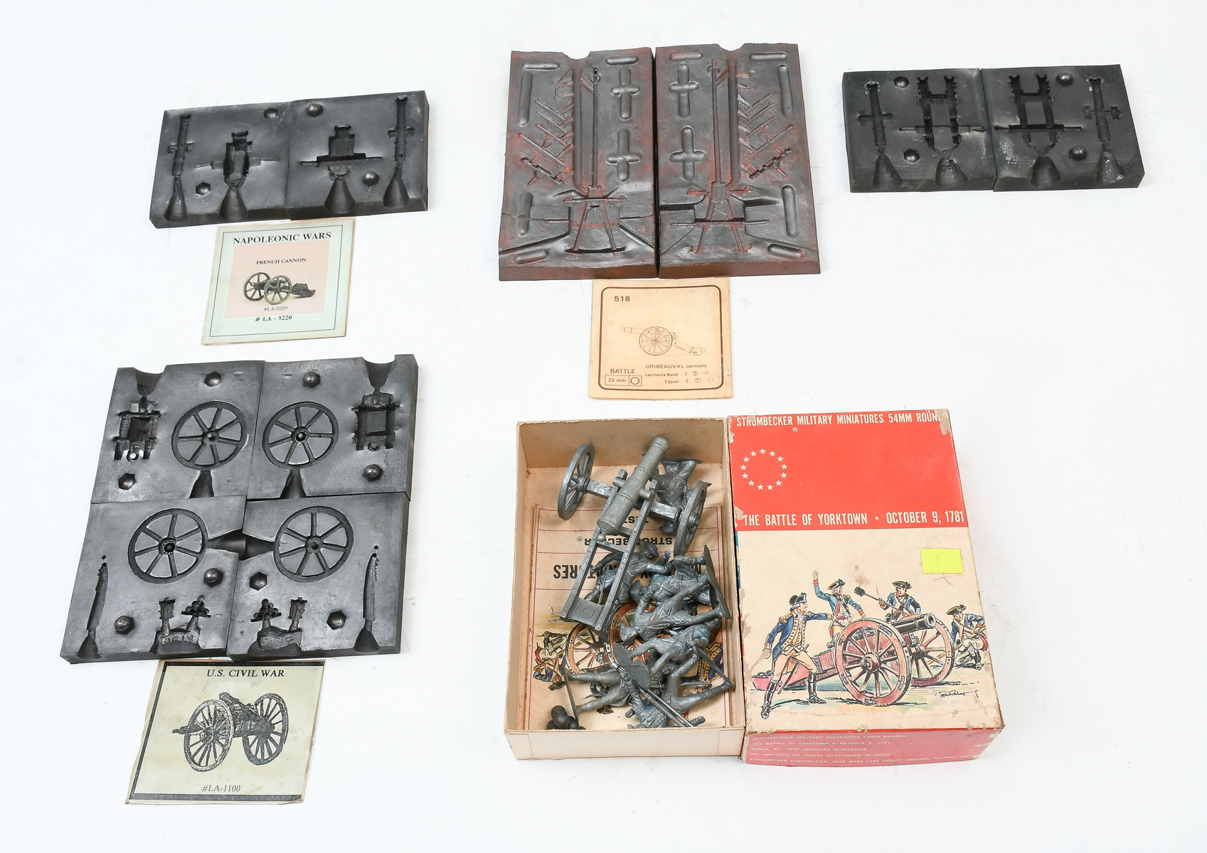 19 PC. CAST METAL MILITARY CANNON MOLDS & FIGURES: A collection of 19 rubber & metal Cannon & Wheel molds for casting. Battle of Yorktown cannon & figures by Strombecker also included. Largest mold approx. 4'' h x 7'' l.