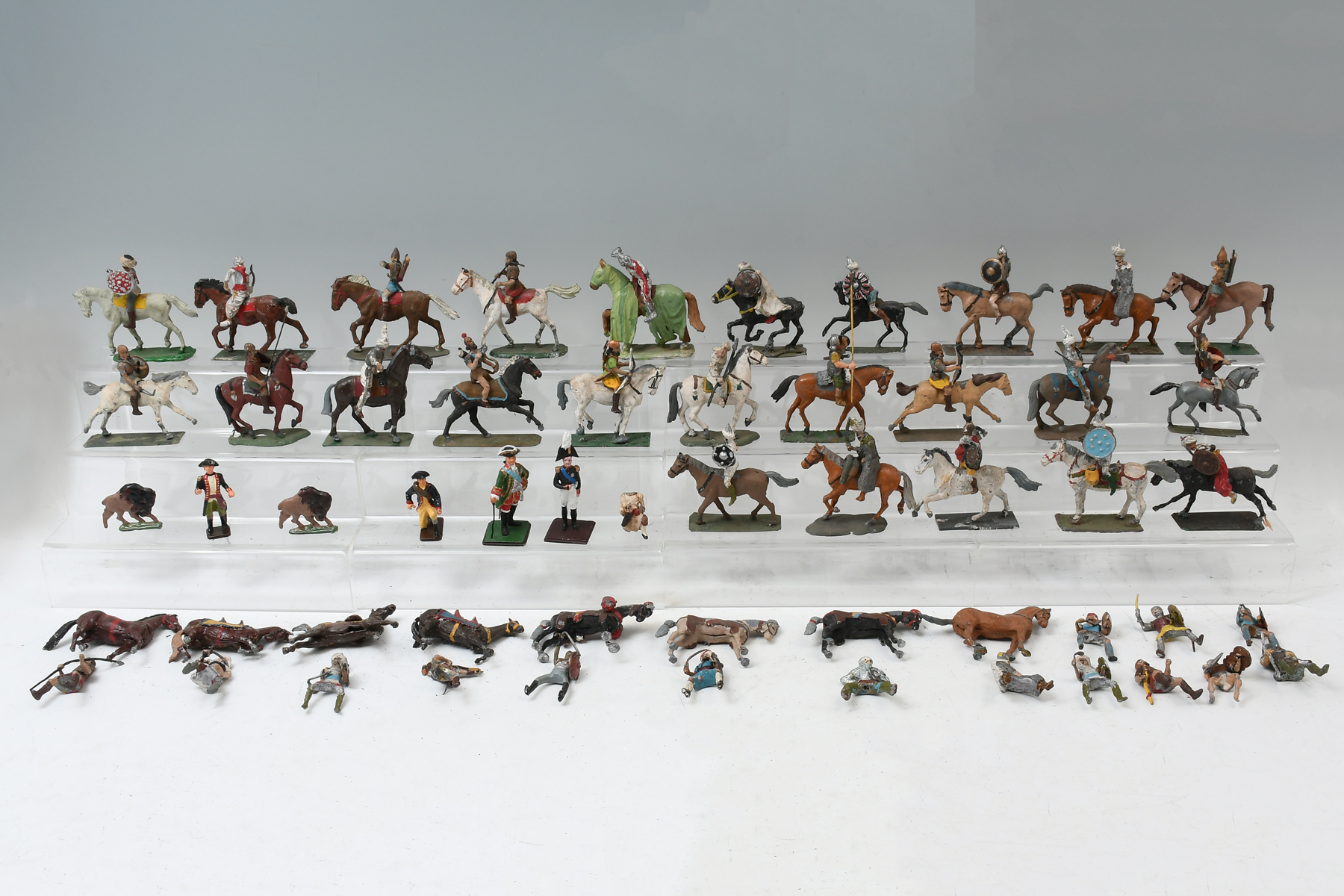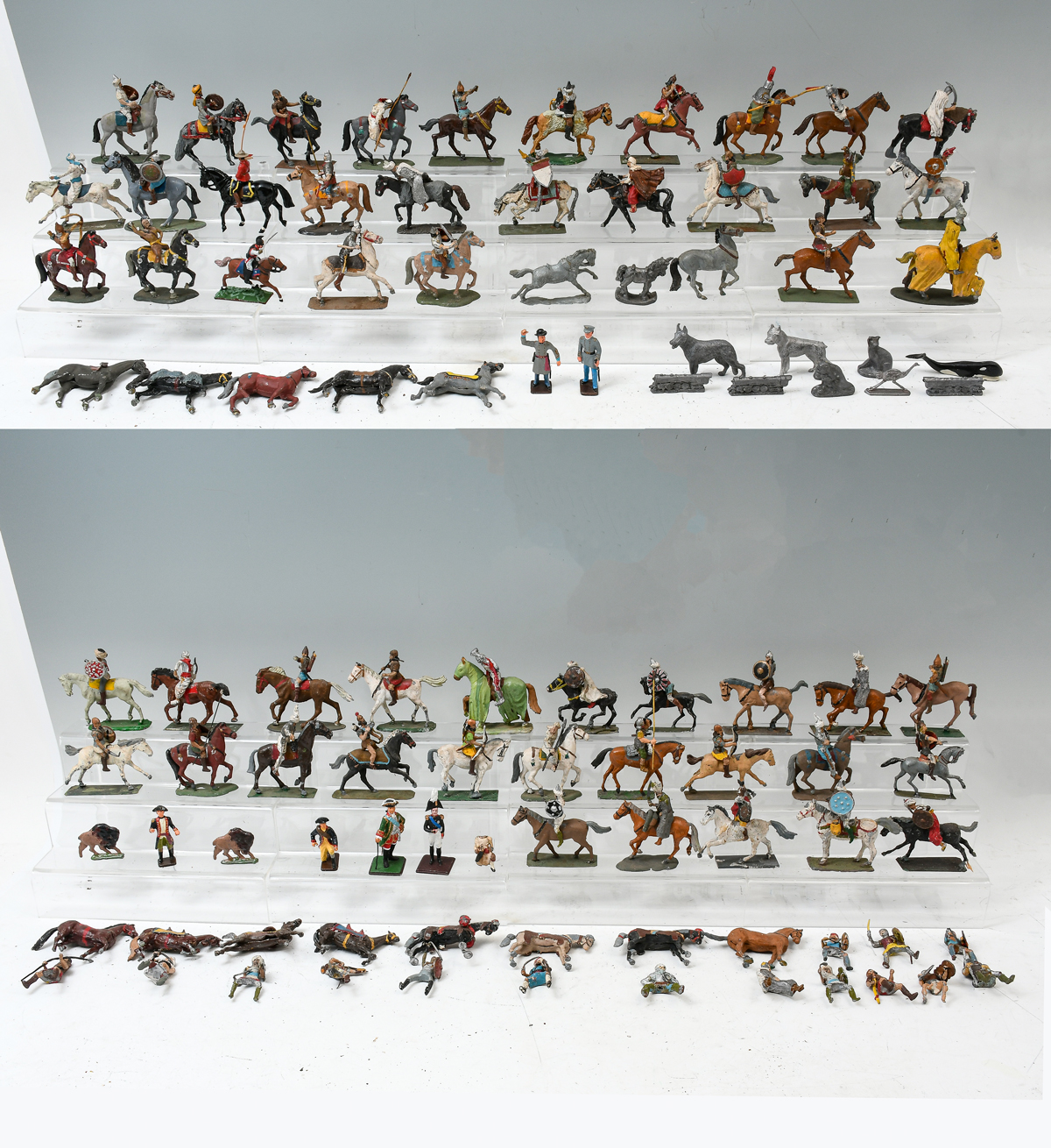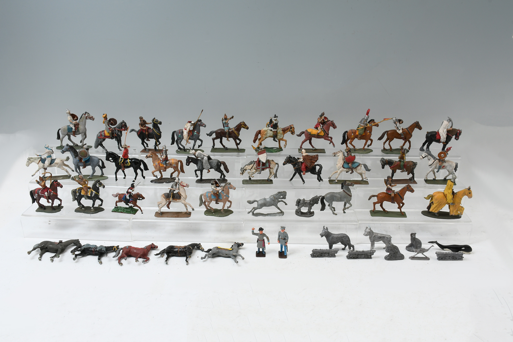 LARGE COLLECTION OF CAST METAL TOY FIGURES: Large collection of 100+ hand painted cast metal horses & figures. Largest Approx. 2.5'' h x 3.5'' l.