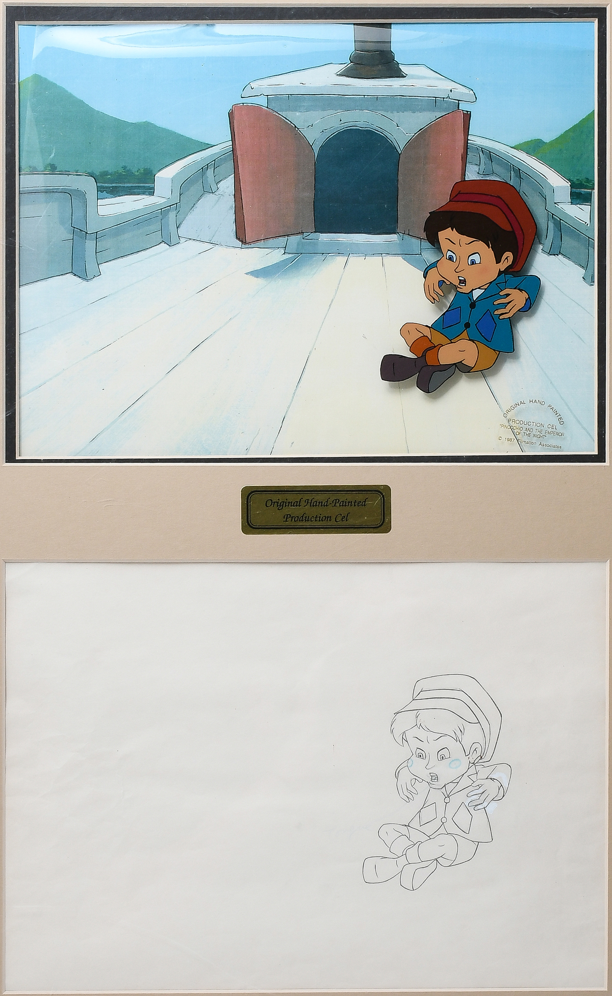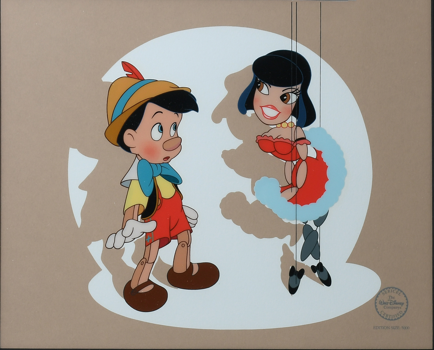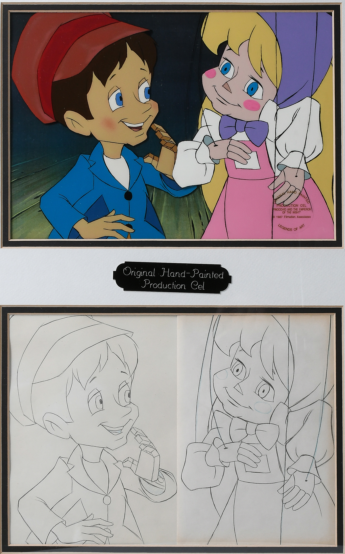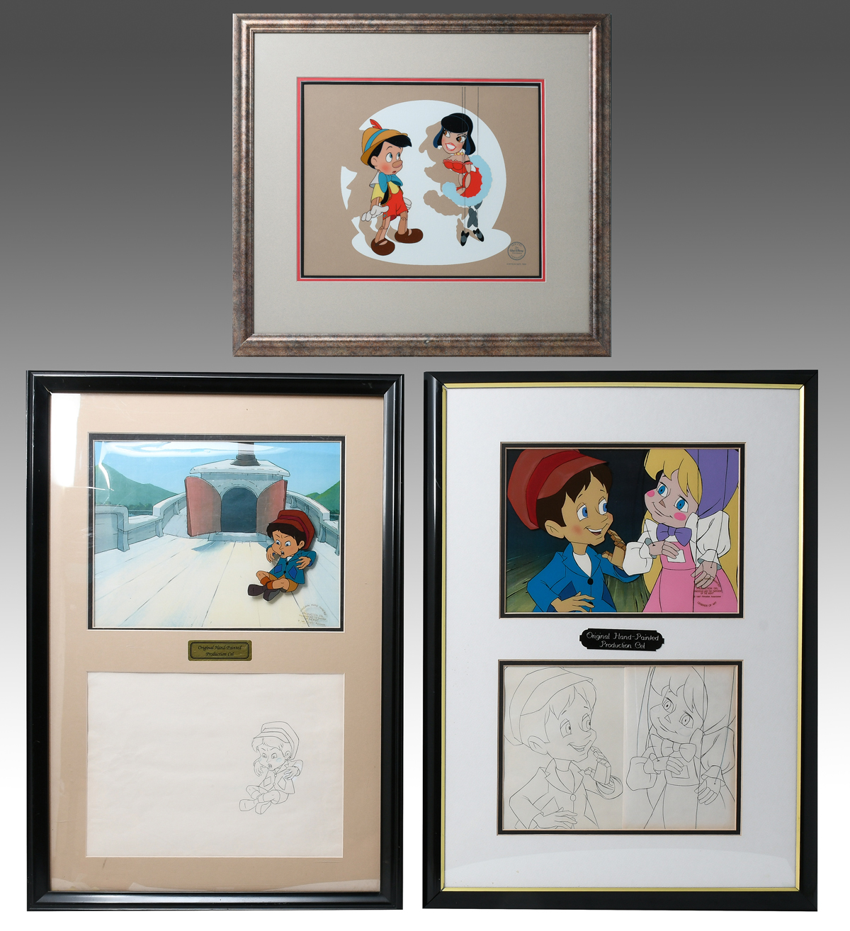 THREE PINNOCHIO ARTWORKS: 1) Limited Edition Sericel of 500 of Pinocchio performing ''I've Got No Strings'', framed, 19'' x 21'', Certificate of Authenticity affixed verso from the Walt Disney Company; 2) Two Original Production Cels from Pinocchio and the Emperor of the Night from 1987, Certificates of Authenticity affixed verso, framed, first measures 26'' x 19'', second measures 25.5'' x 17.5''.