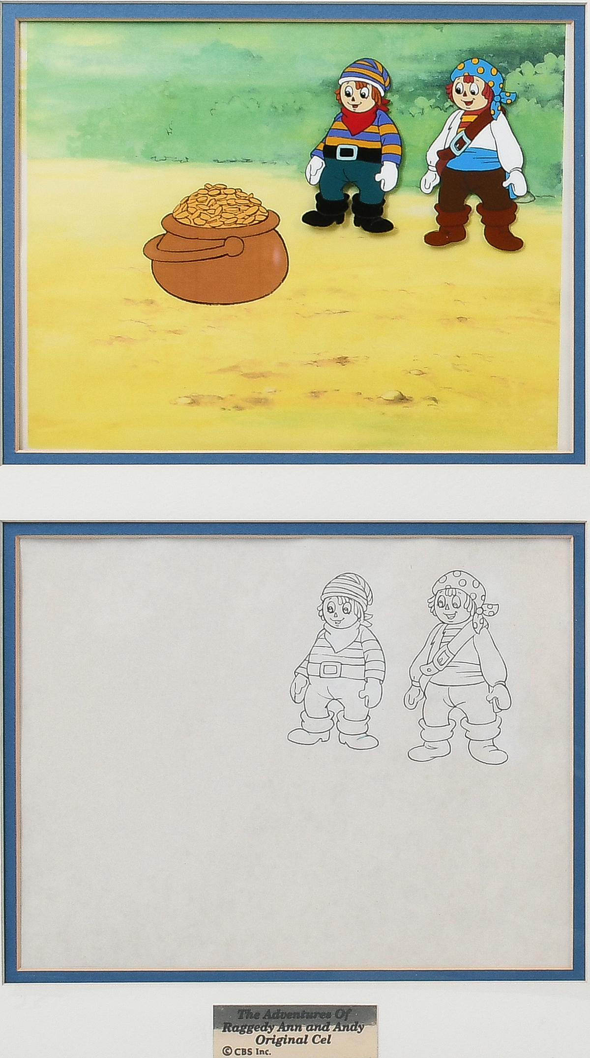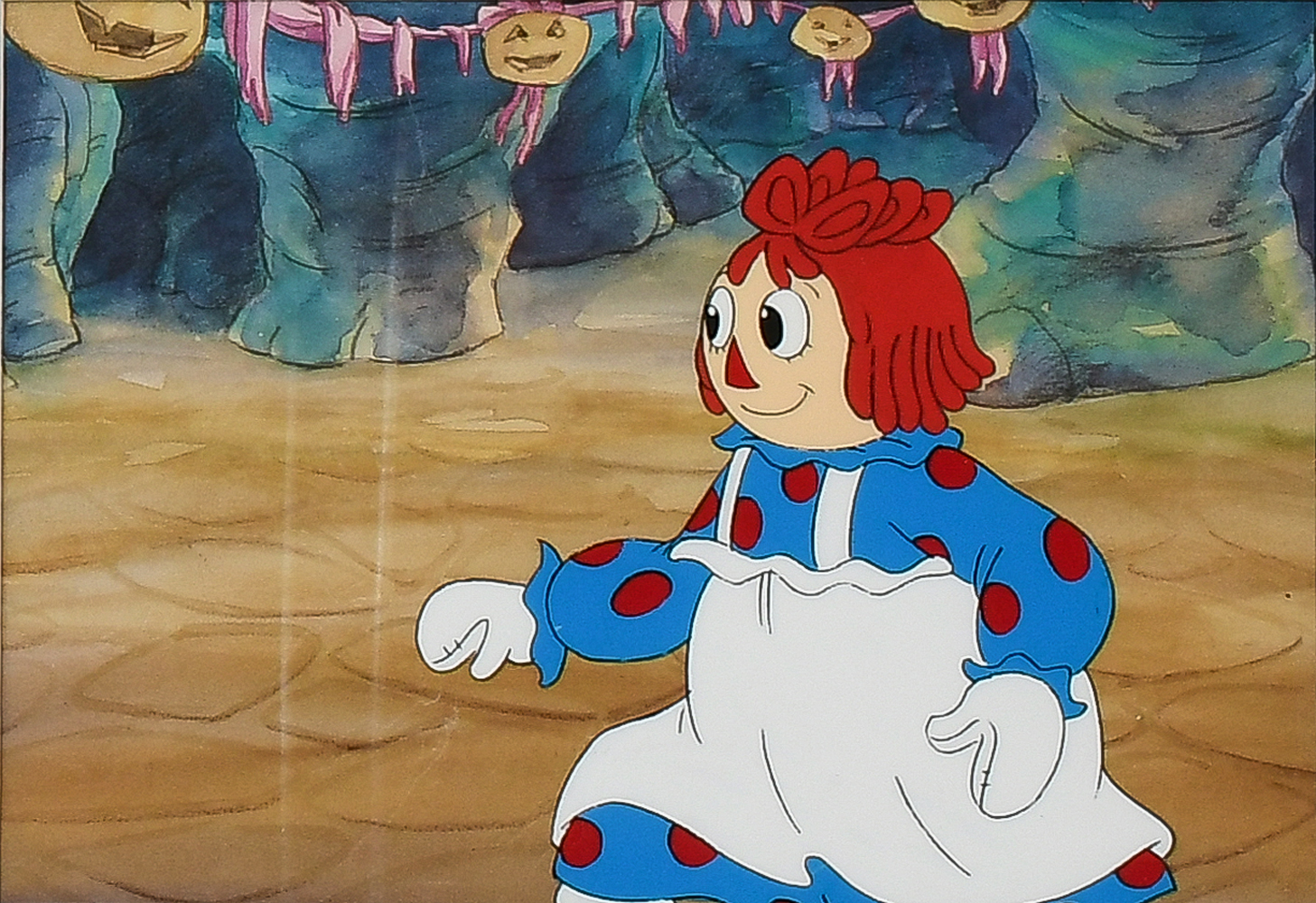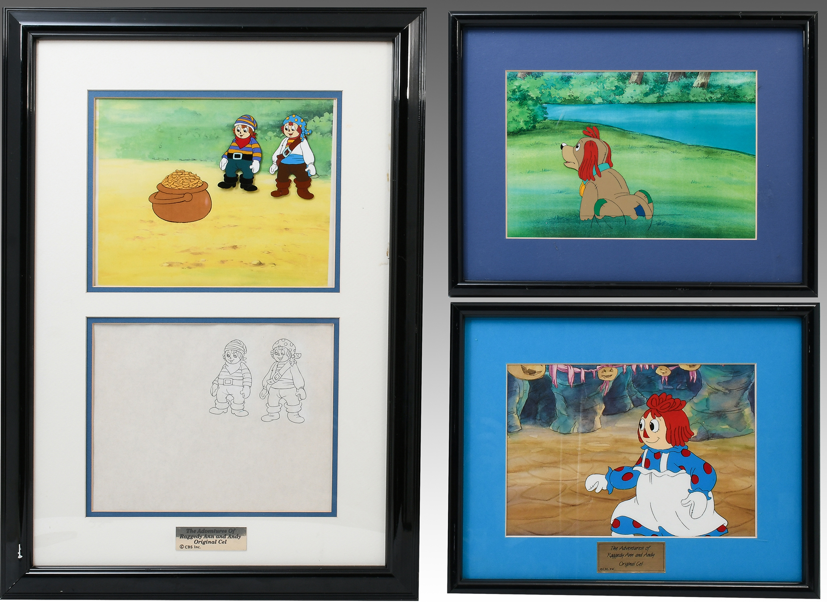 THREE ORIGINAL CELS FROM THE ADVENTURES OF RAGGEDY ANNE AND ANDY: 1) Framed, 23.5'' x 16.75''; 2) From ''The Ransom of Sunny Bunny'', Episode 6, Scene 350, sight size 12'' x 15'', Certificate of Authenticity affixed verso, framed, 23.5'' x 16.75''; 3) From Episode 4, Scene 136, entitled ''Beastly Ghost'', framed, 12'' x 8'', Certificate of Authenticity affixed verso from CBS.