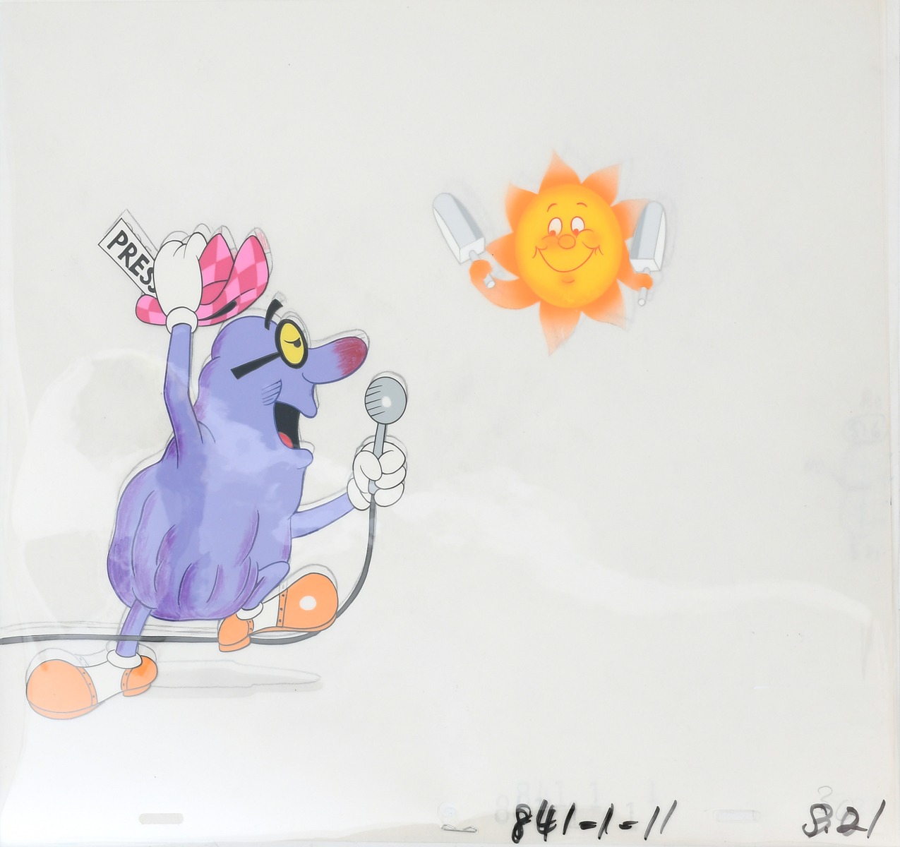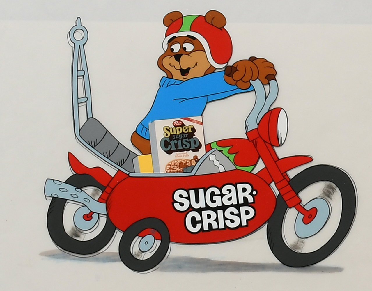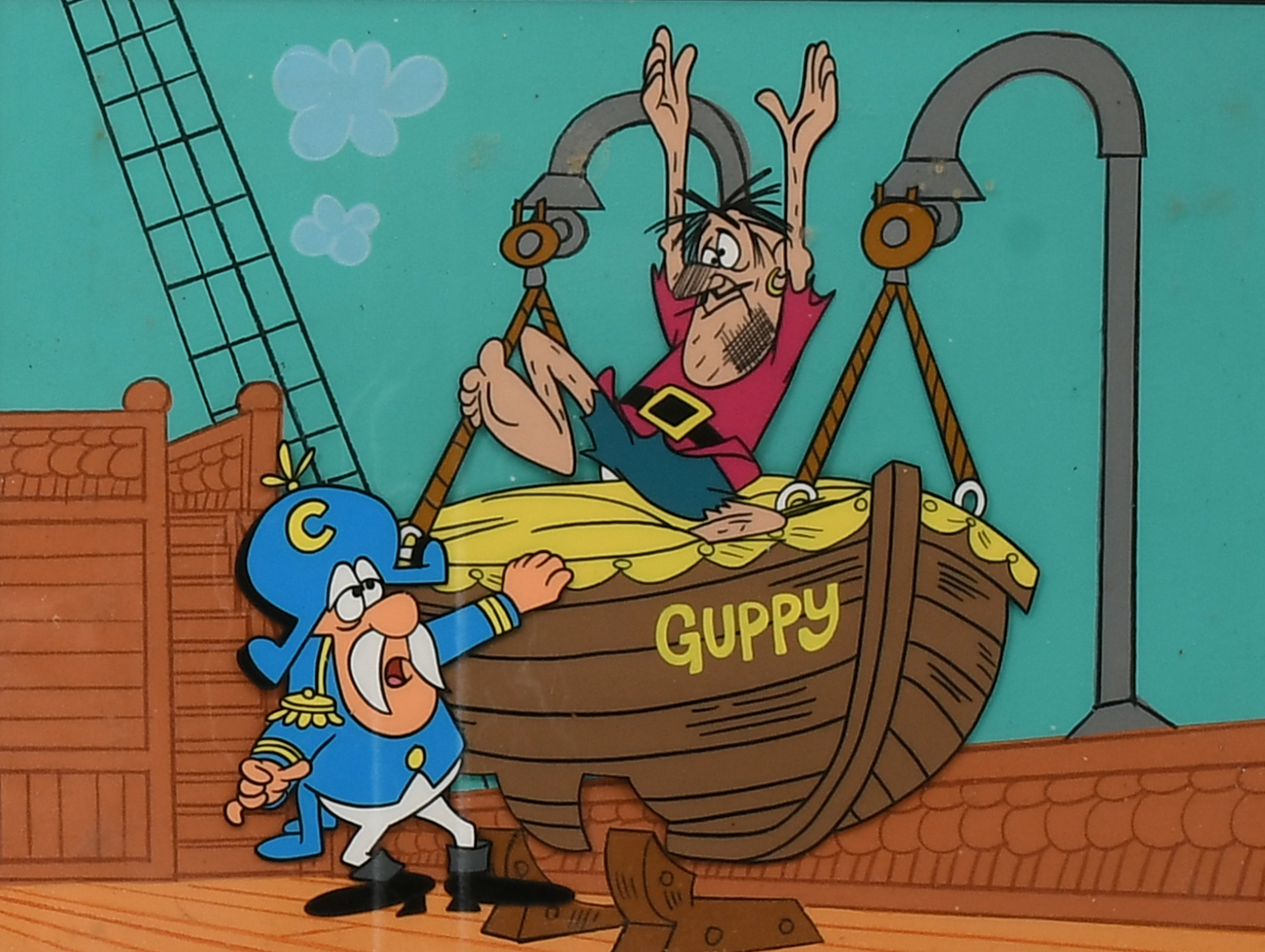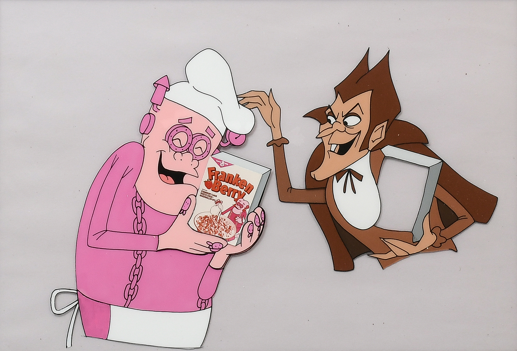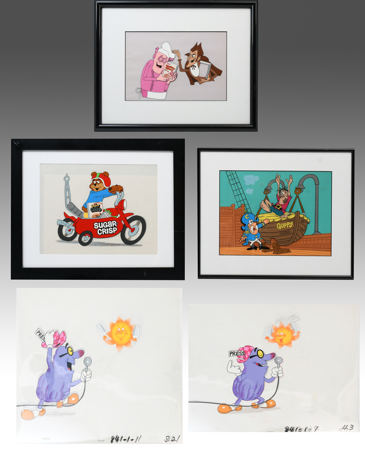 FIVE ORIGINAL CEREAL-RELATED PRODUCTION CELS: 1) Captain Crunch, framed, 11.75'' x 14.25''; 2) Franken Berry and Count Chocula, framed, 15.5'' x 19.25''; 3) Super Sugar Crisp, framed, 12.75'' x 15.75''; 4) Two Production Cels for Raisin Bran Cereal, approximately 10.5'' x 13'', unframed.