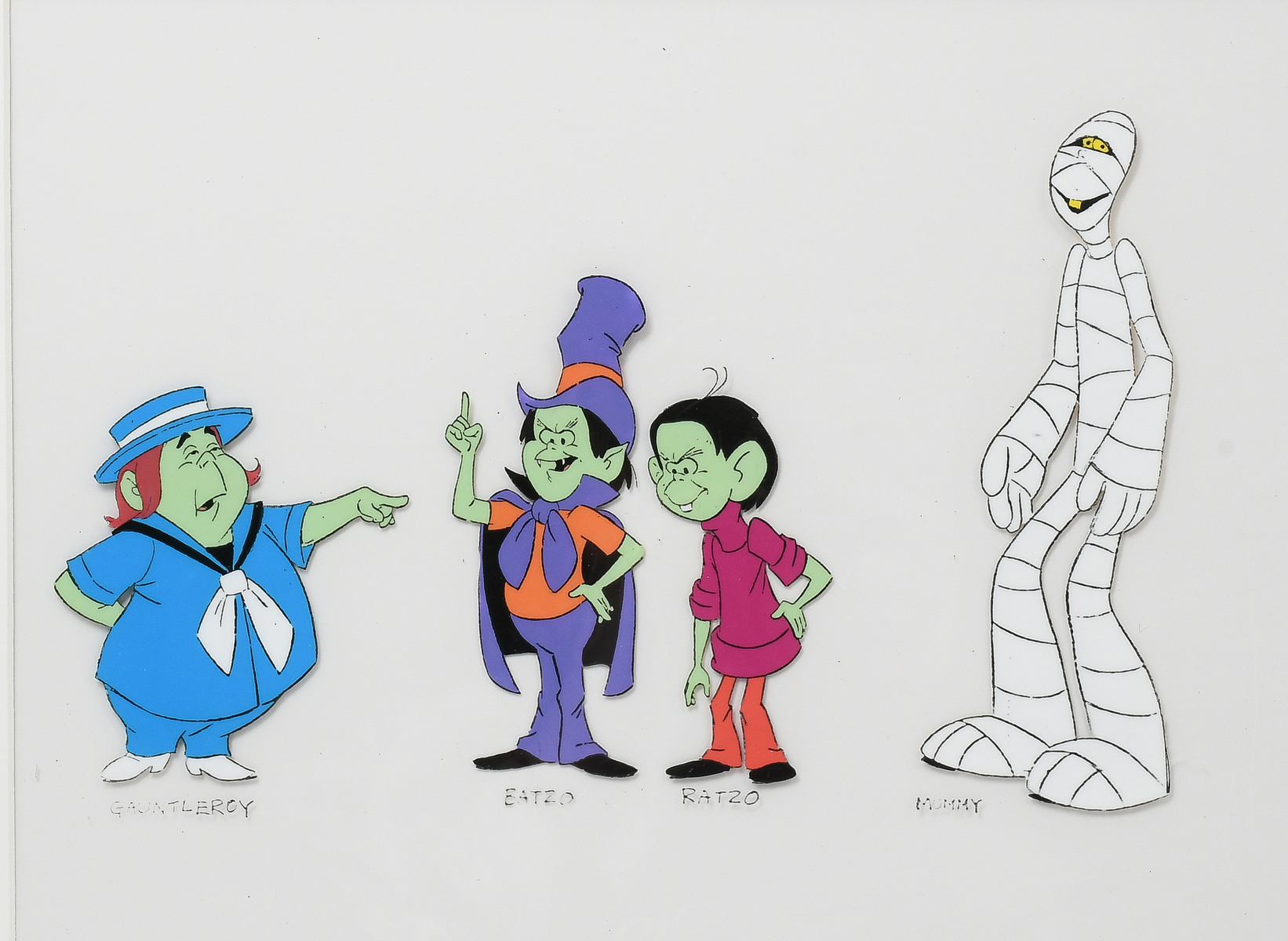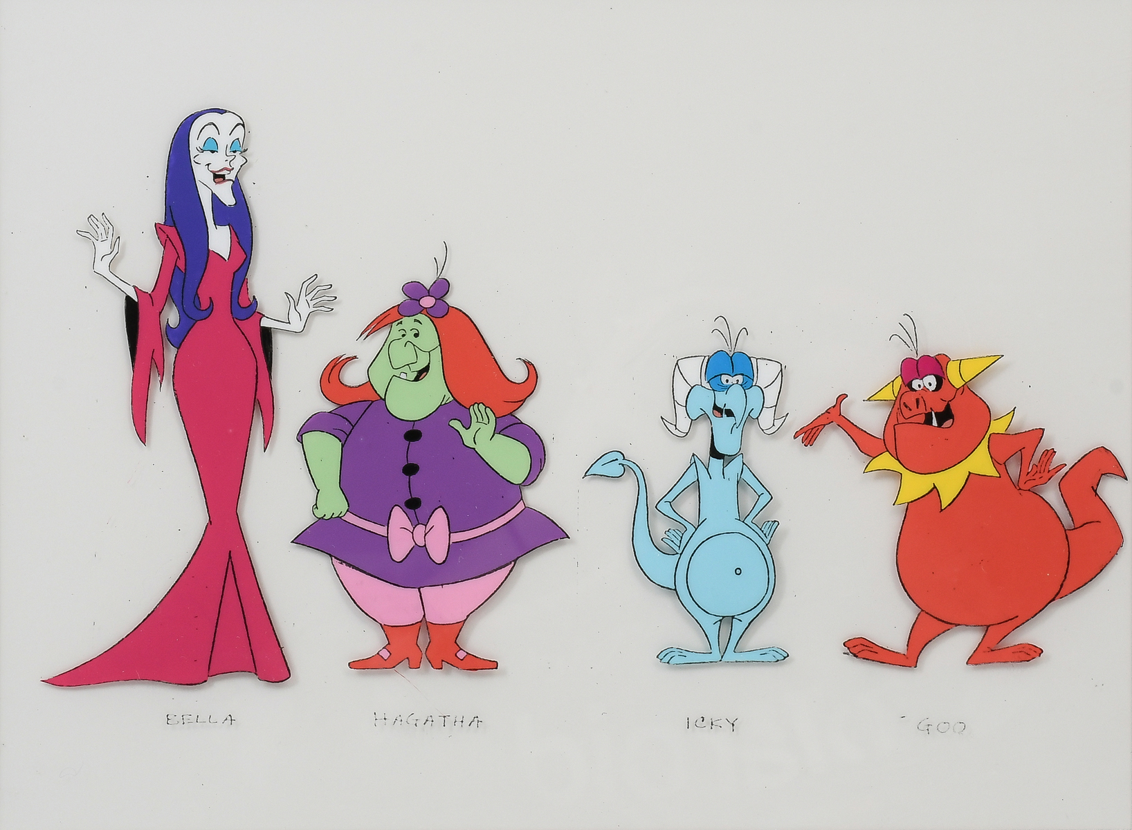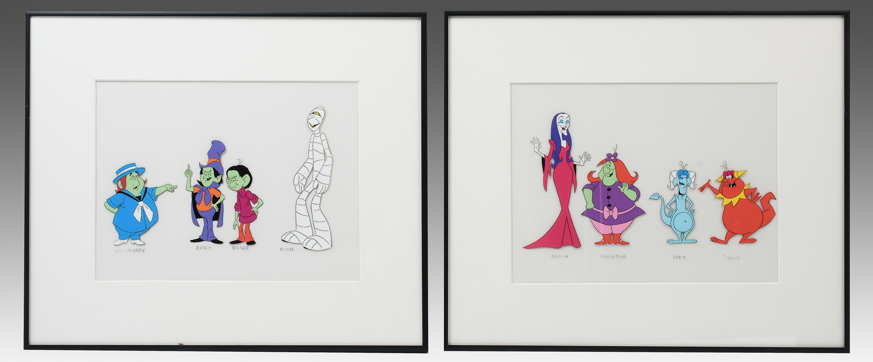TWO ANIMATION CELS FROM GROOVY GHOULIES: 1) Depicts four characters including Hauntleroy, Ratso, Batso, and Mummy, sight size 8.75'' x 12'', framed, 15.25'' x 18.25''; 2) Bella, Hagatha, Icky, and Goo, sight size 8.75'' x 12'', framed, 15.25'' x 18.25''.