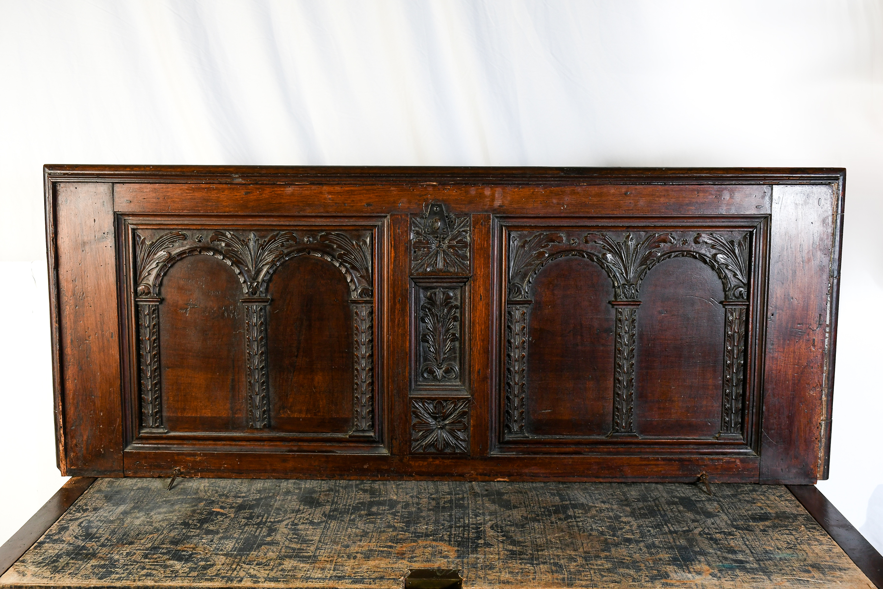 CARVED 18TH CENTURY ITALIAN COFFER: Having an overall foliate arch motif. Hand-forged hinges. Lid opens to reveal a bench with attached silk. Bench lifts to reveal the storage area. Raised on carved paw feet. Approx. 27.25'' h x 56.5'' w x 22.5'' d.