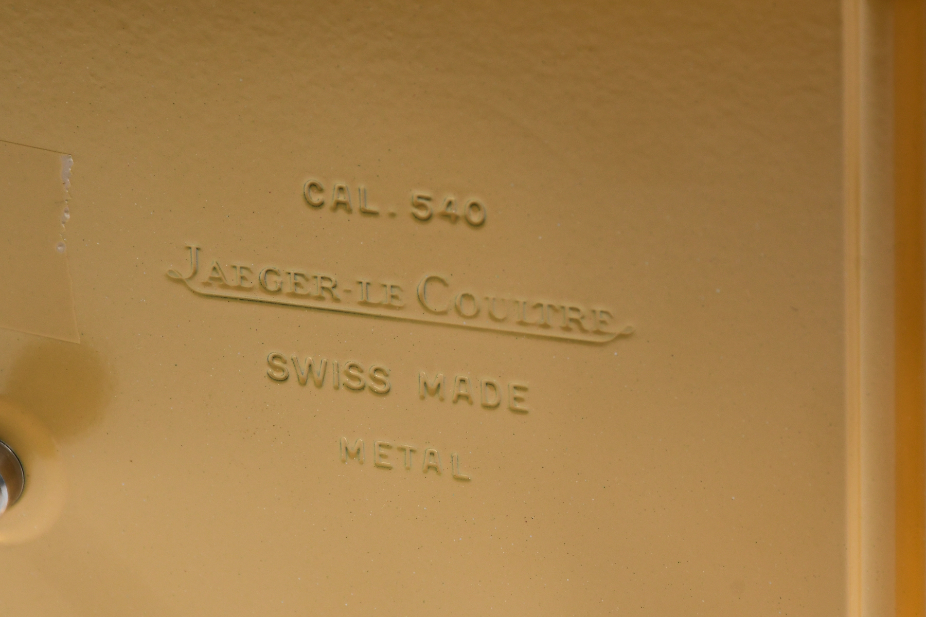 JAEGER LE COULTRE ATMOS CLOCK: A glass encased perpetual motion Jaeger-LeCoultre Atmos clock within gilt brass frame, Caliber 540. 13 jewels, Swiss-made with a square dial, serial no. 669253. The front glass panel may be removed to access movement inside. Approx. 9'' h x 8'' w x 6'' d.