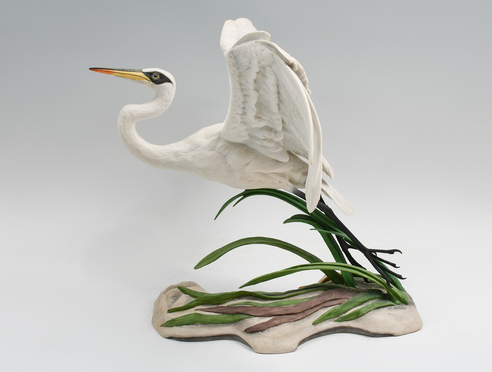 BOEHM GREAT EGRET: Boehm porcelain figure of ''The Great Egret''. A limited edition, no. 38. An impressive depiction of a great white egret alighting from a sandy marsh floor with green reeds. Signed at base edge and stamped underneath, with a hand signature of Mrs. Helen F. Boehm. Approx. 12.5'' h x 17'' w x 12'' d.