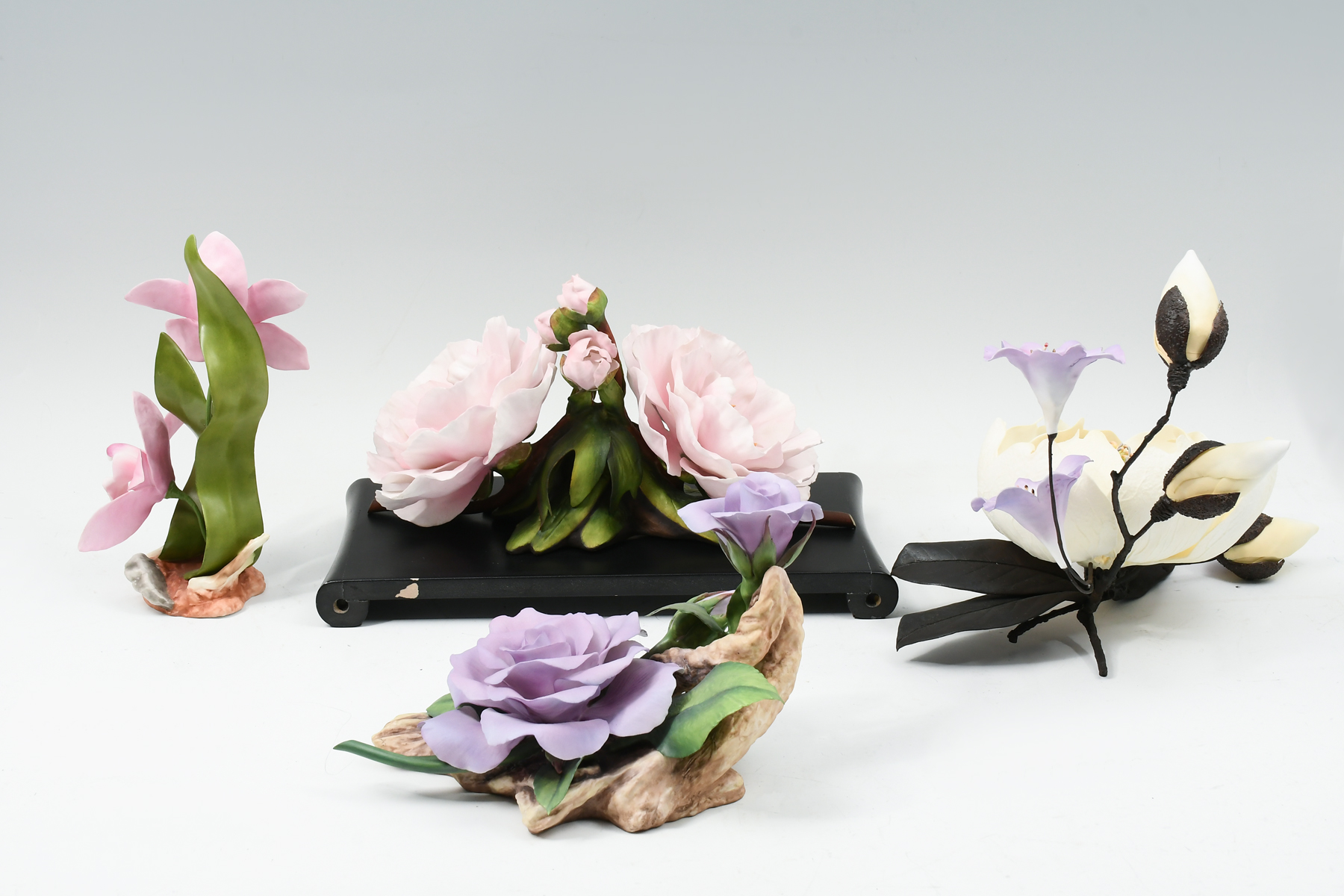4-PIECE BOEHM PORCELAIN FLOWERS: A four-piece collection of masterfully crafted Boehm porcelain flowers to include ''Pink Orchid'', 1982 ''Blue Nile Rose'' no. 74 of a limited edition, ''Magnolia Grandiflora Rhododendron'' porcelain & bronze sculpture, and 1980 ''Tree Peony'' no. 265 of a limited edition resting upon custom base. The largest, ''Tree Peony'' on its stand measures approx. 8'' h x 13'' w x 6'' d.