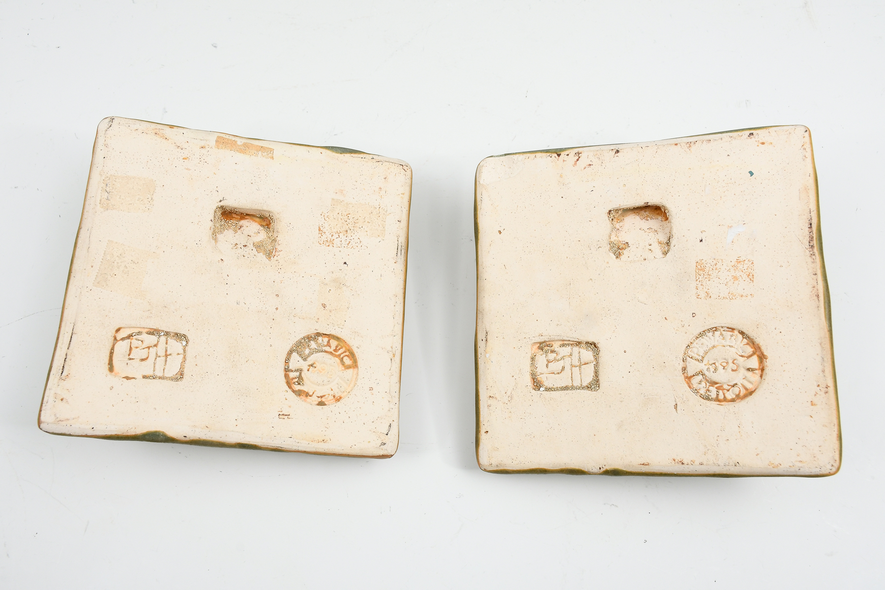 PAIR PEWABIC POTTERY TILES ''COMEDY & TRAGEDY'': Made in Detroit, designed by architect E. Sharinen. Impressed marks at the reverse. Approx. 6.25'' h x 6.25'' w x 2.5'' d.